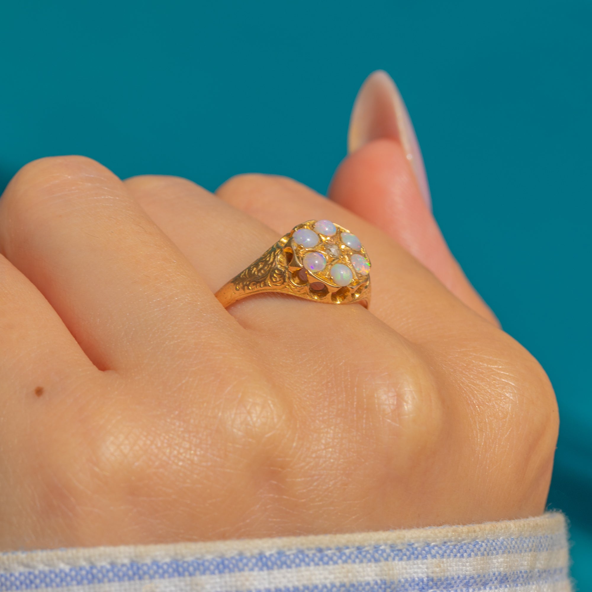An outstanding Victorian cluster ring, flaunting six iridescent lilac Opals projecting a kaleidoscope of orange and green hues as they catch the light.