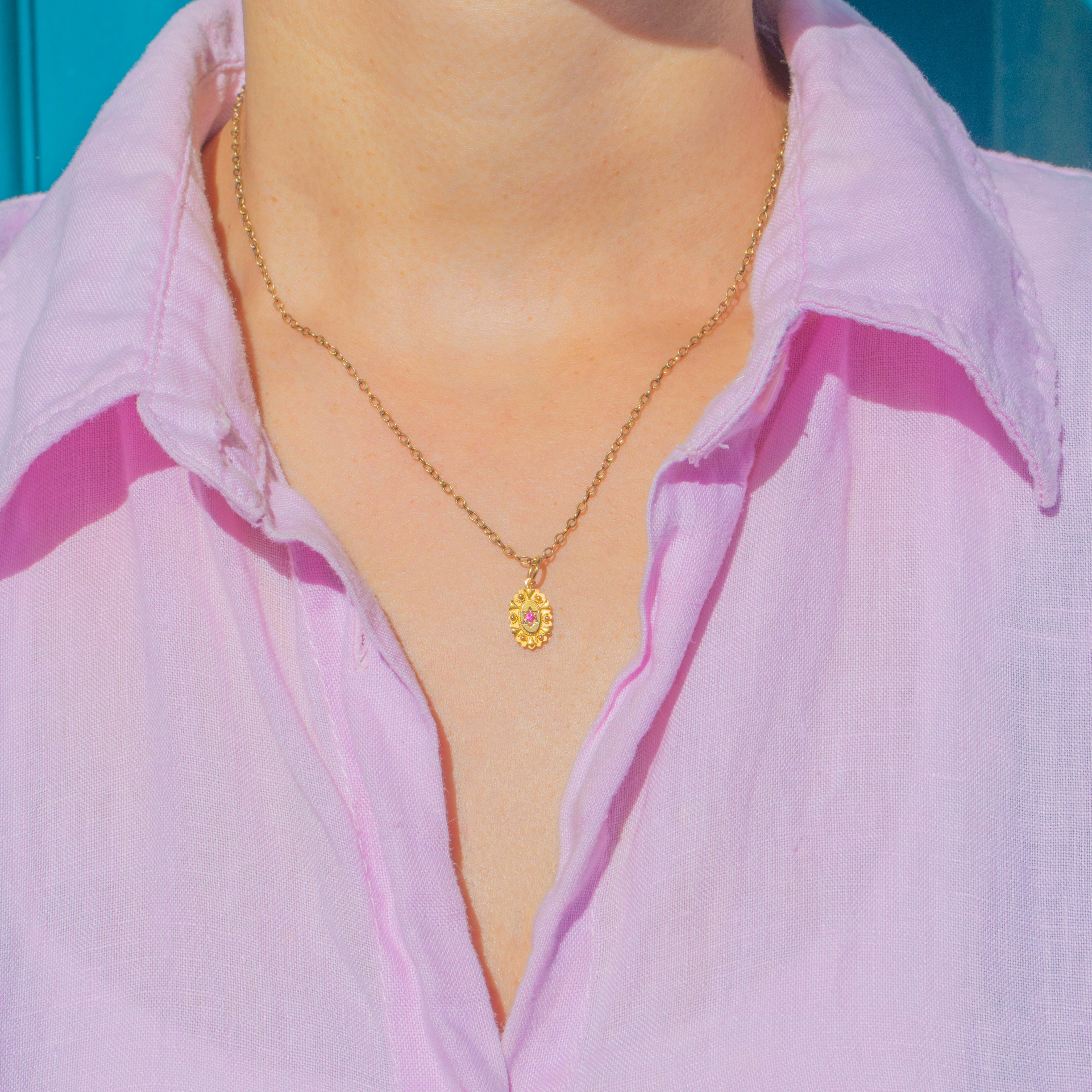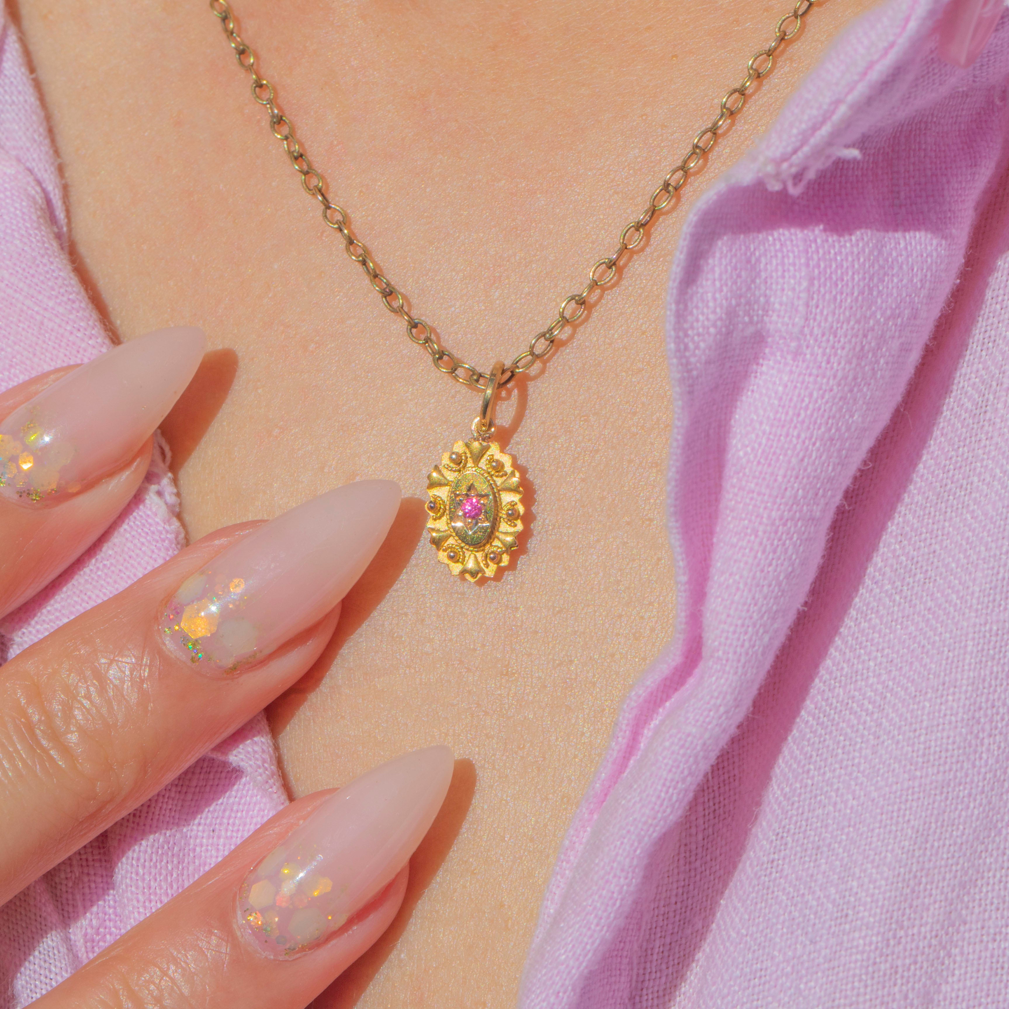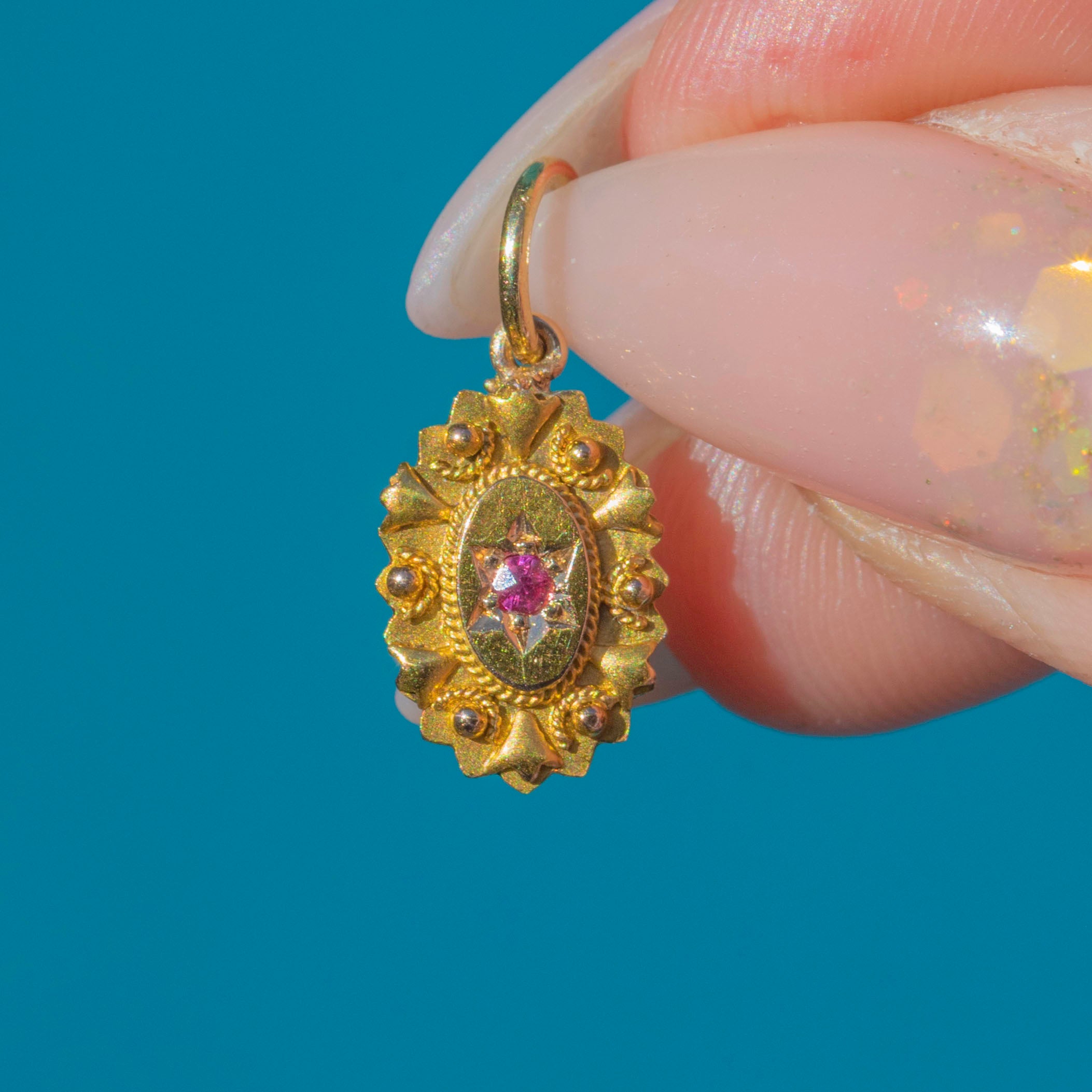 This antique Victorian charm is crafted in solid 15ct Gold, (not gilded or vermeille!) with beautiful Etruscan revival details. At its centre sits a vivid, star-set Ruby, adding a flash of colour against the warm Golden tones.