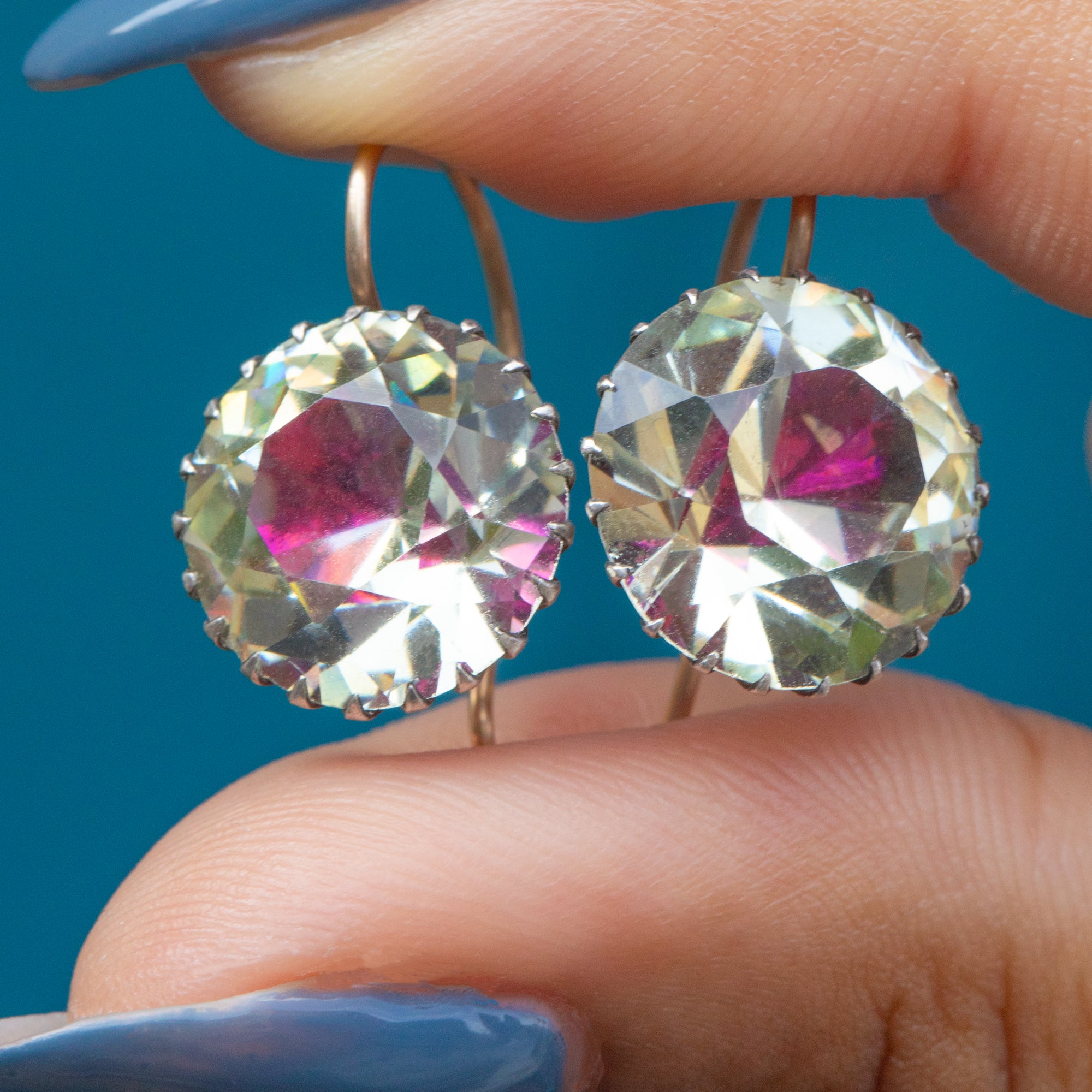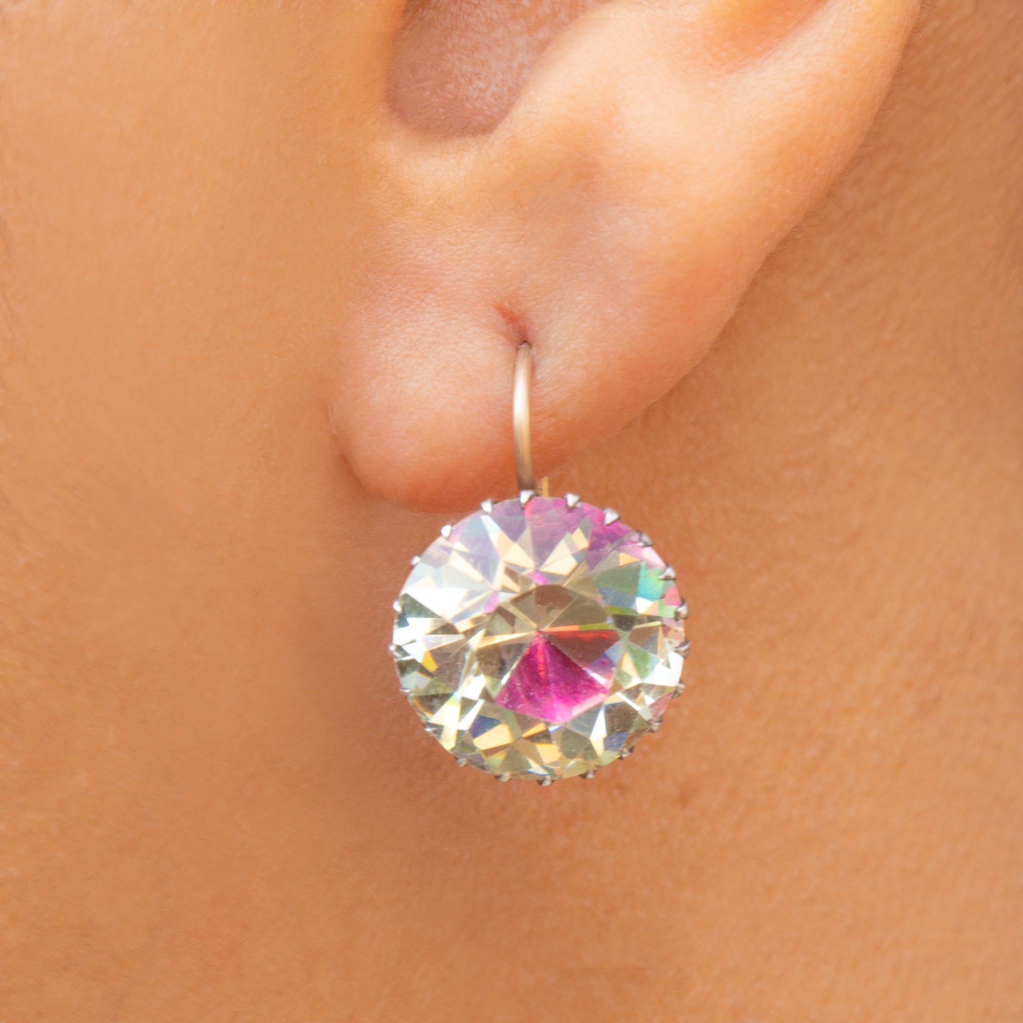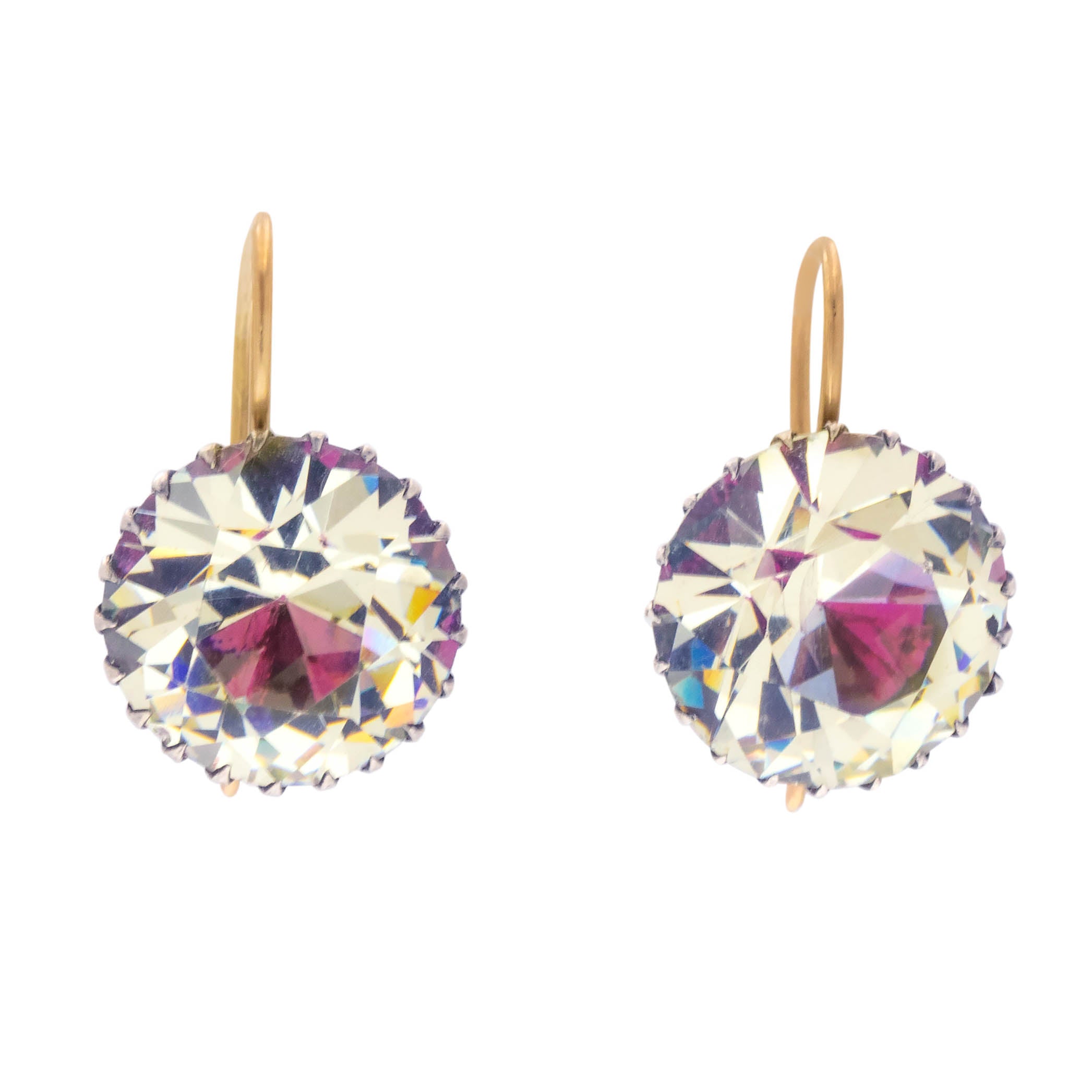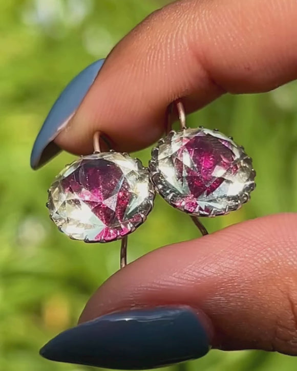 Boucles d'oreilles pendantes anciennes à boutons en pâte rose avec dos argenté, crochets en or 15 carats