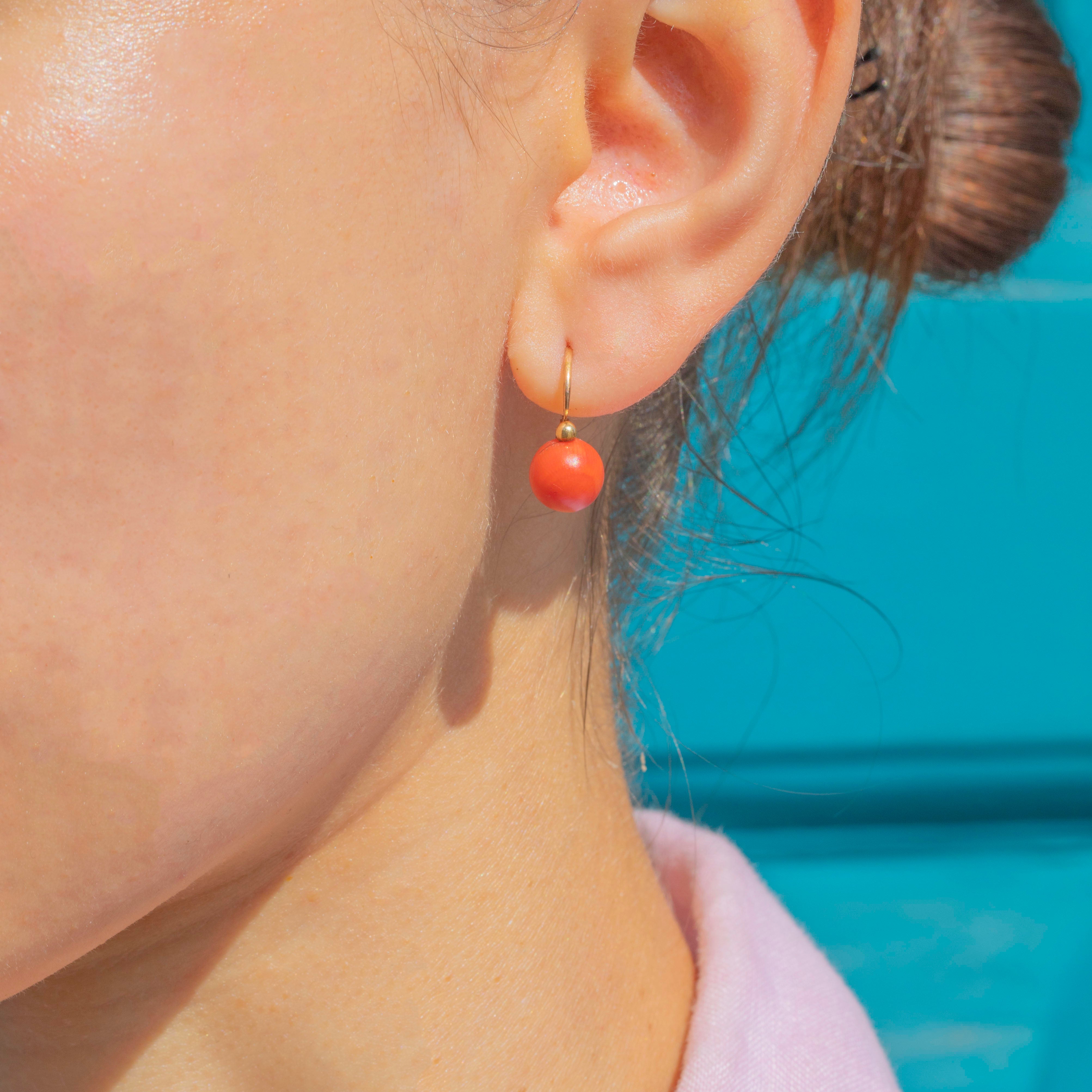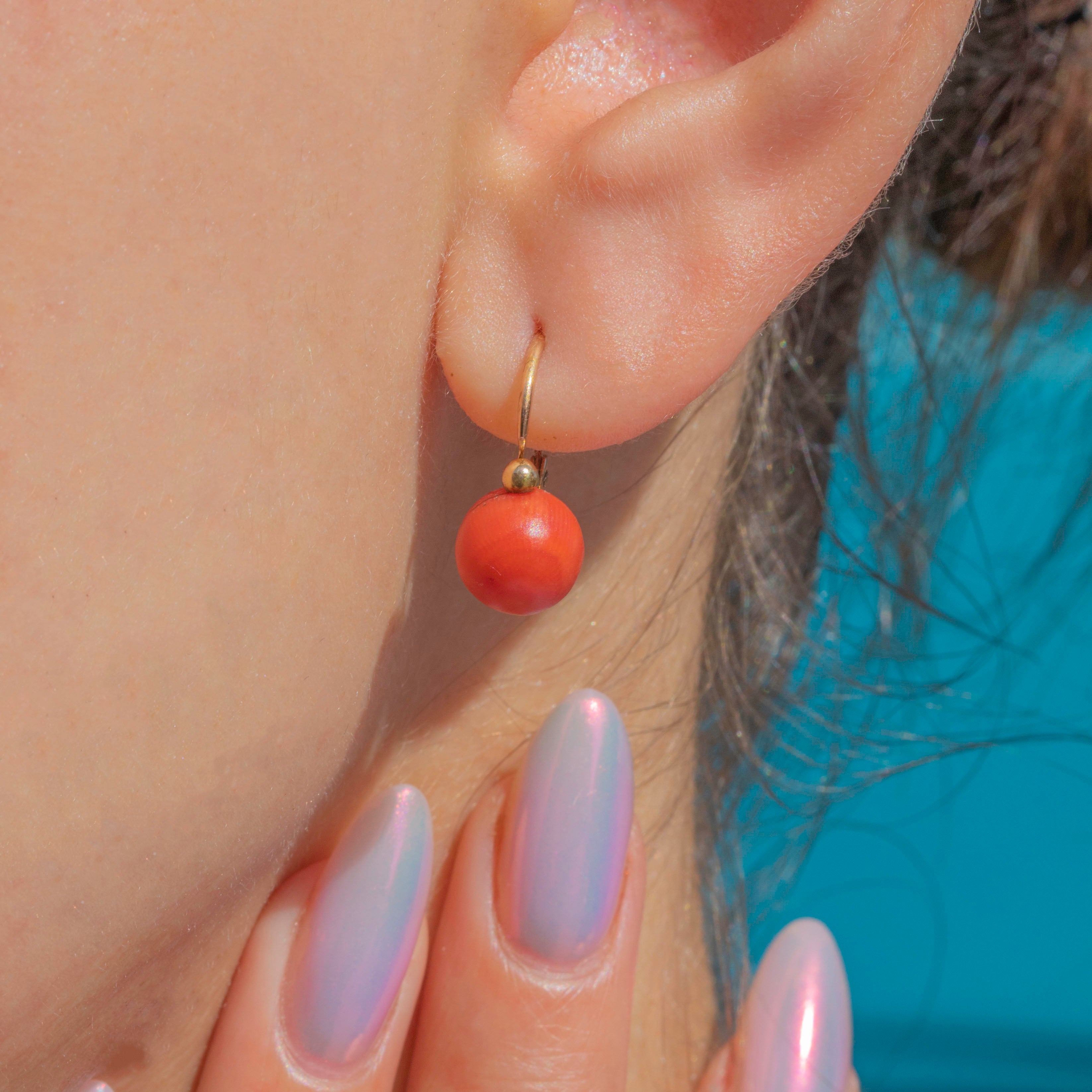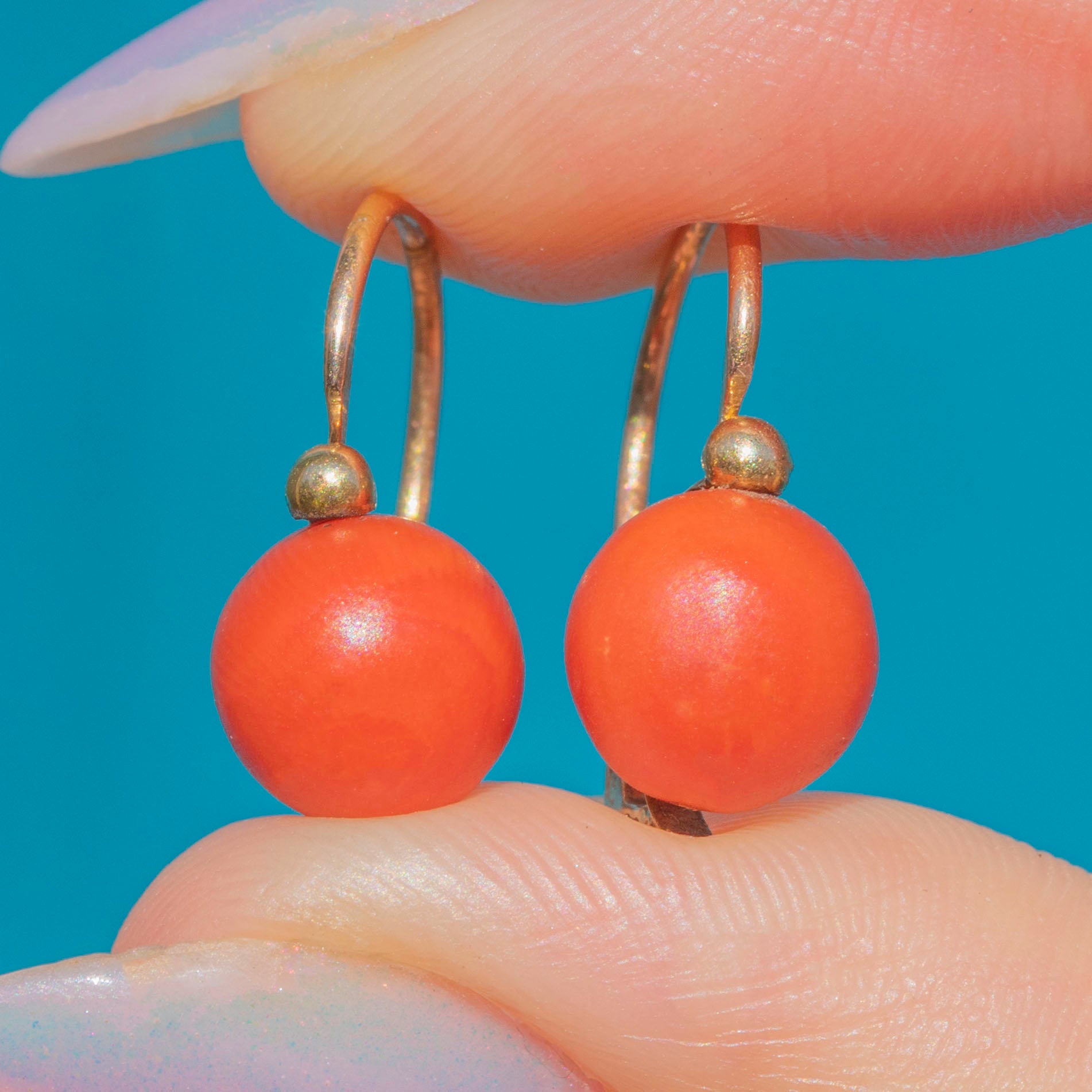 VERY GOOD: These French Coral earrings are in very good antique condition. The Coral orbs are delightfully domed and satisfying to touch. There is a small nick to the surface of one of the Corals, which is only noticeable under close inspection. Complete with 18ct Gold levers, they sit ever so elegantly in the lobe.