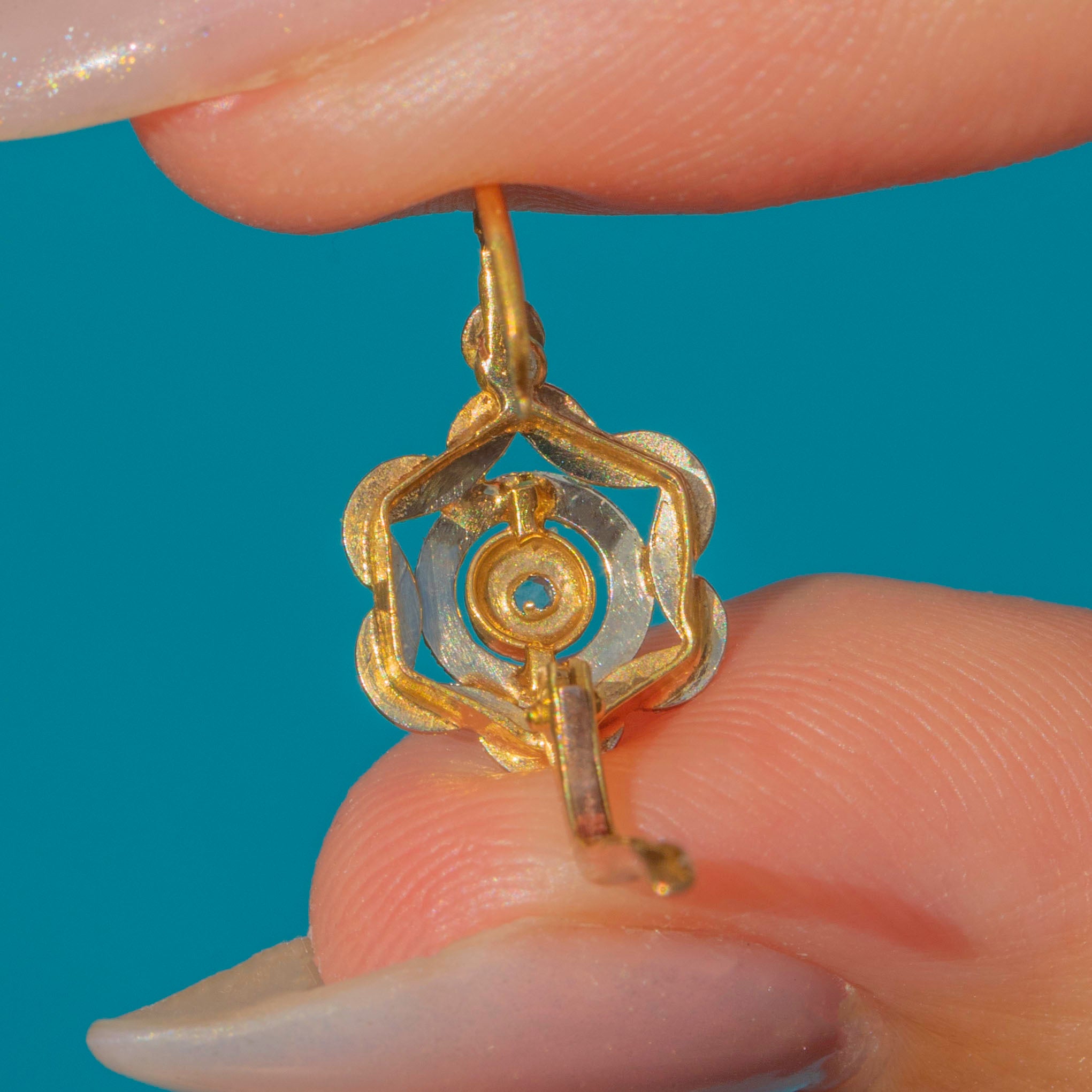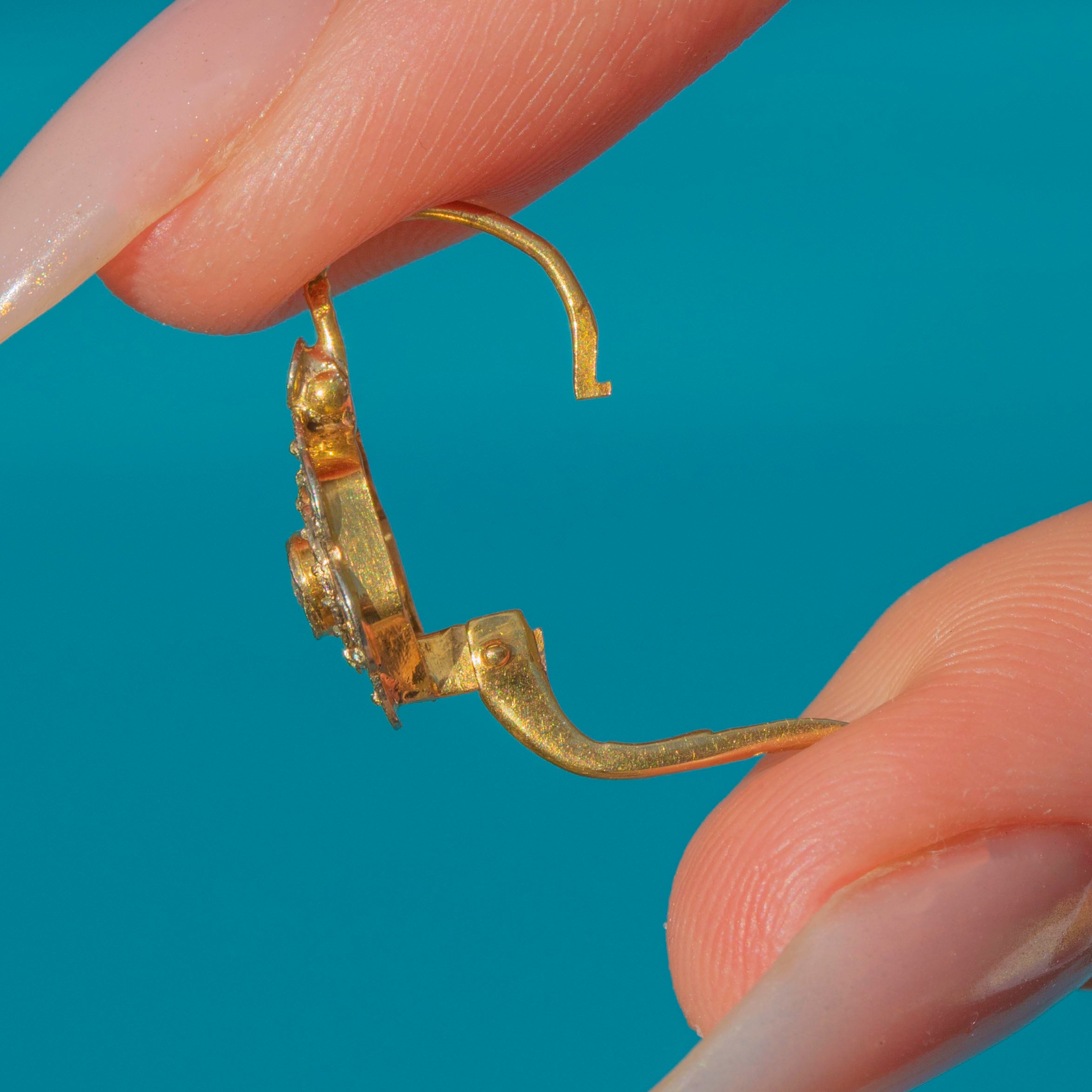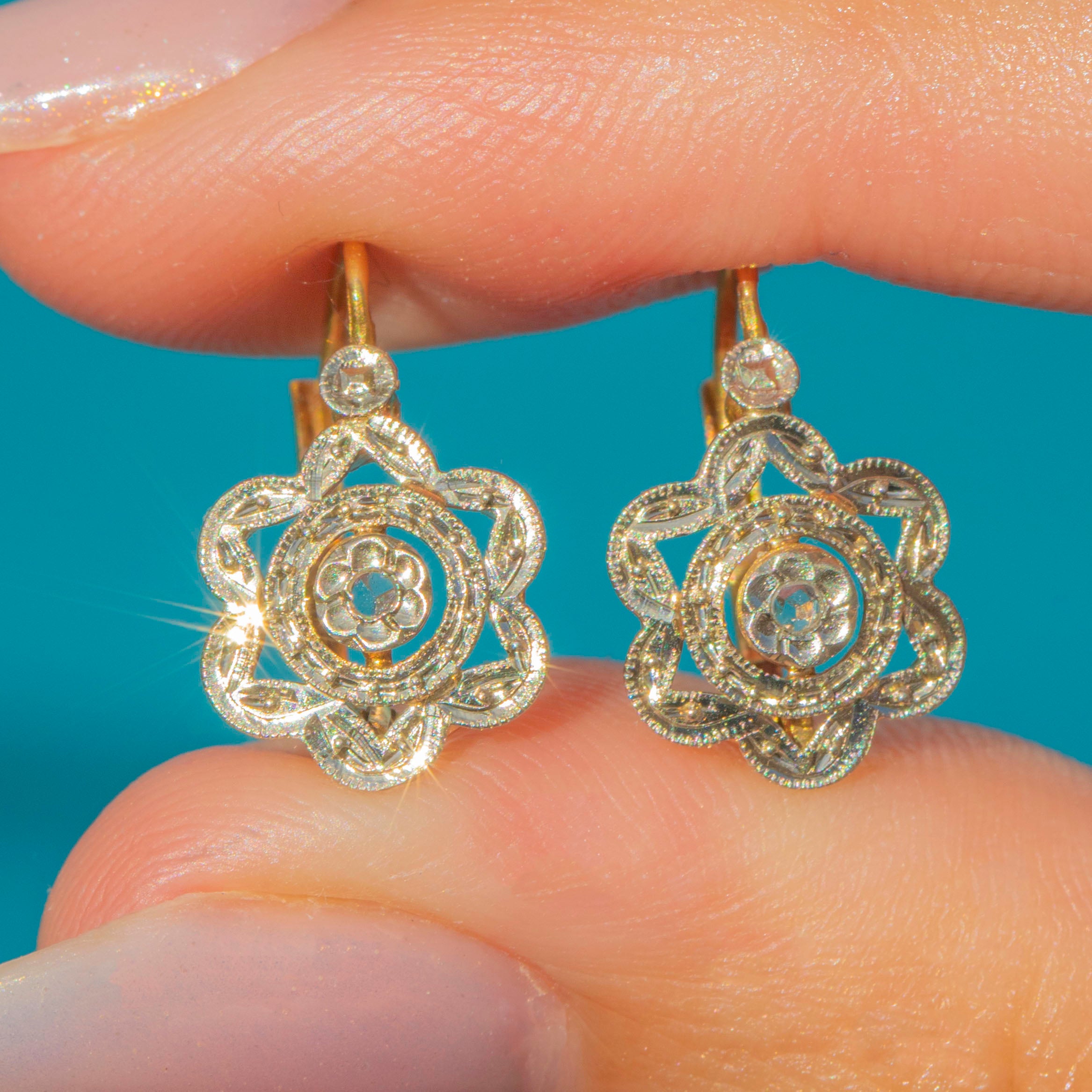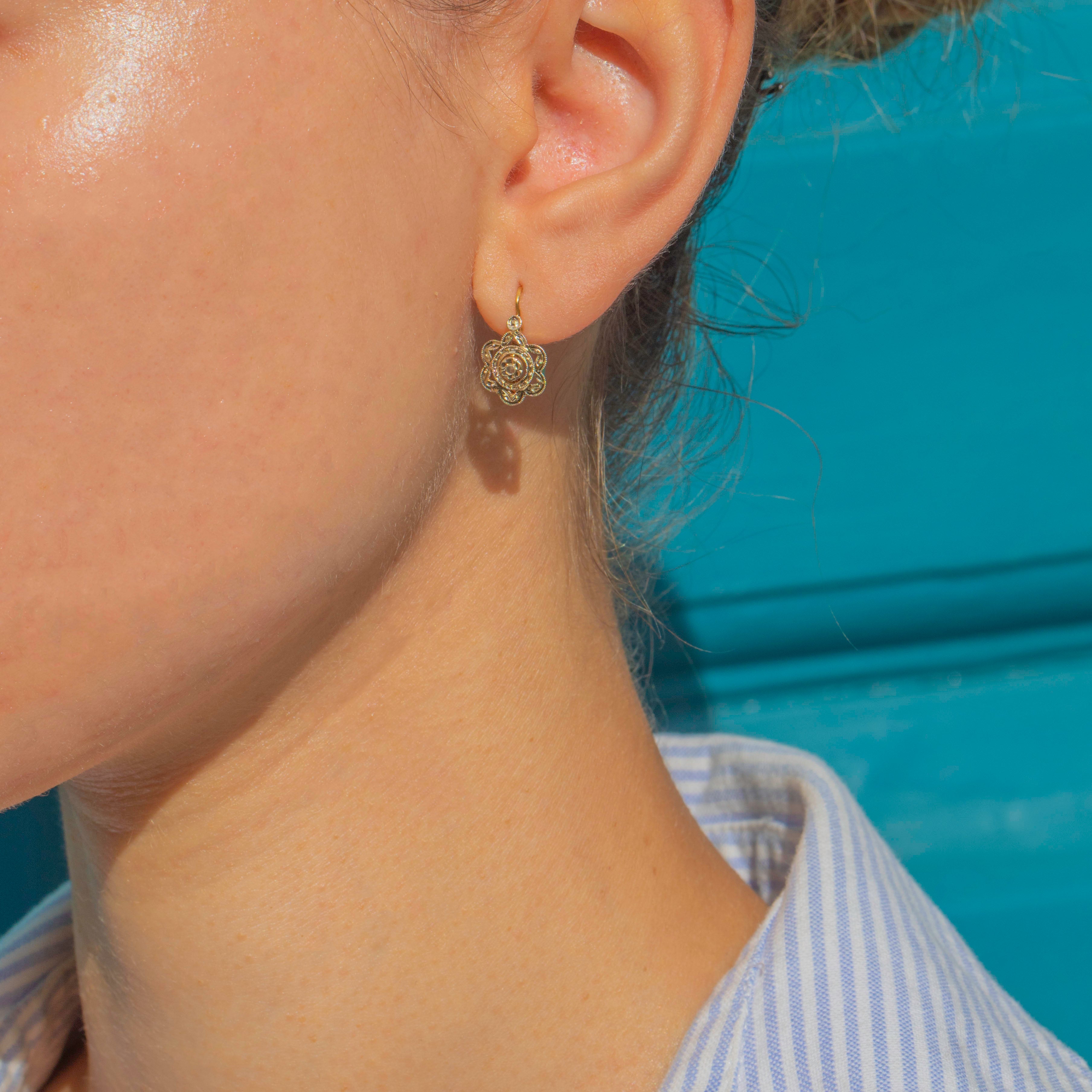 A delicate pair of Antique French dormeuse earrings crafted in 18ct Gold, designed with charming floral motifs. Each earring is centred with a tiny sparkling rose-cut Diamond accent, bringing a subtle touch of brilliance to the design. Lightweight yet refined, their graceful proportions and lever-back fittings make them as comfortable to wear as they are beautiful. A fine example of Edwardian French elegance.