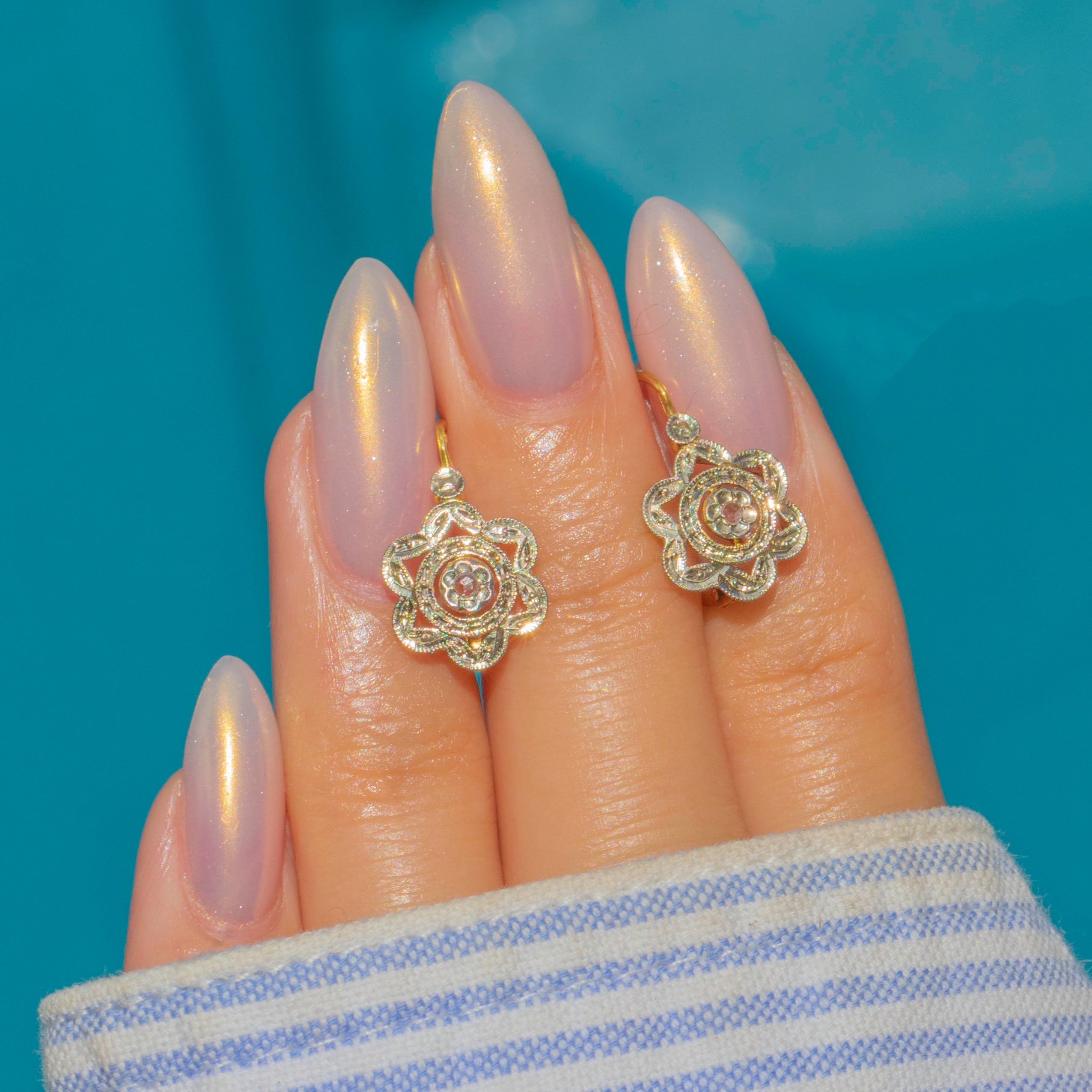 Antique French 18ct Gold Floral Diamond Dormeuse Earrings