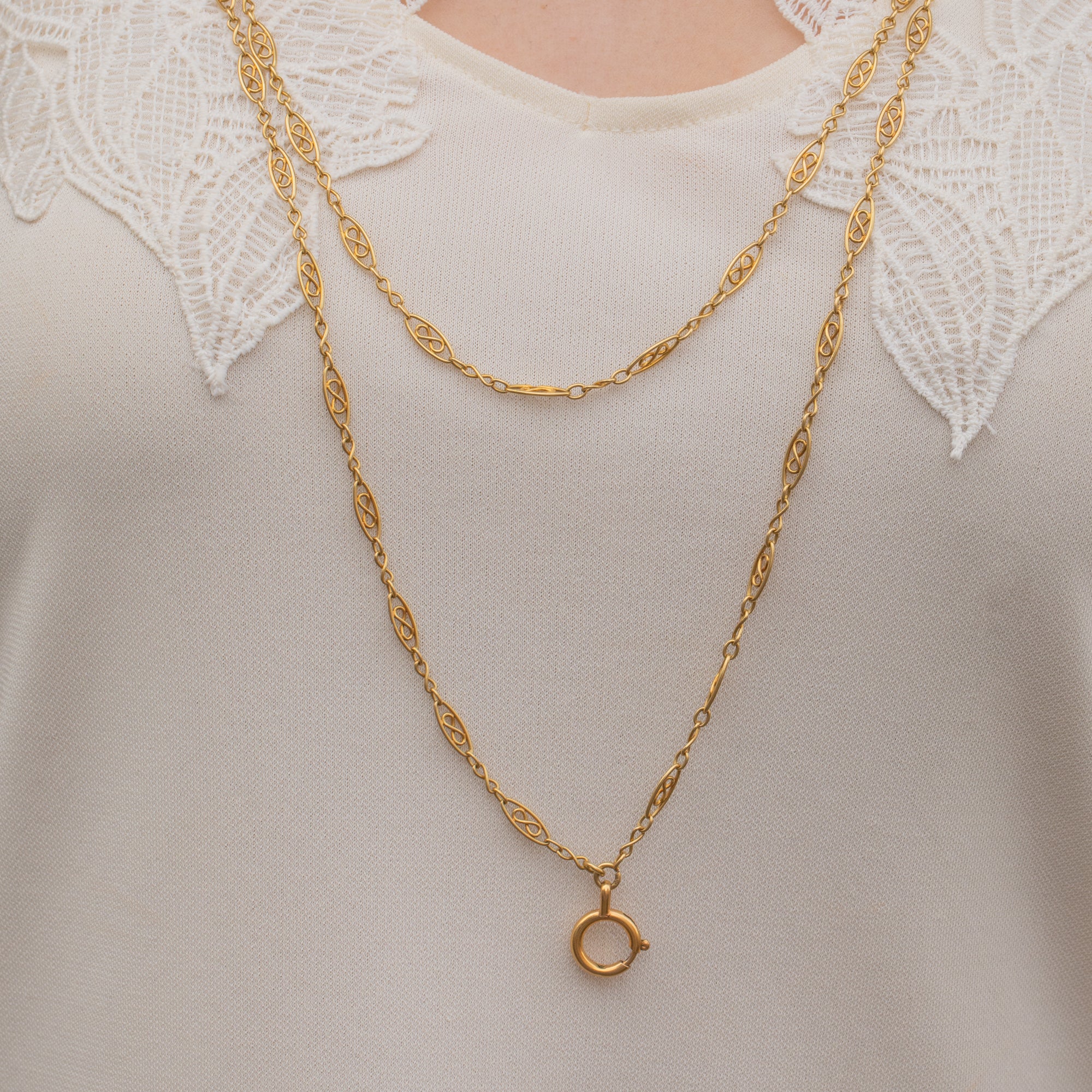 Antique French 18ct Gold Filigree Longuard Chain, 31g- Oversized French Bolt-Ring