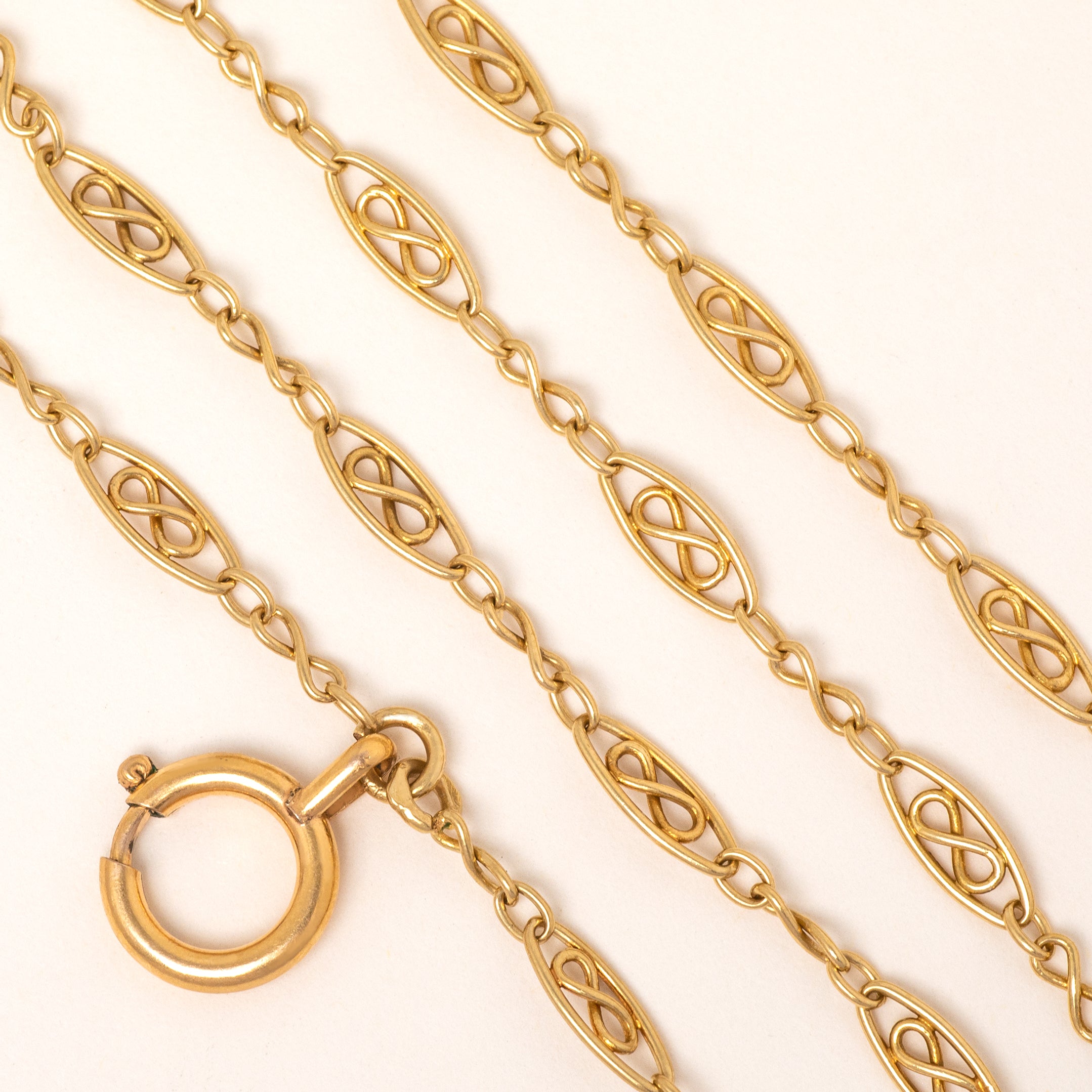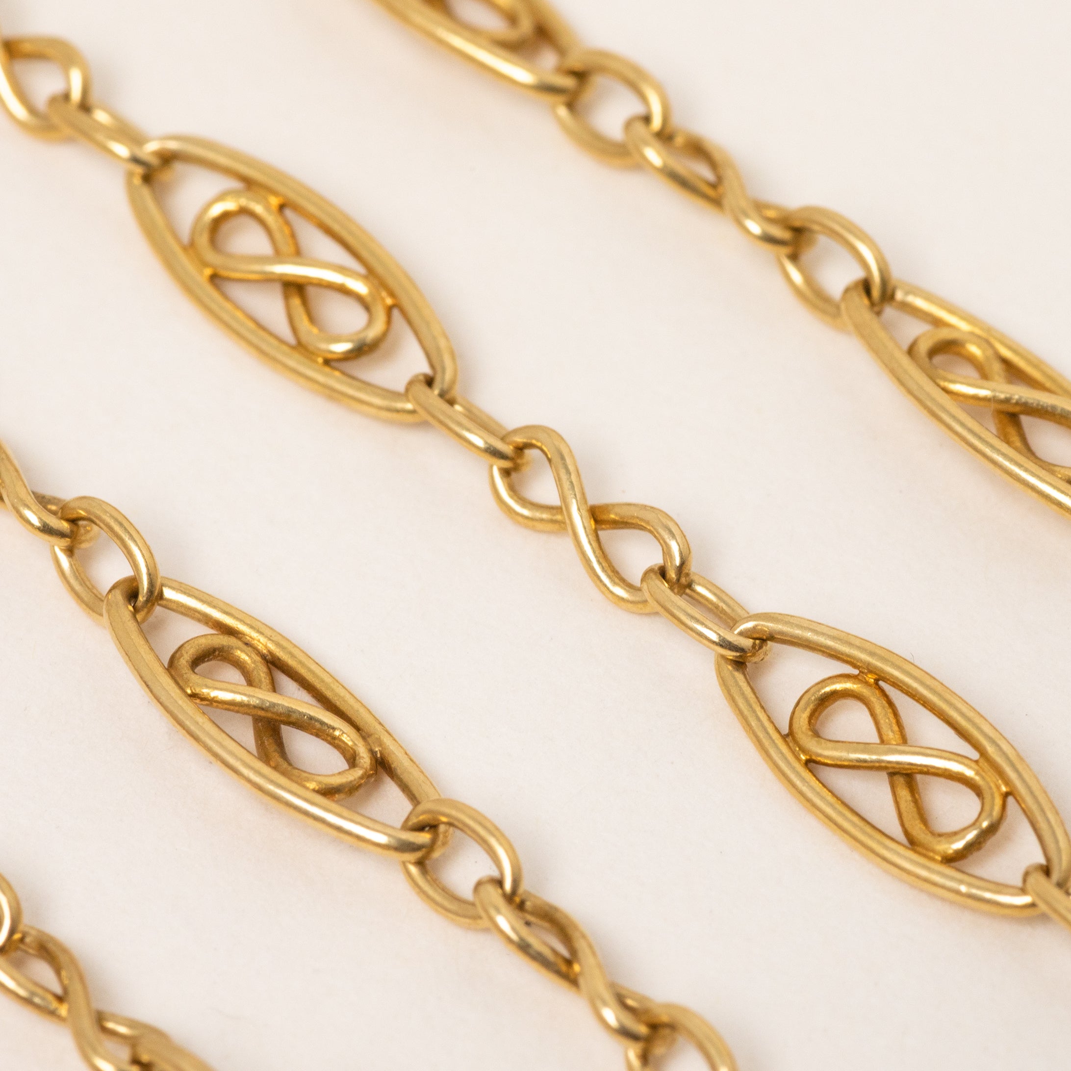 EXCELLENT. This antique French 18ct Gold lozenge longuard chain is in excellent condition! The Gold is brightly saturated and her links are uniform and firmly interlinked. This Gold chain has a lovely fluidity and is easily wrapped around your neck. The bolt-ring is in wonderful working condition, fulfilling all of your charm holding needs. Your heart will flutter from the moment you lay eyes on her!