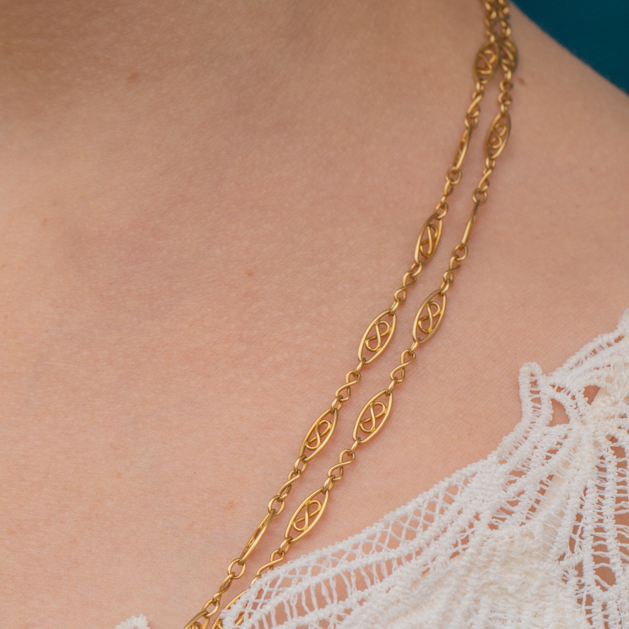 Where to begin with this antique French 18ct Gold lozenge longuard chain?! Her 18ct Gold is rich and saturated throughout, typical of antique jewellery of French origin and is often a defining feature, along with her delicate filigree lozenge links.