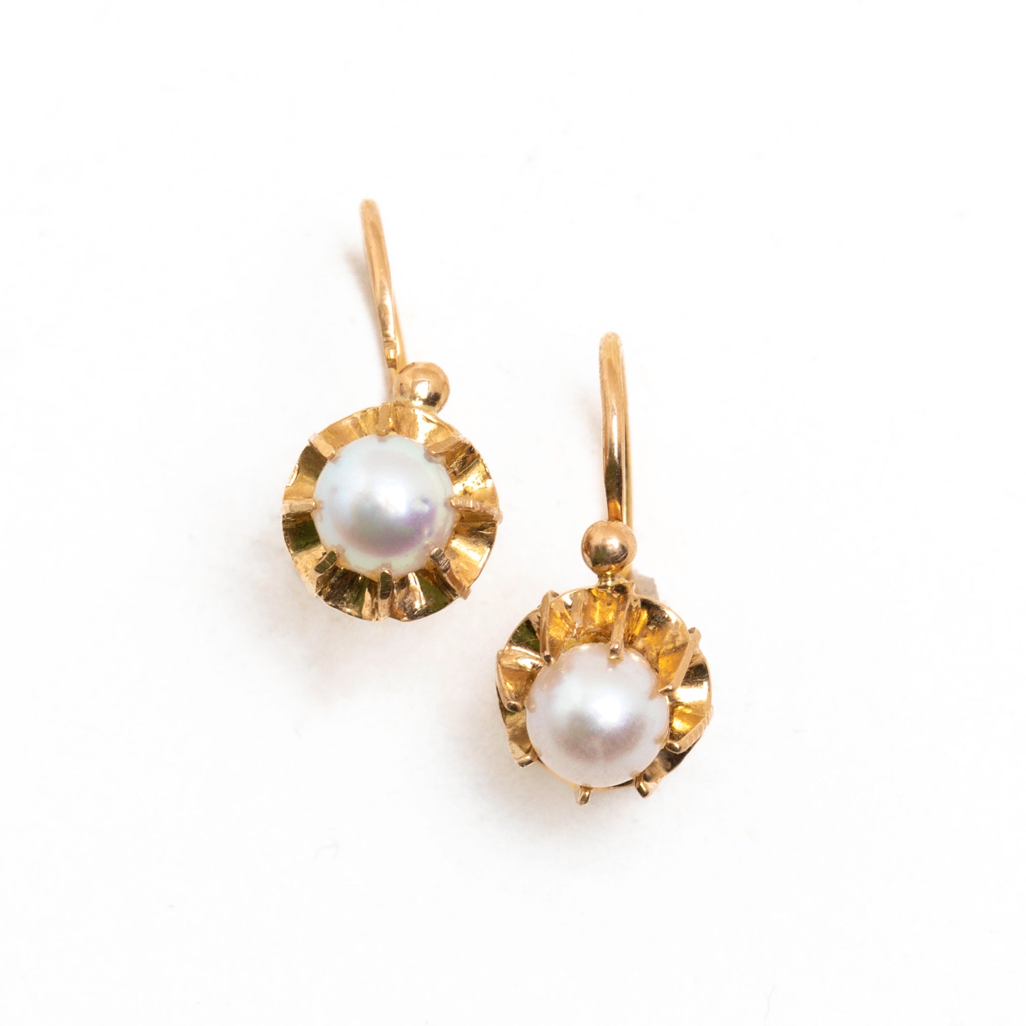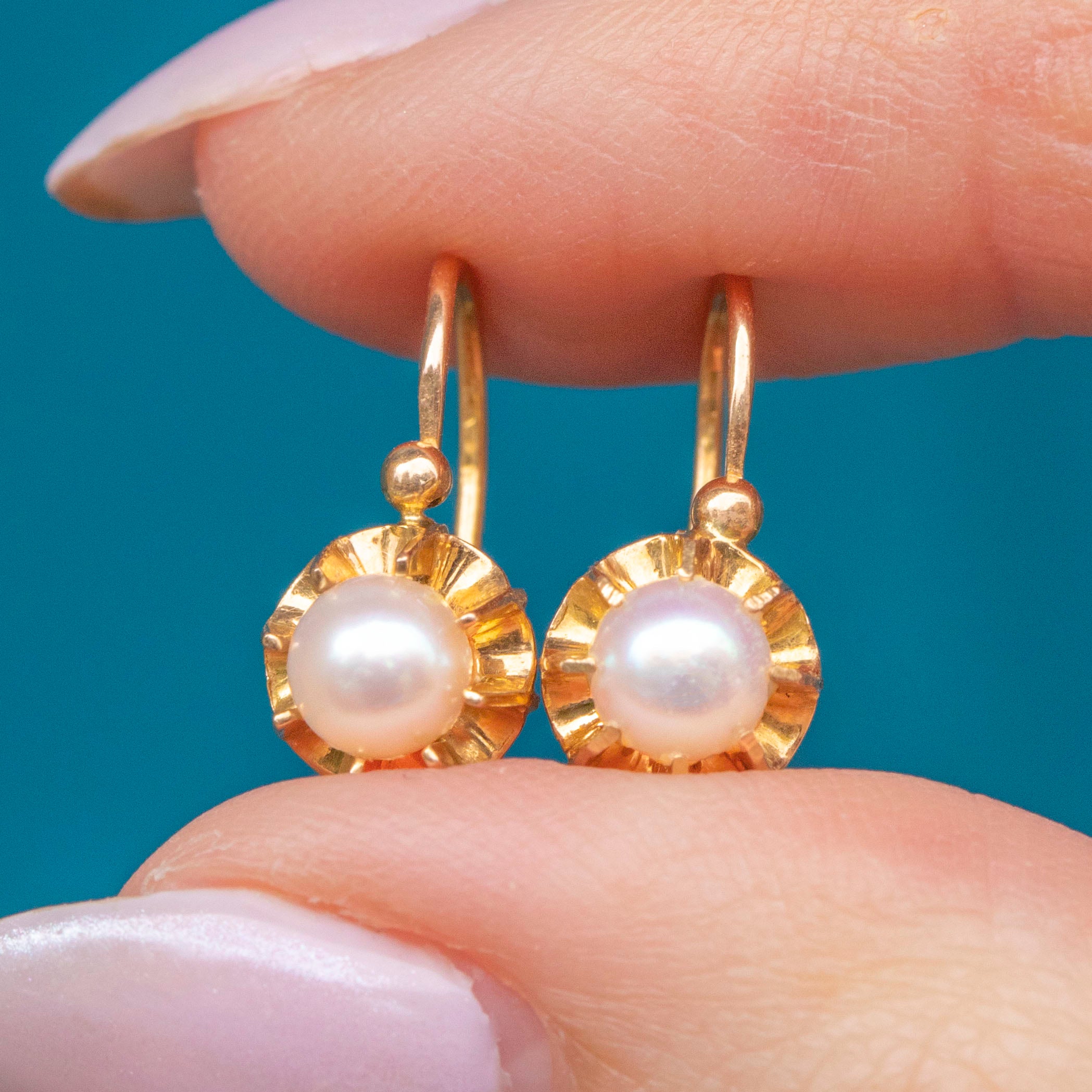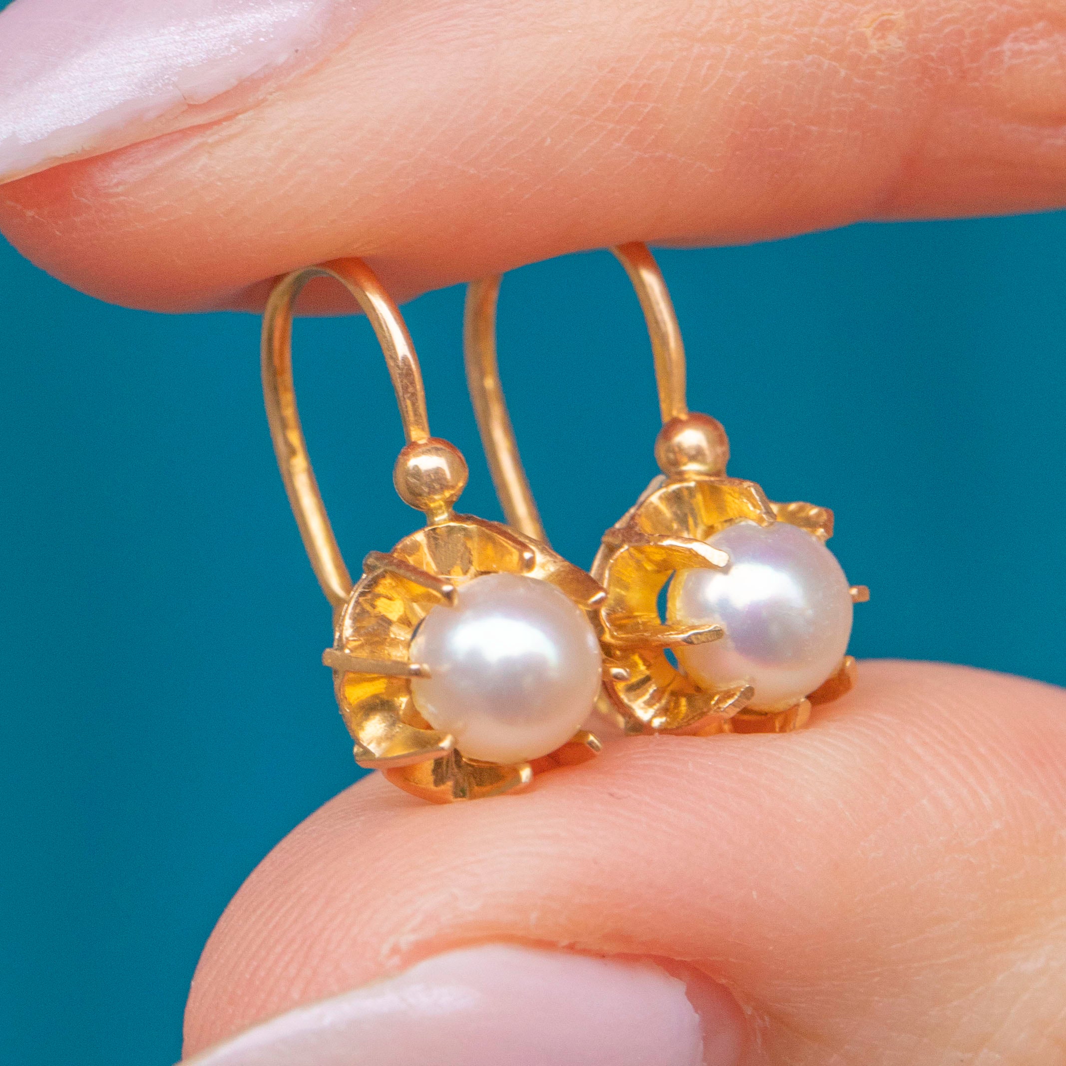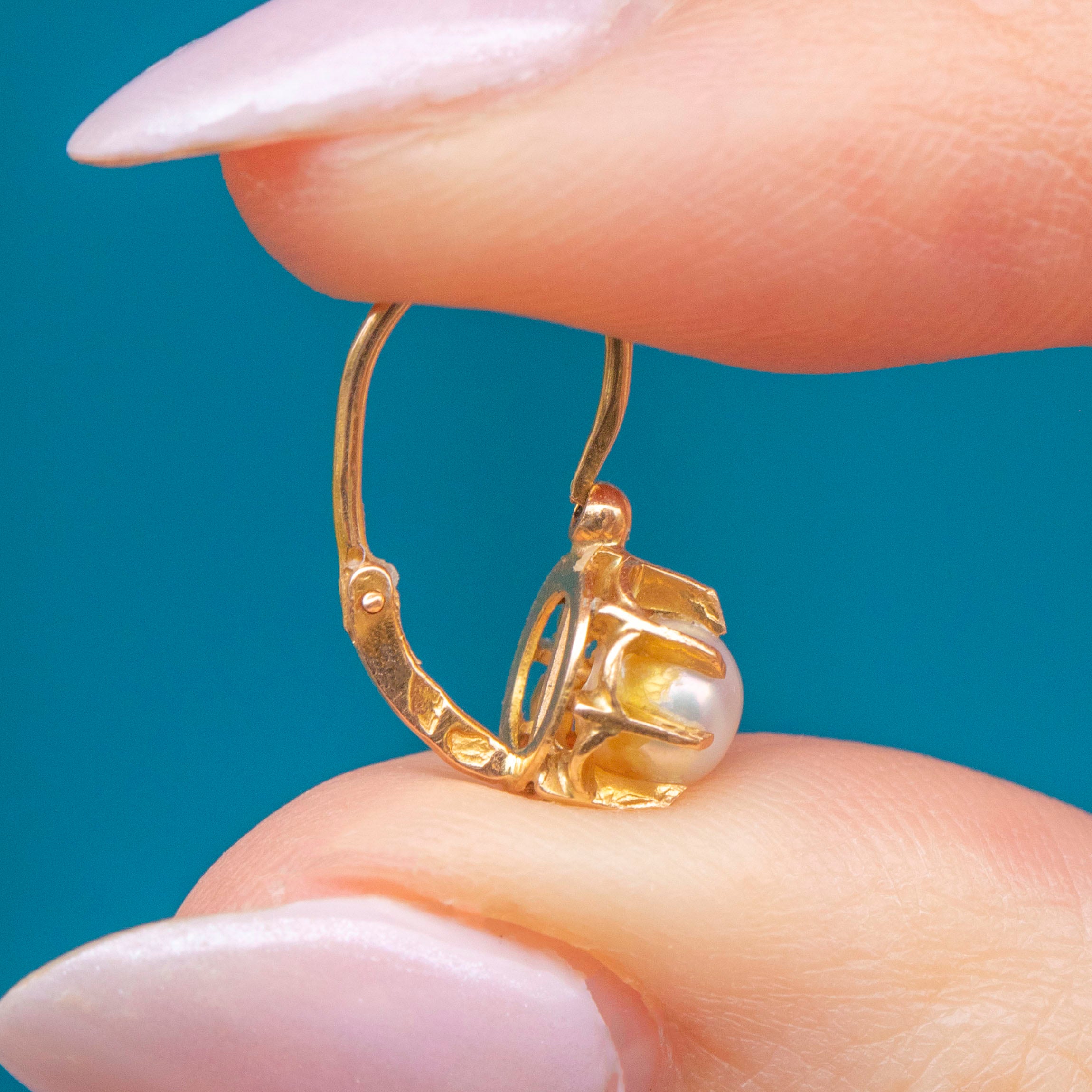 EXCELLENT. These antique French 18ct Gold Pearl dormeuse earrings are in excellent condition! The Pearls are plump, sit securely and offer a lovely soft shimmer. Their buttercup settings are perfectly intact and hold the Pearls securely. The 18ct Gold is rich and buttery throughout, with the structural integrity of them still intact. Please note these earrings are put in from the back of the lobe and once clipped into place, they are secure. We know you'll fall weak at the knees for them just like we have!