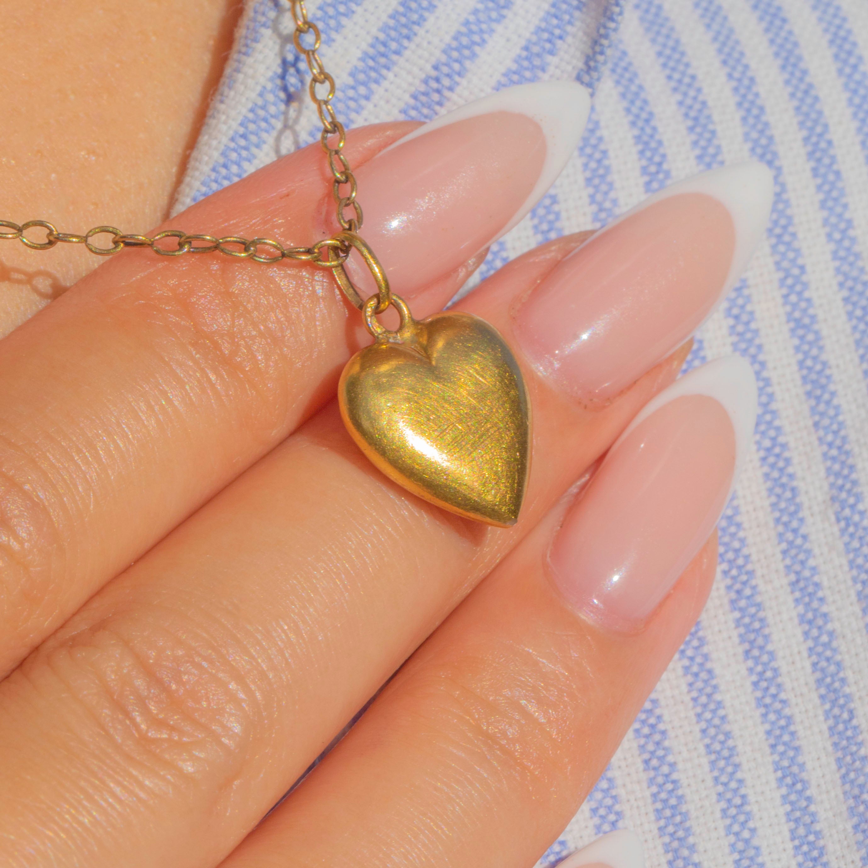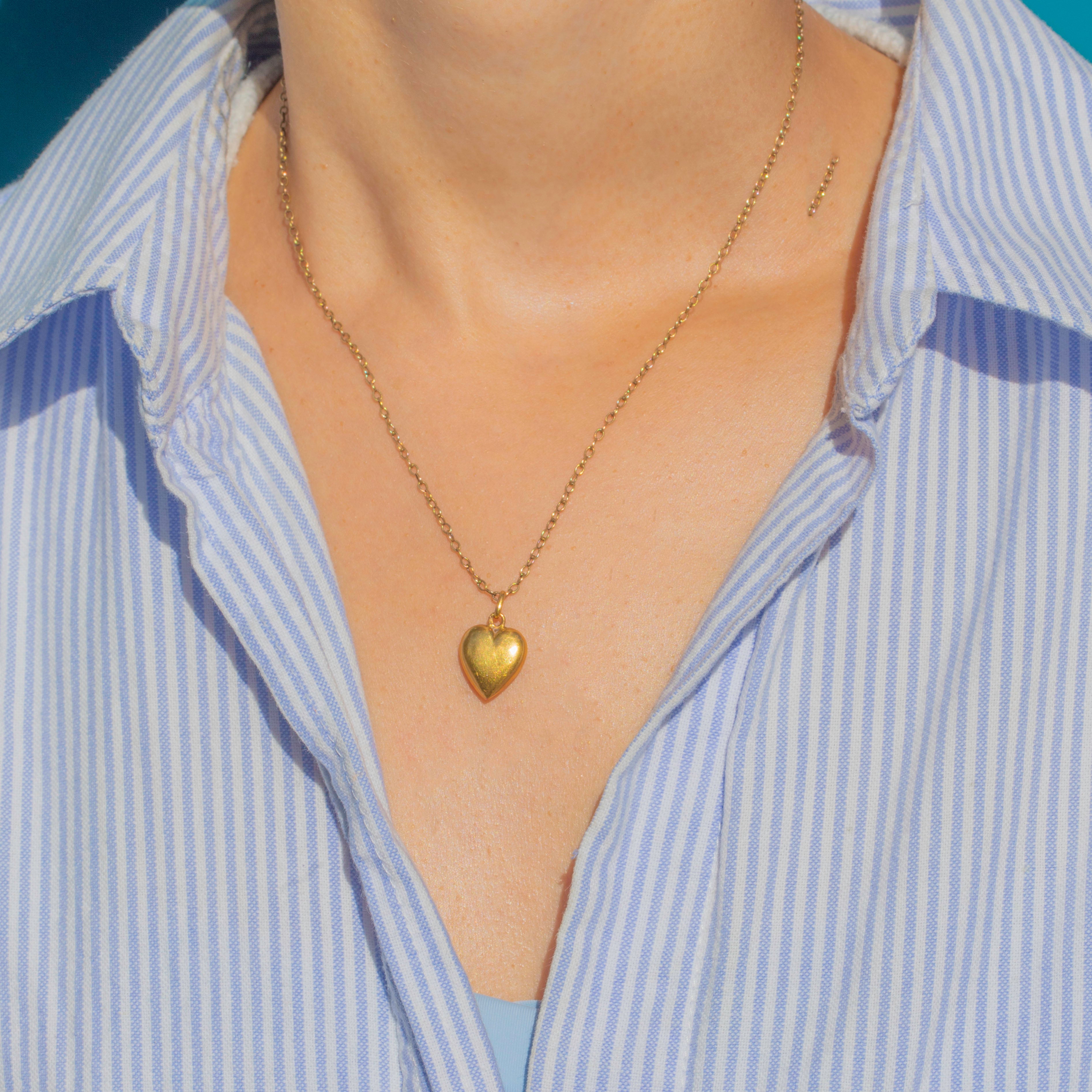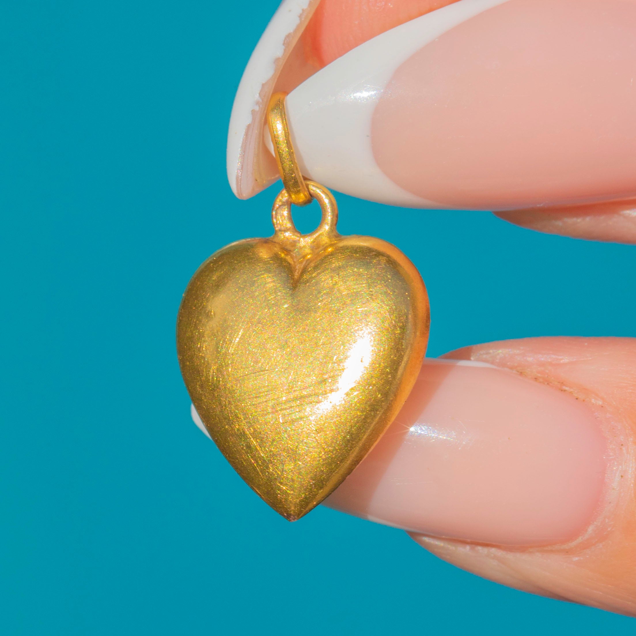 This dainty French Belle Époque heart charm is crafted in glowing 18ct Gold. Subtly puffed and smoothly polished, it has a romantic simplicity that makes it perfect worn alone or layered with other pendants for a personal, sentimental touch.