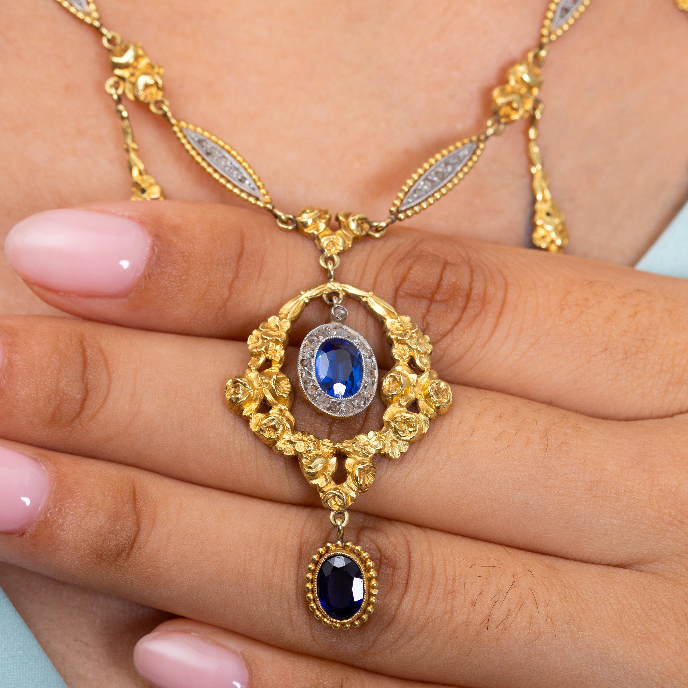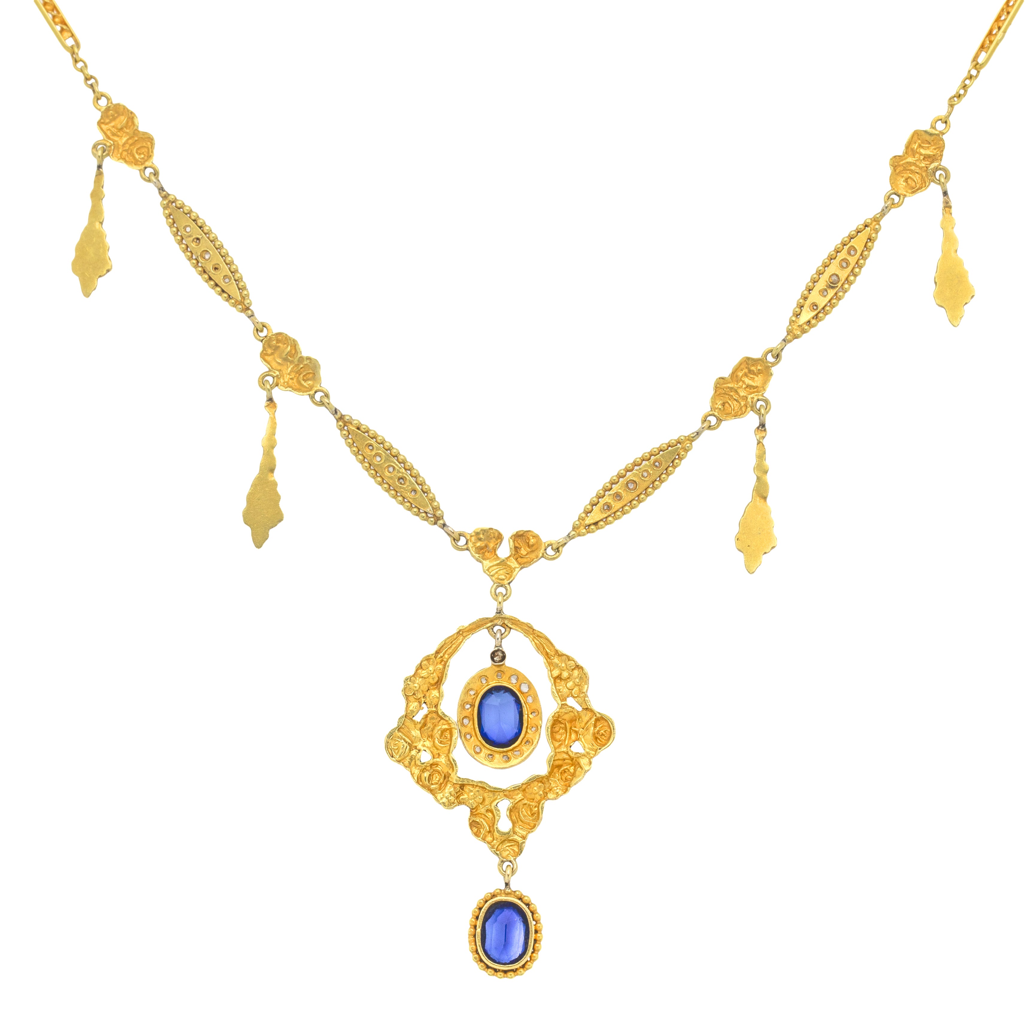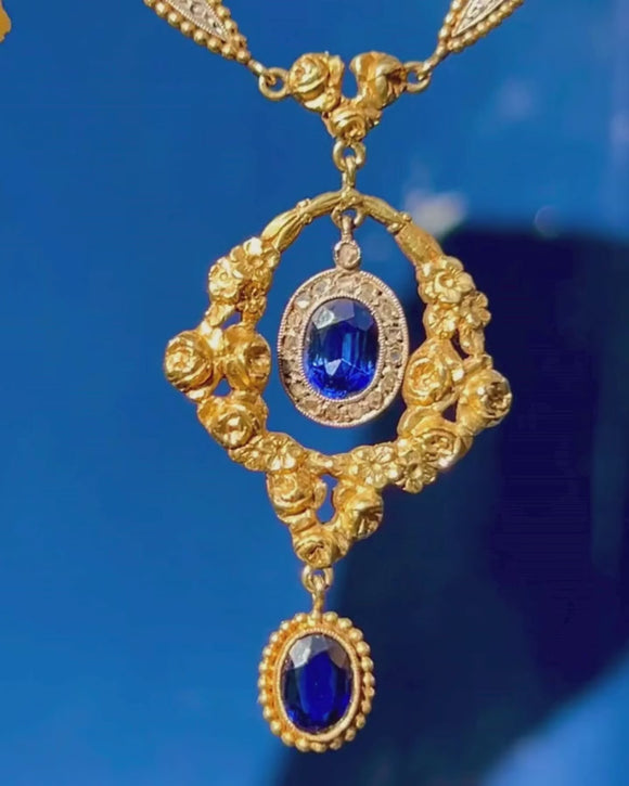 Collier à franges "Roses" en or 18 carats, saphir et diamant, antique français