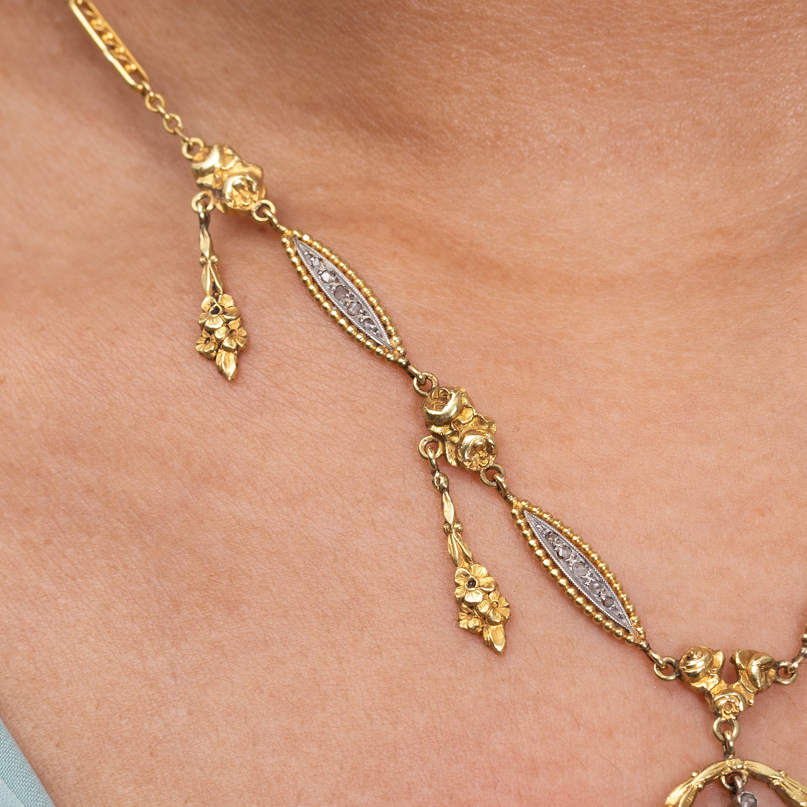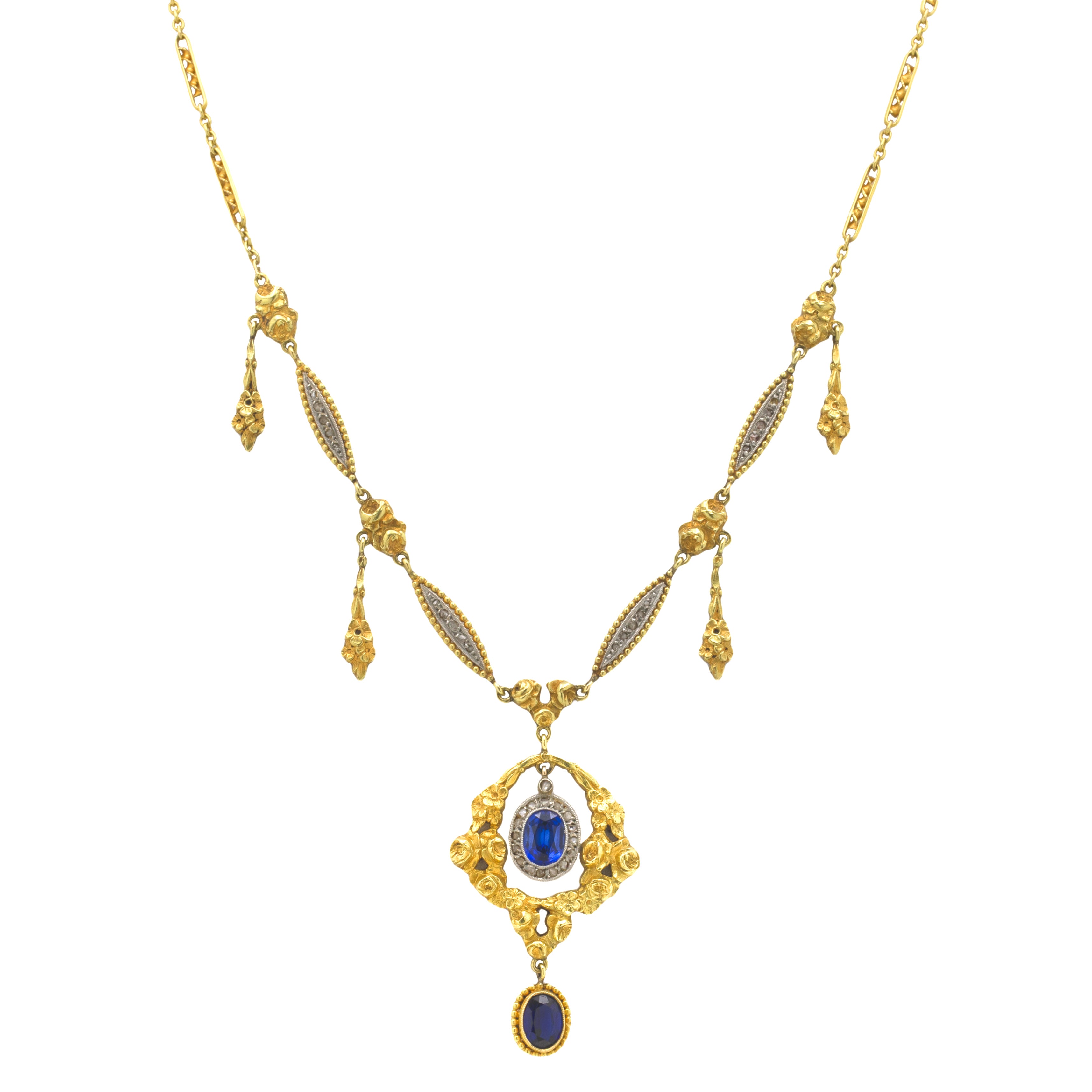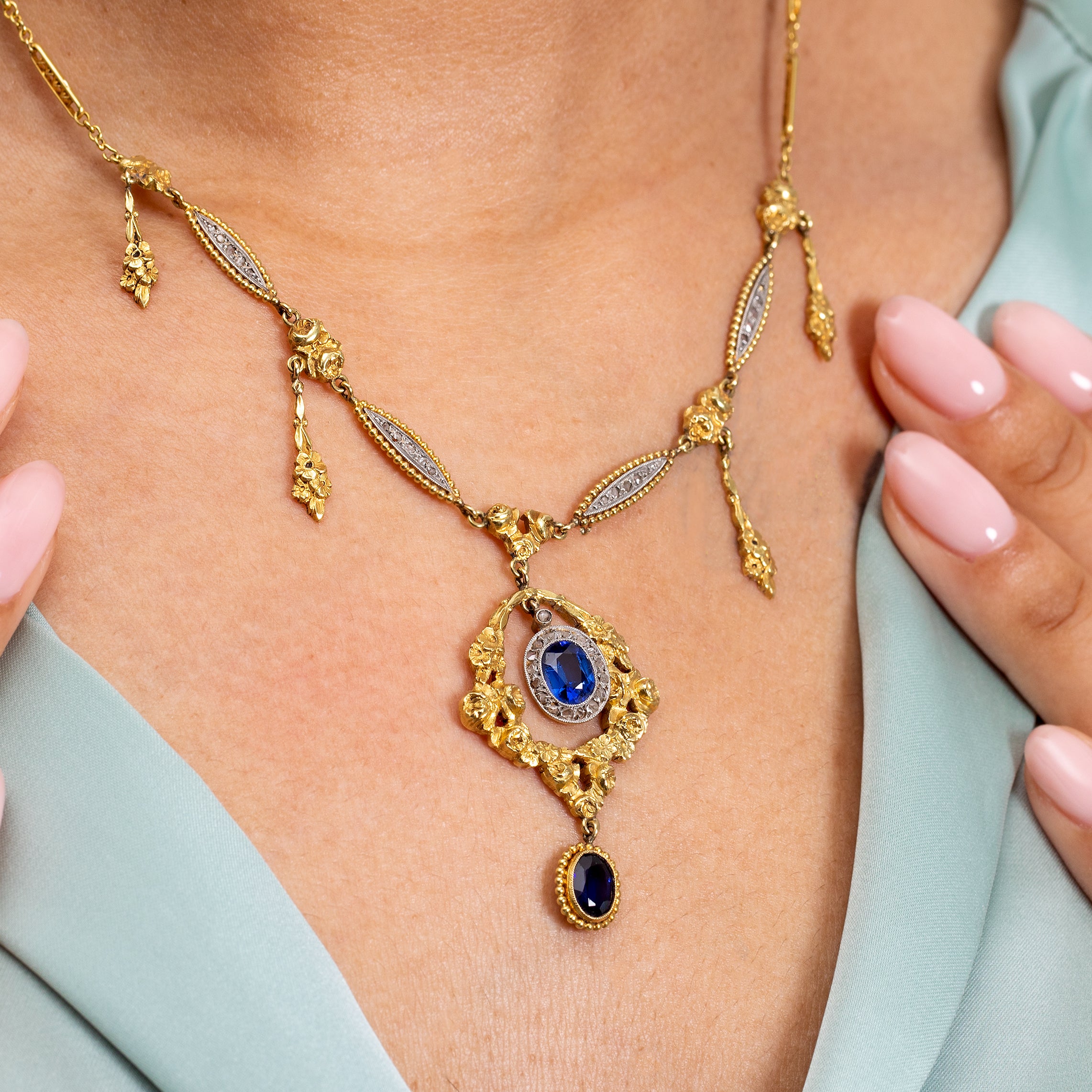 Collier à franges "Roses" en or 18 carats, saphir et diamant, antique français