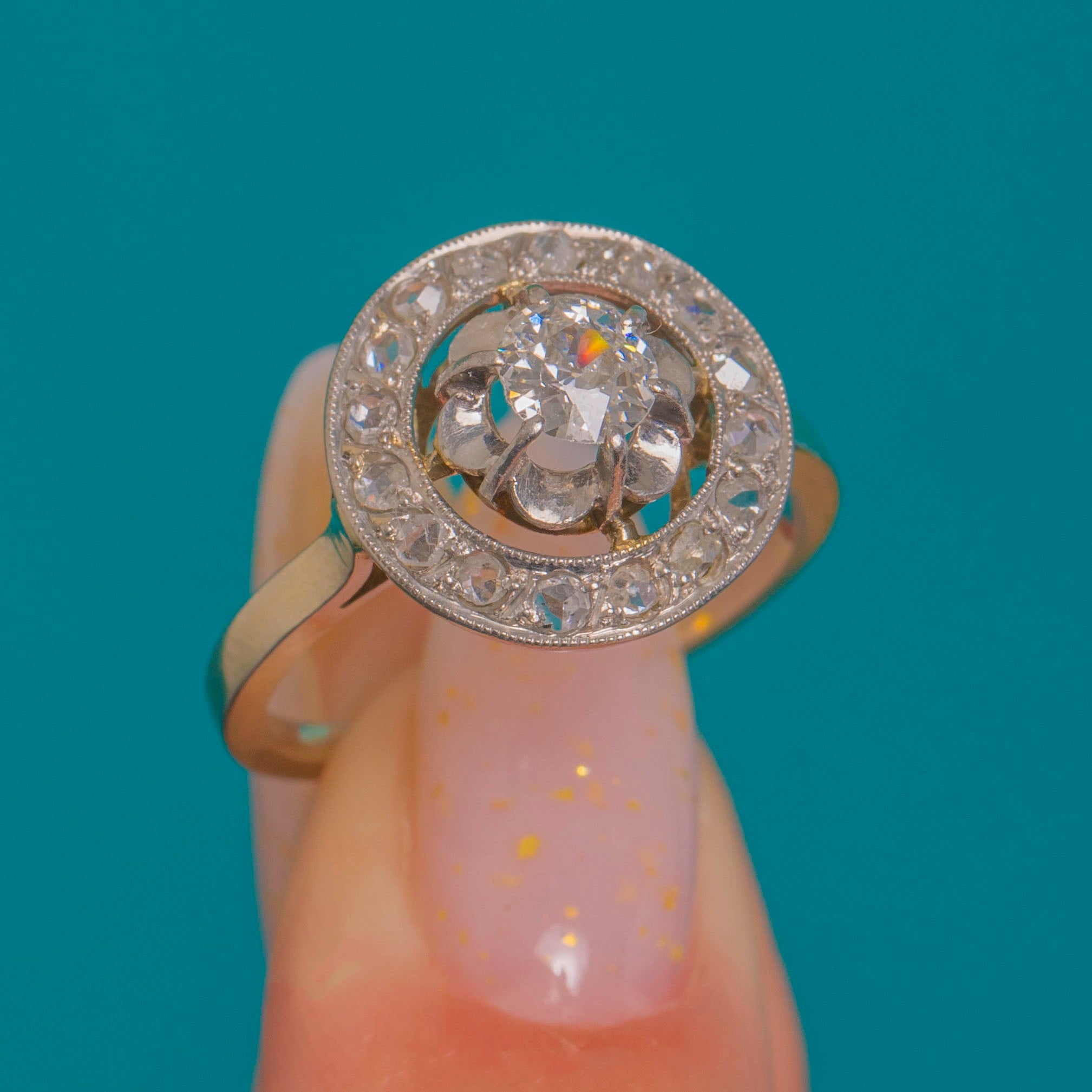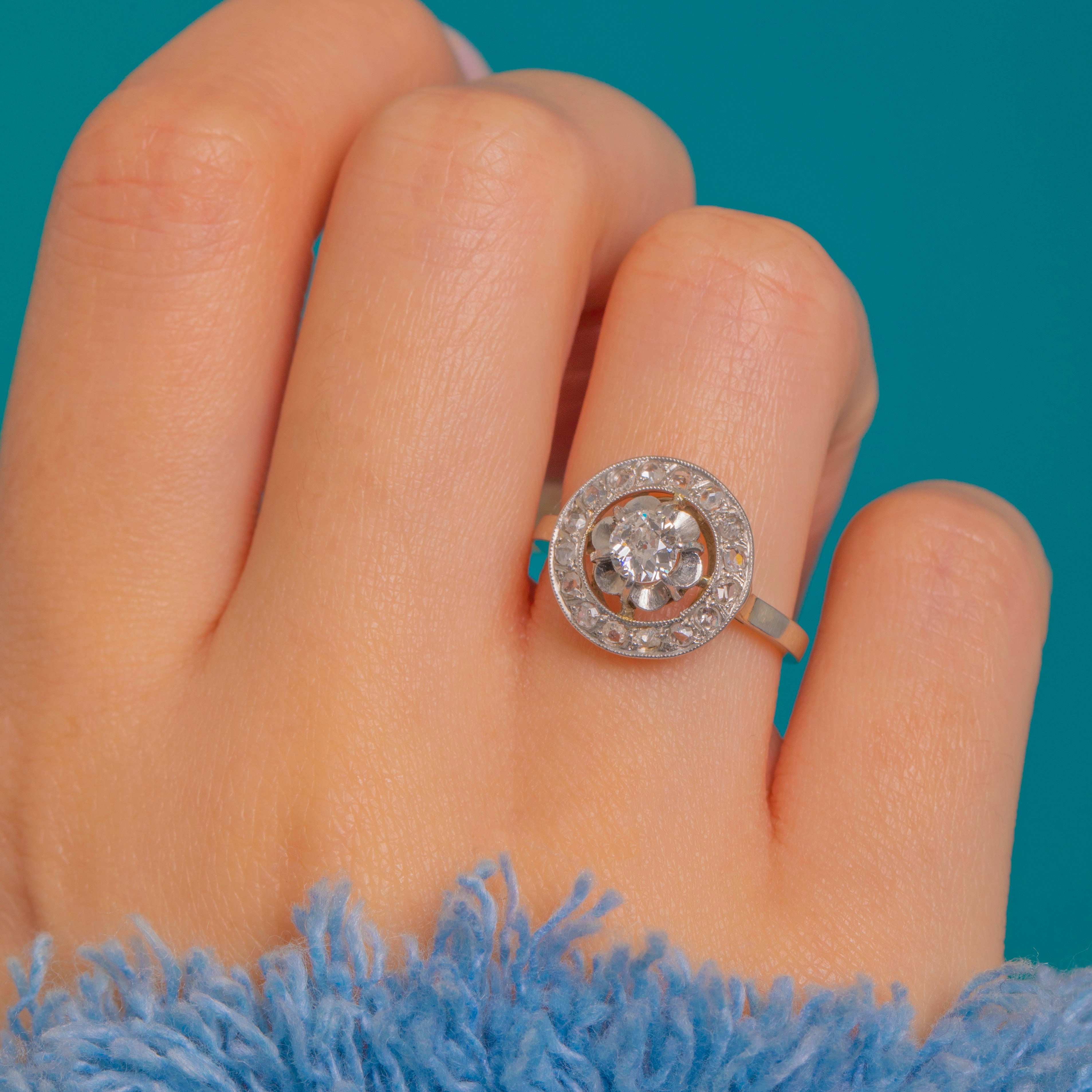 A quintessential Edwardian “target” cluster, this French Diamond halo ring is beautifully rendered in 18ct Gold with Platinum settings. A bright Old European cut Diamond of approximately 0.25ct takes centre stage in a scalloped, buttercup-style surround, encircled by a fine halo of glistening rose-cut Diamonds with delicate milgrain edges. The high profile and airy, pierced under-gallery lend an elegant lightness to the design while maximising sparkle.