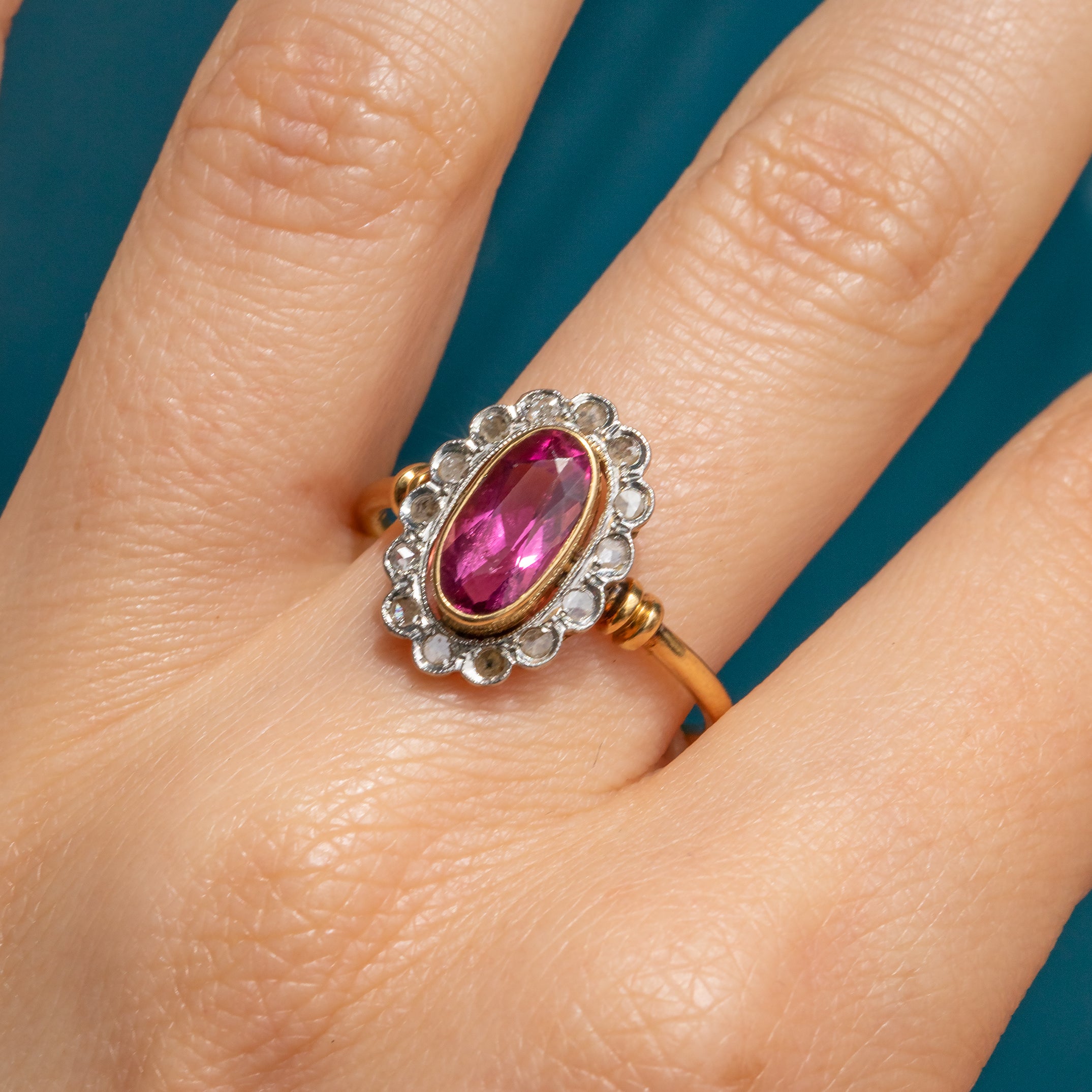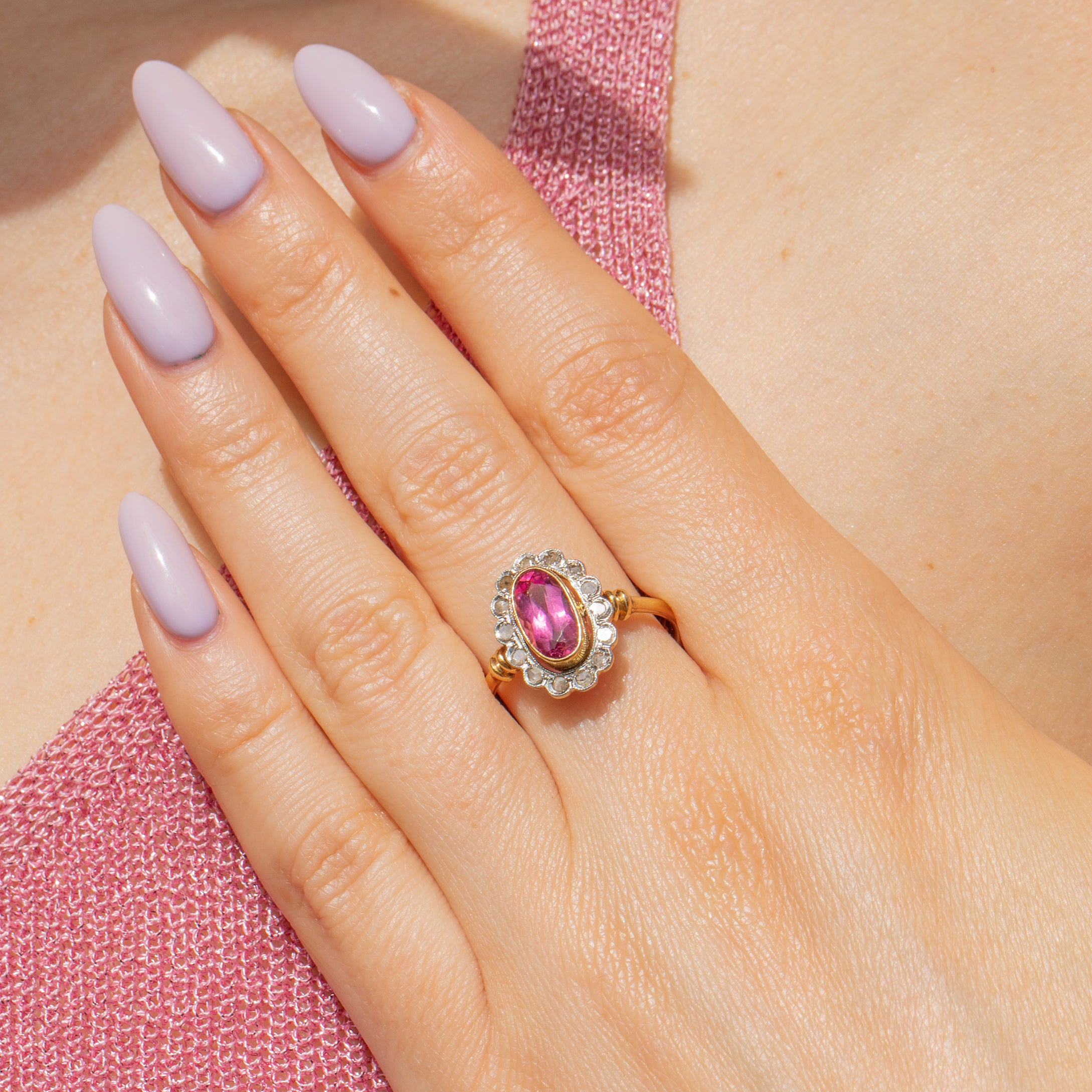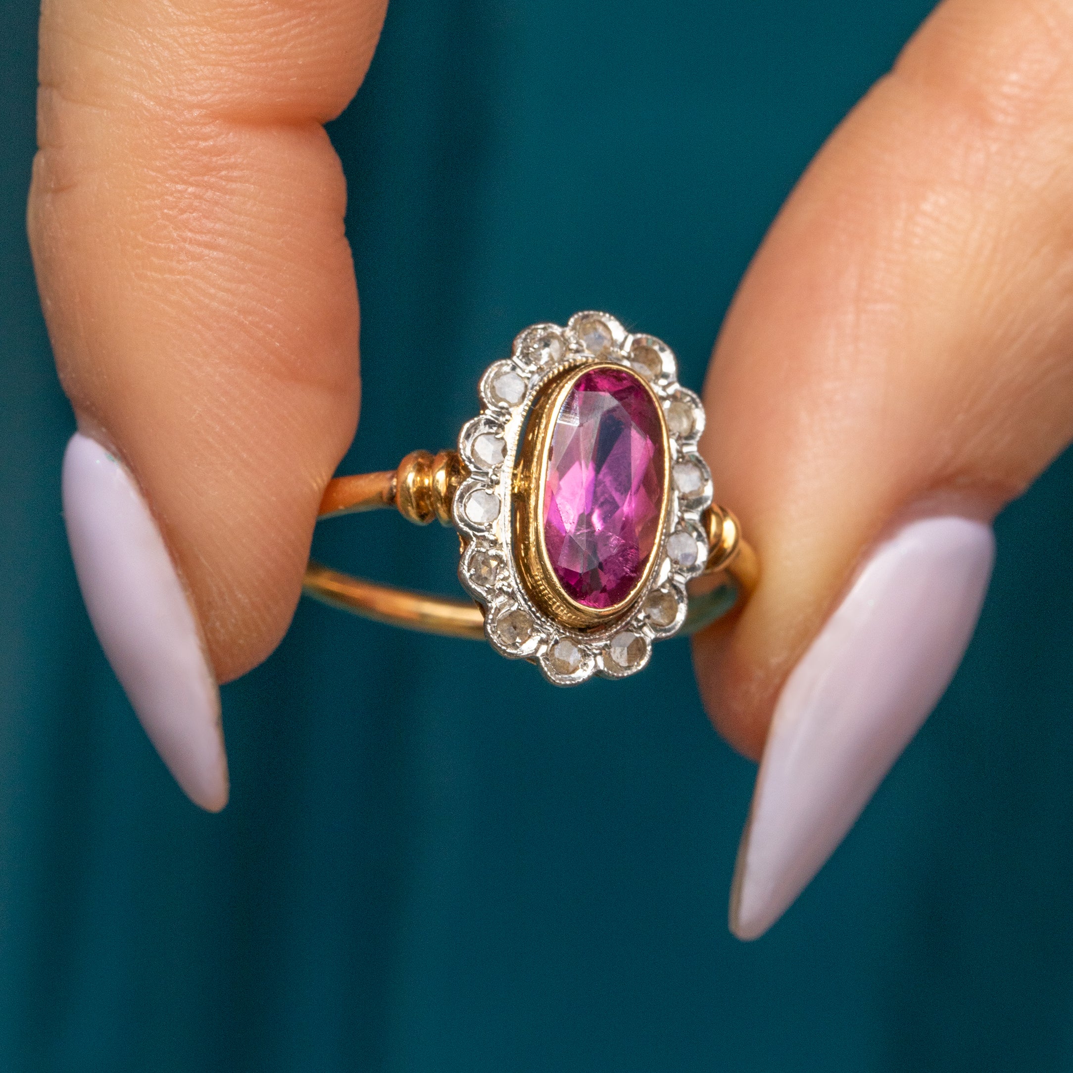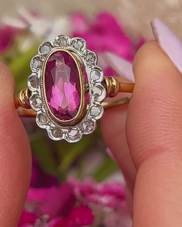 Antique French Pink Tourmaline Diamond Cluster Ring, 18ct Gold