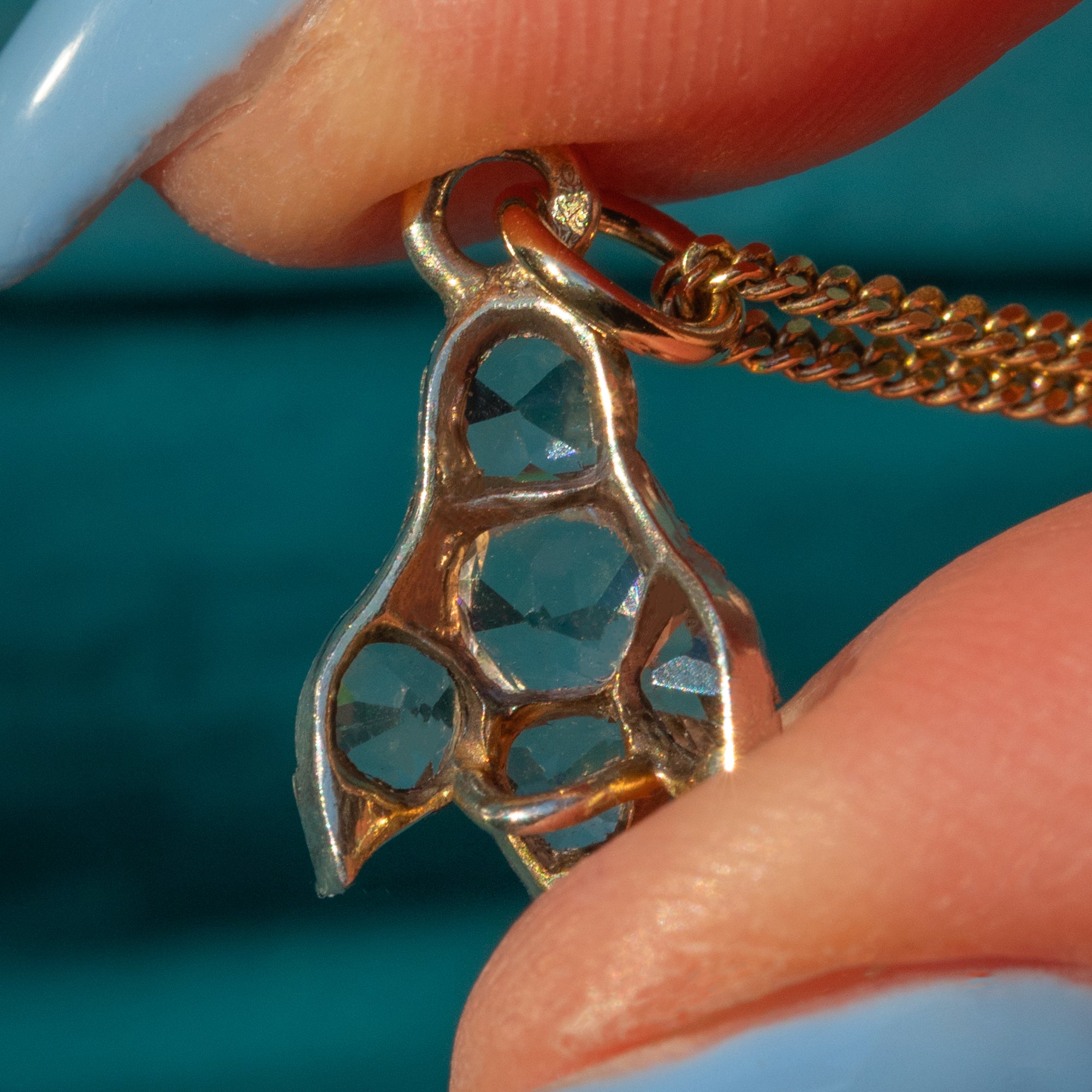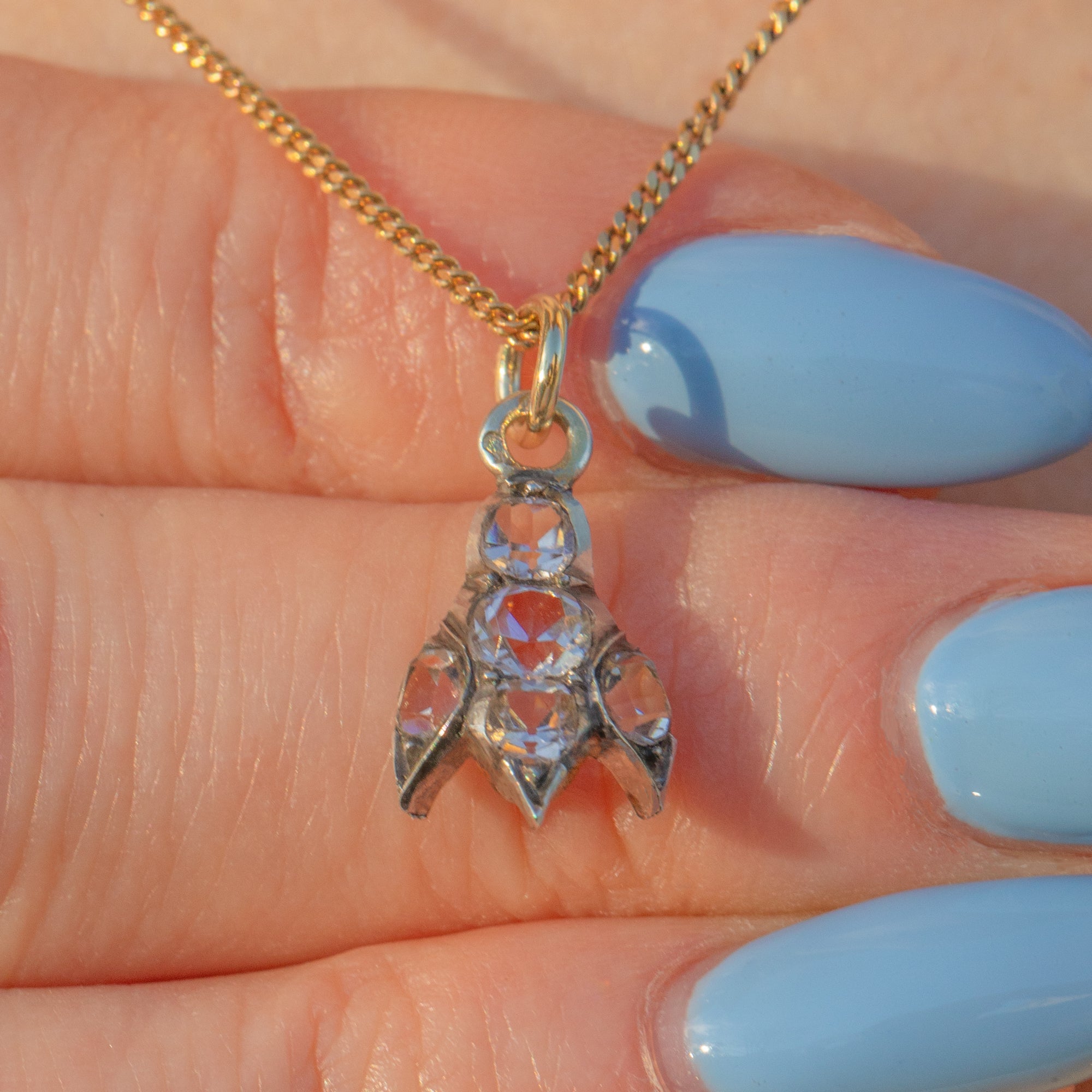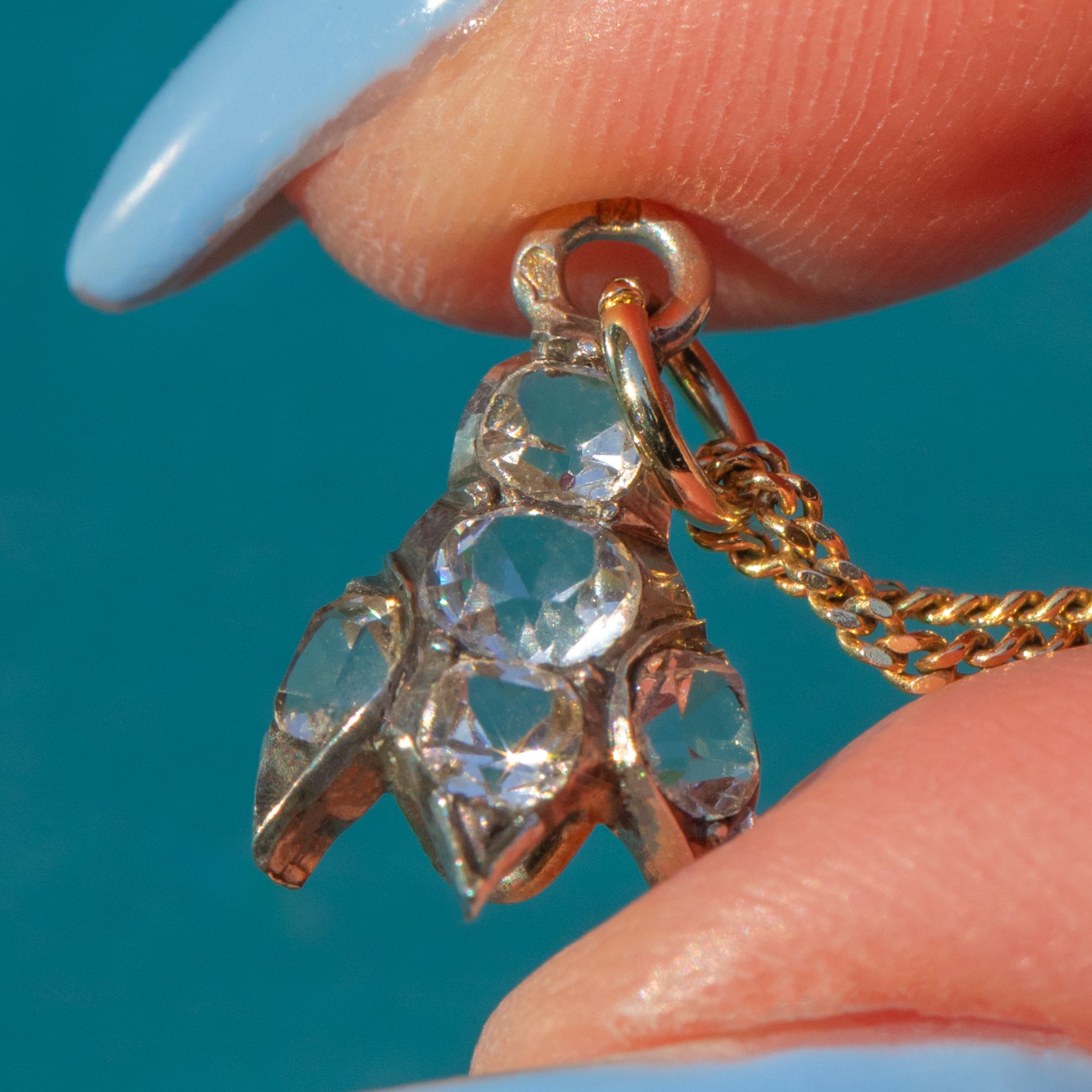 This exquisite antique French Silver Paste fuchsia drop charm is a delicate and timeless piece of craftsmanship. Featuring five sparkling Paste gemstones arranged to mimic the graceful shape of a fuchsia flower, she exudes charm and elegance.