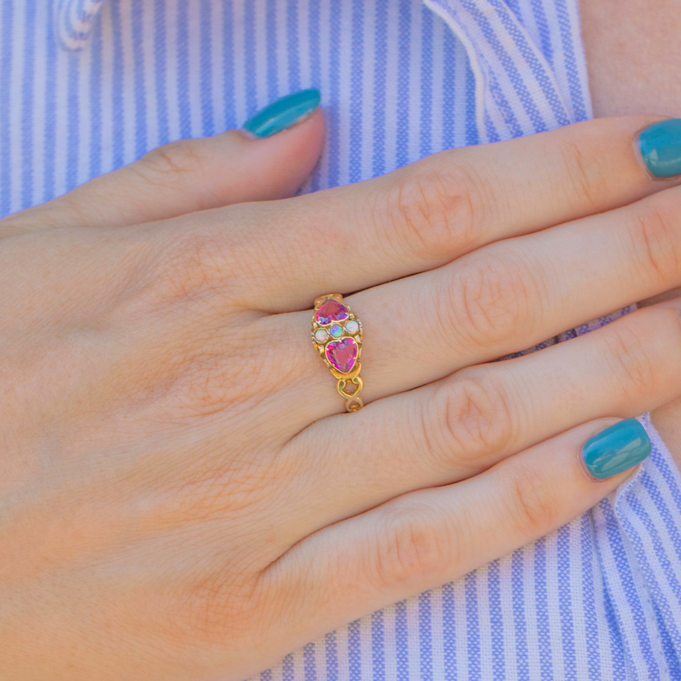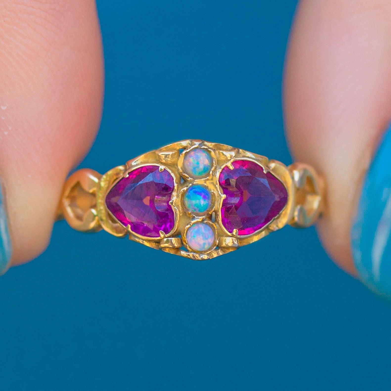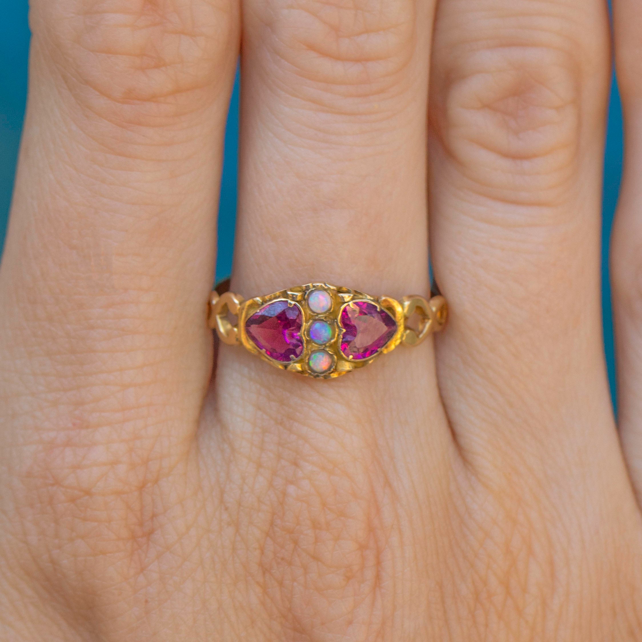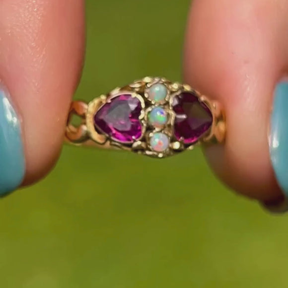 This antique Garnet Opal heart cluster ring is fit for a princess! Sugary and sweet, her heart-shaped pink Garnets flank three dainty rainbow-hued Opals creating a striking composition.