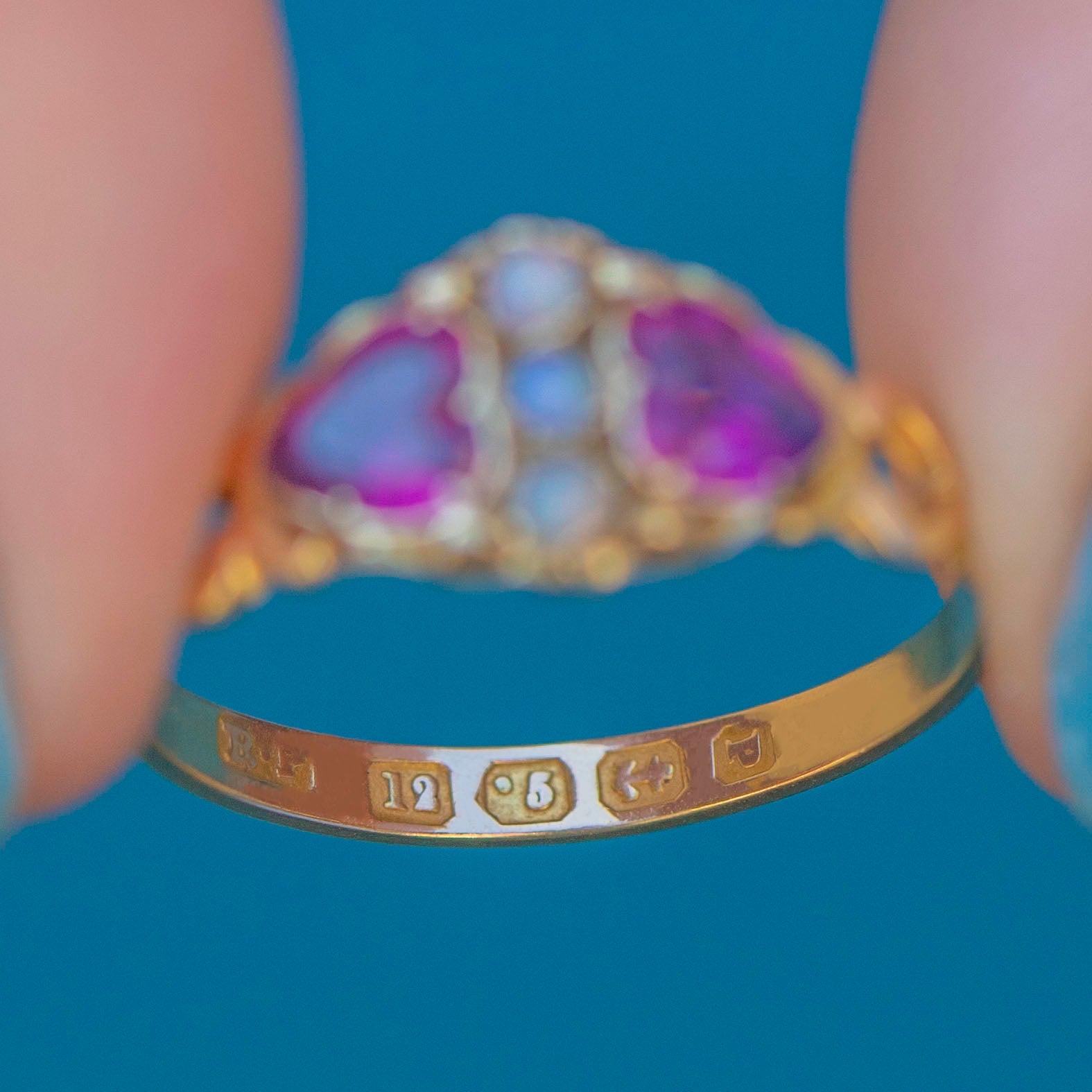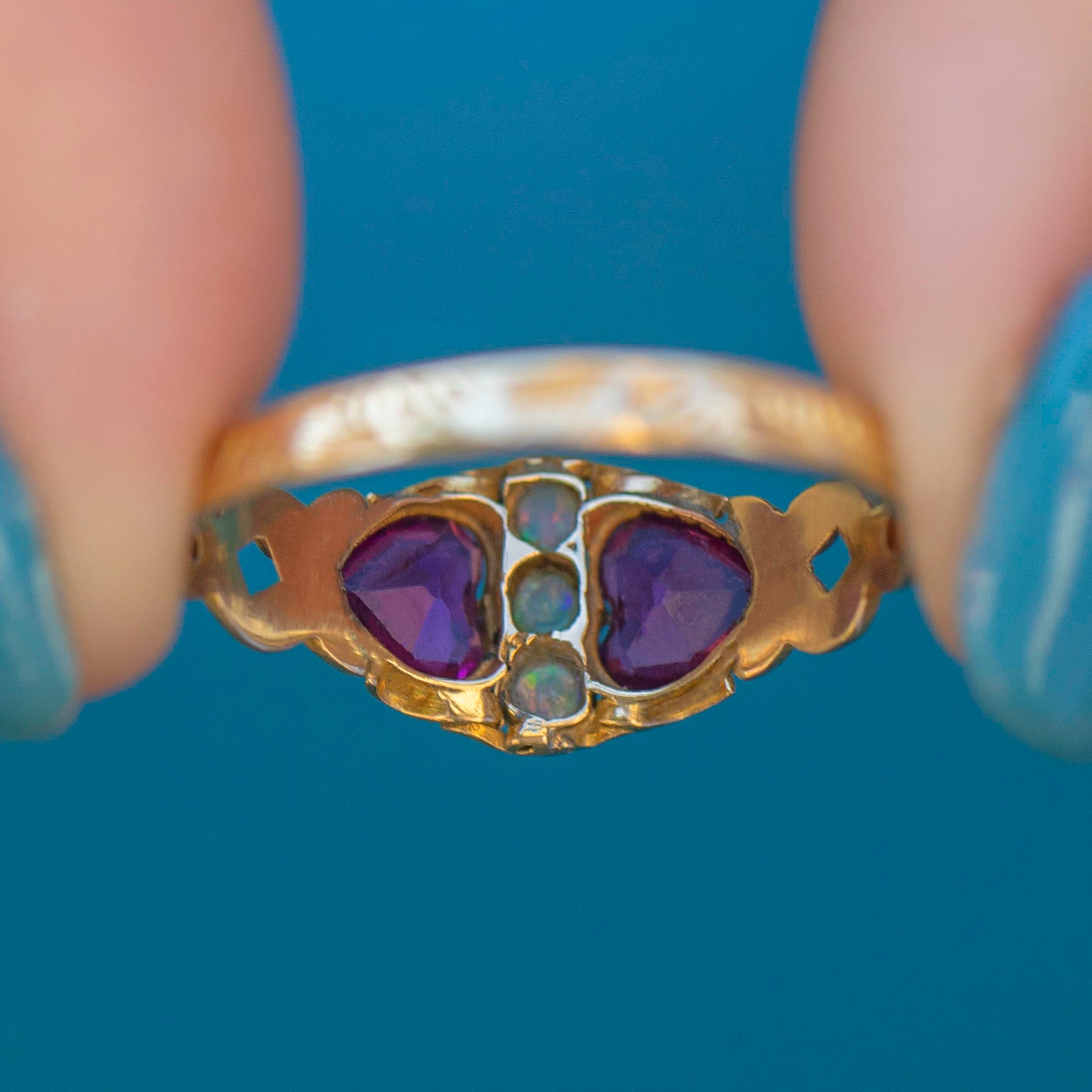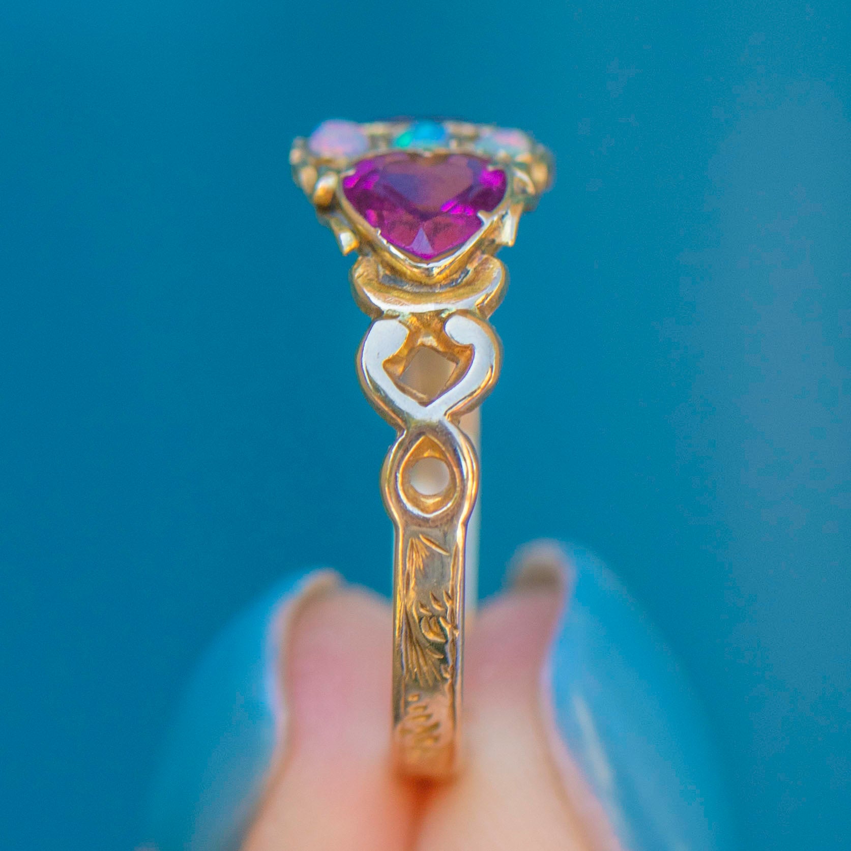 This antique Garnet Opal heart cluster ring is fit for a princess! Sugary and sweet, her heart-shaped pink Garnets flank three dainty rainbow-hued Opals creating a striking composition.