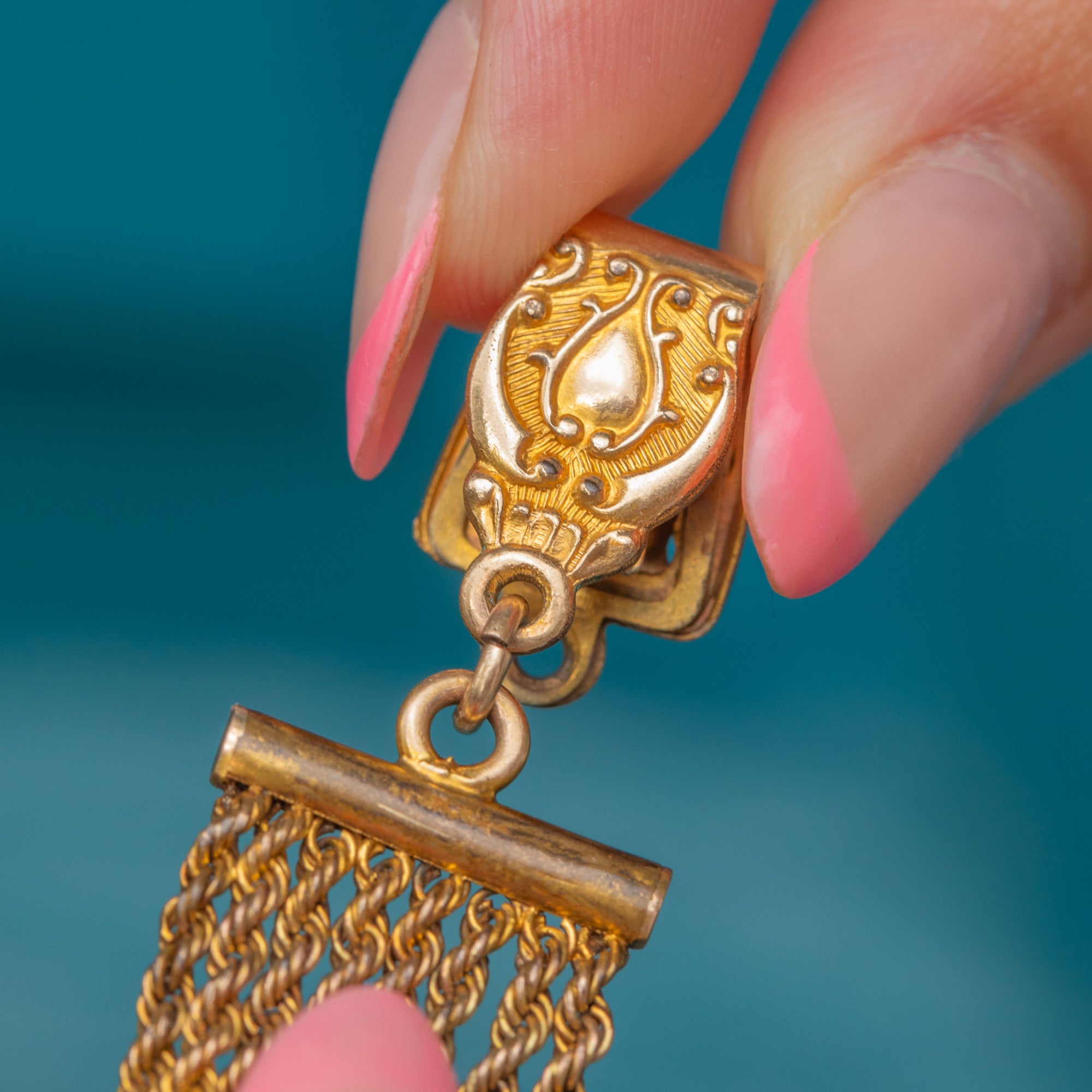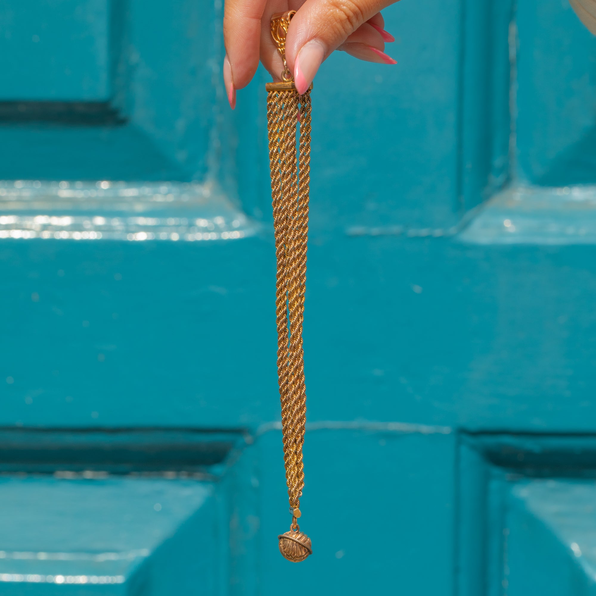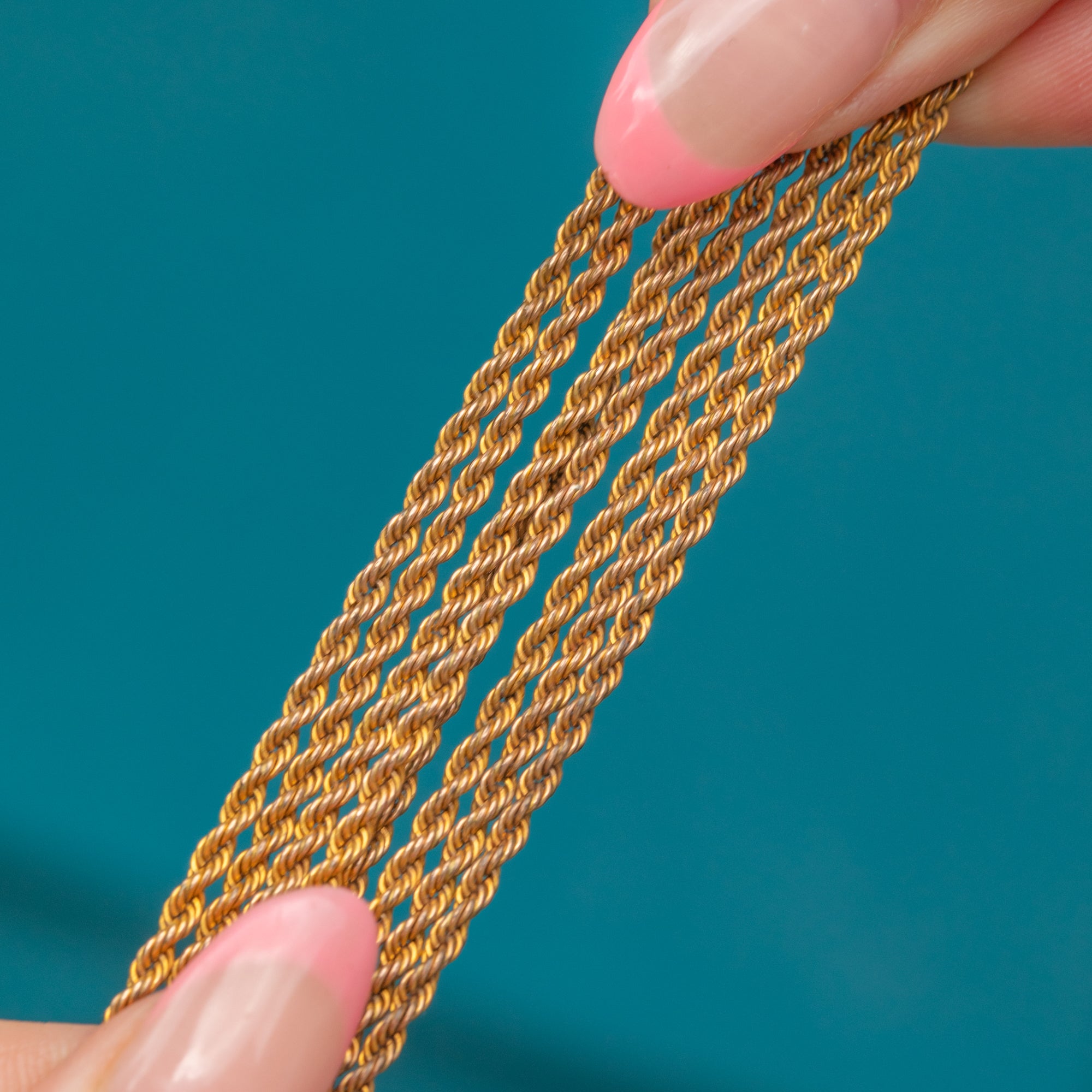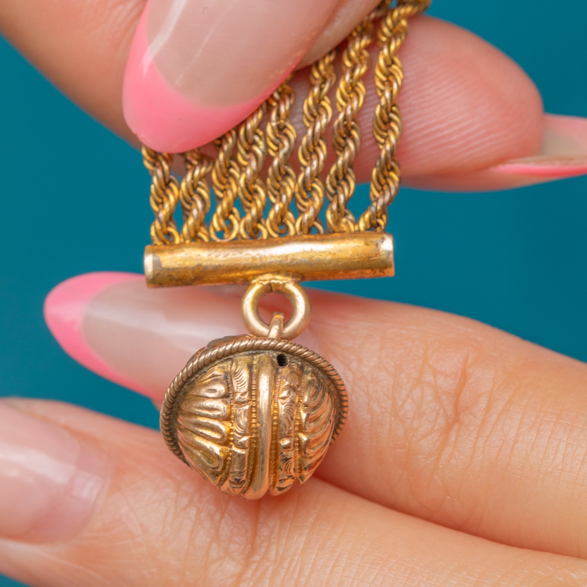 Comprised of eight individual twisted rope chains, this Albertina has a wonderful texture and is complete with a fancy Victorian orb charm and an ornately engraved clasp. With a gorgeous Golden tone, she is sure to brighten up your collection!