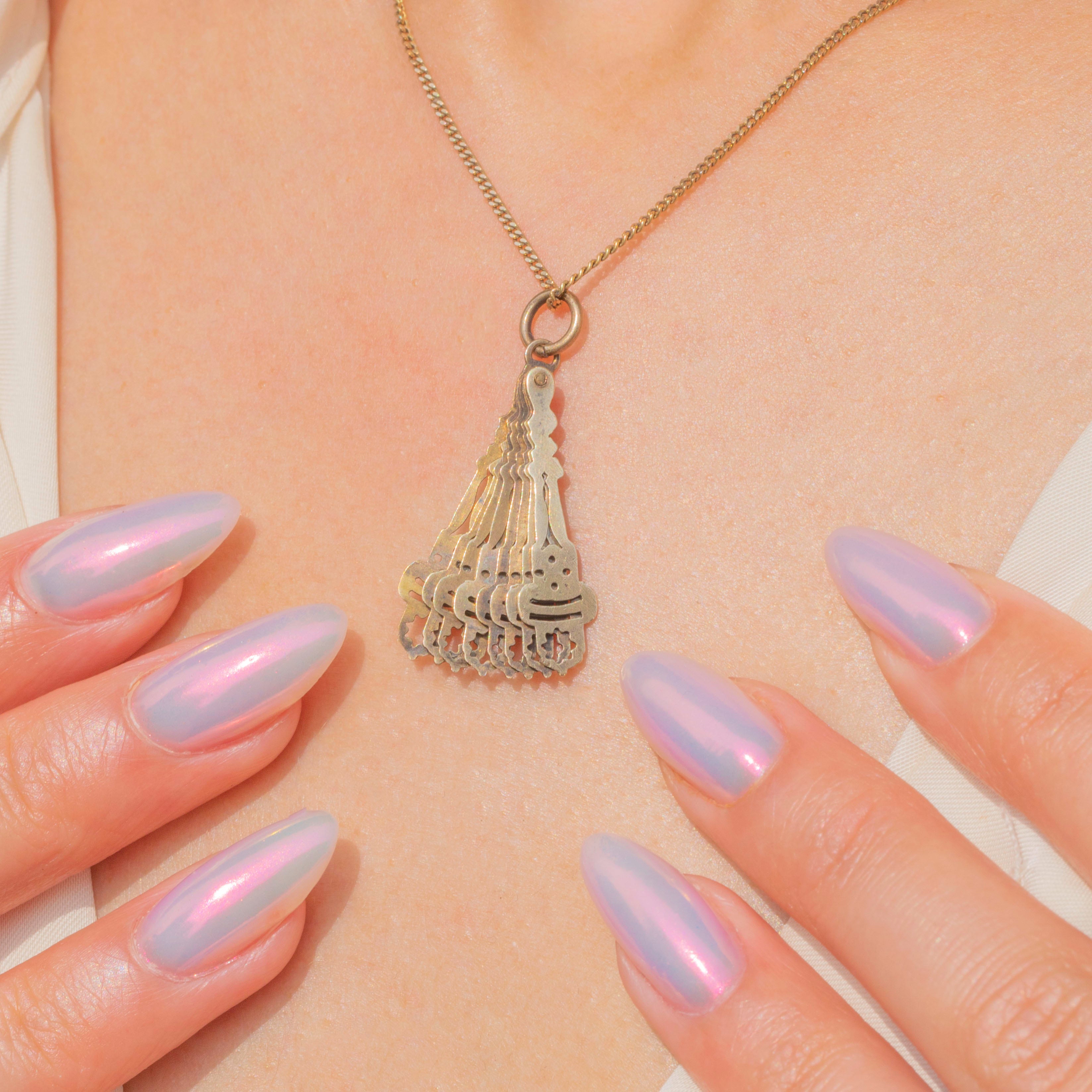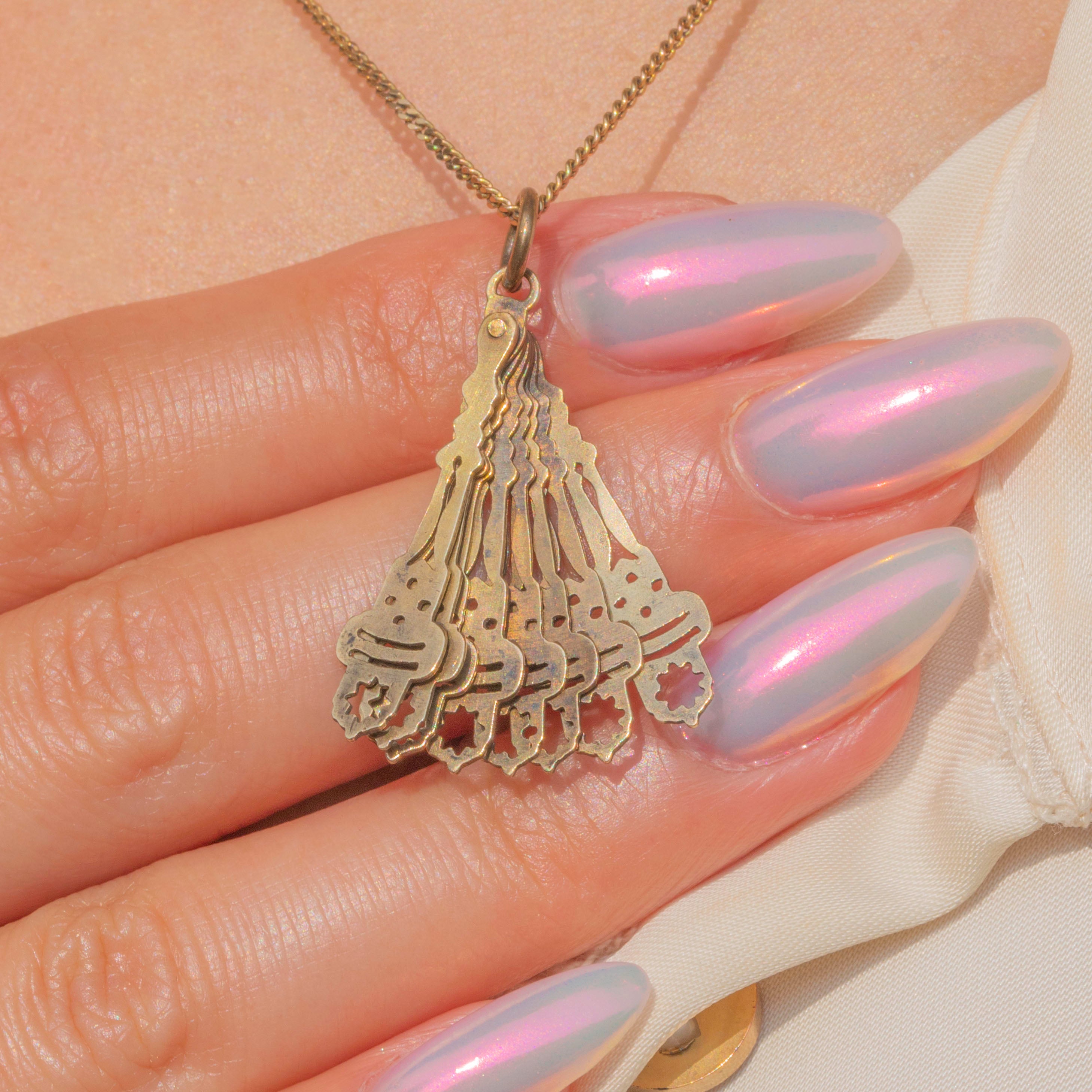 A charming Art Deco Gold toned openwork fan pendant to adorn your décolletage!