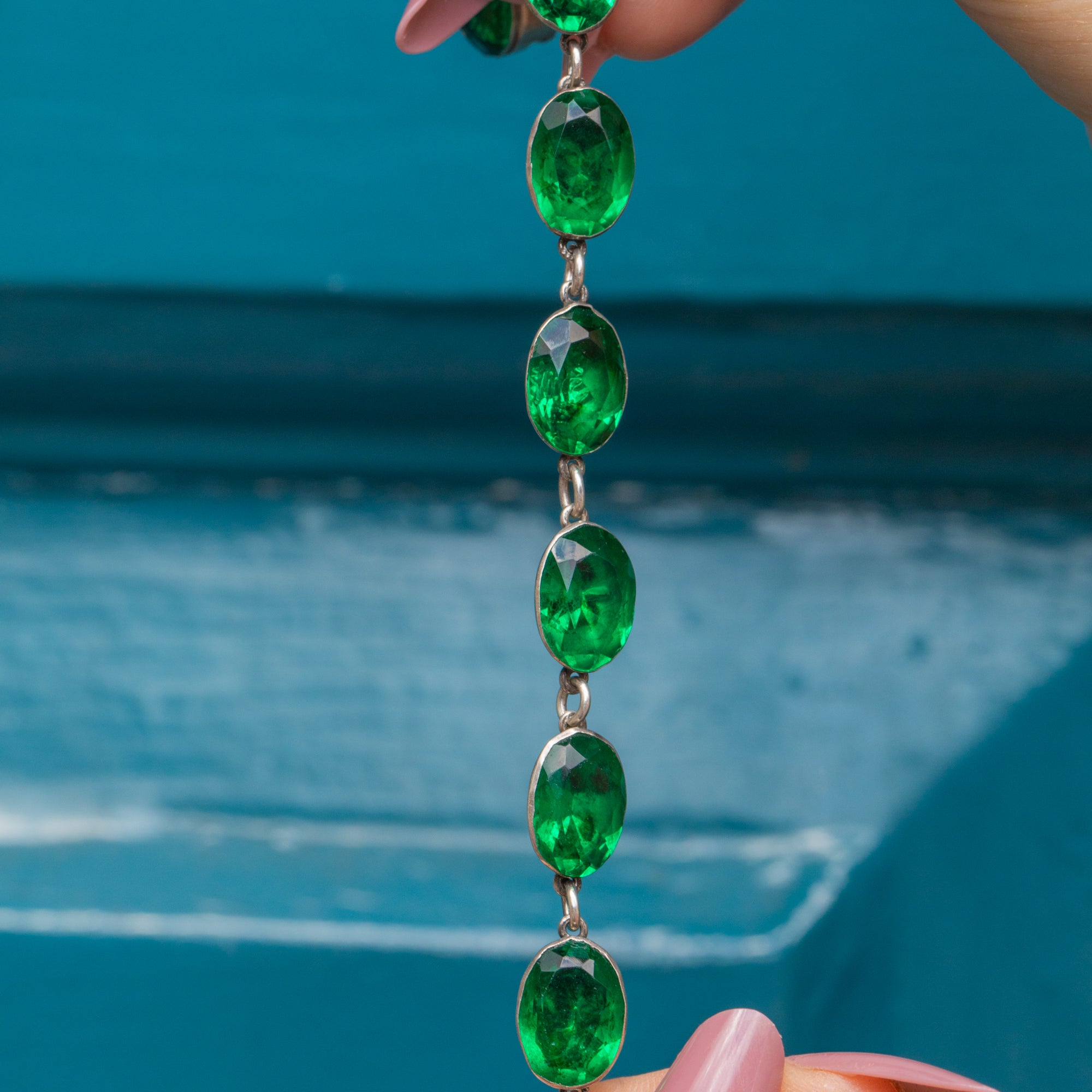 With domed backs crafted from lustrous Sterling Silver, this riviere necklace provides the utmost comfort as she is worn. With even her clasp showcasing a radiant green Paste, the attention to detail is second to none!