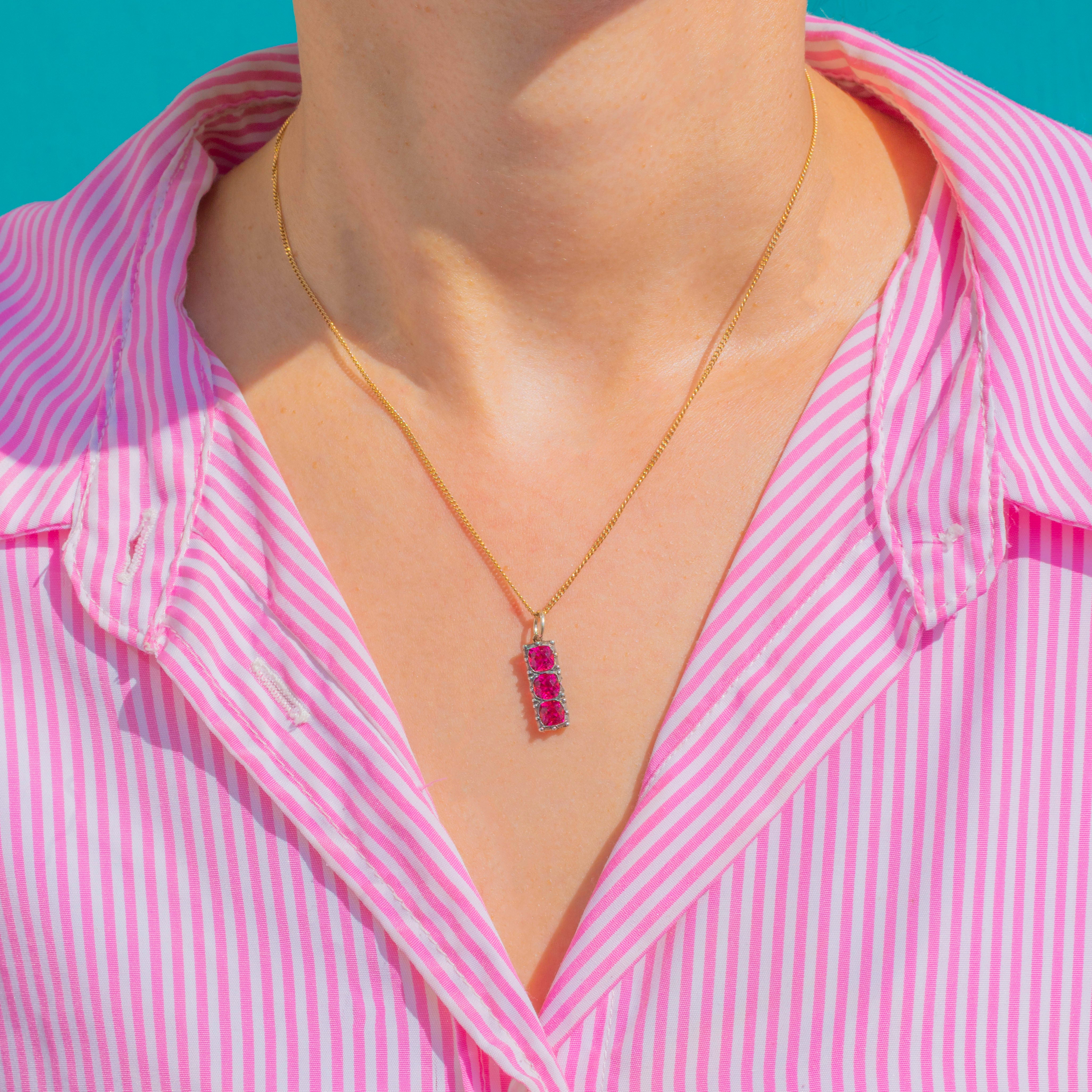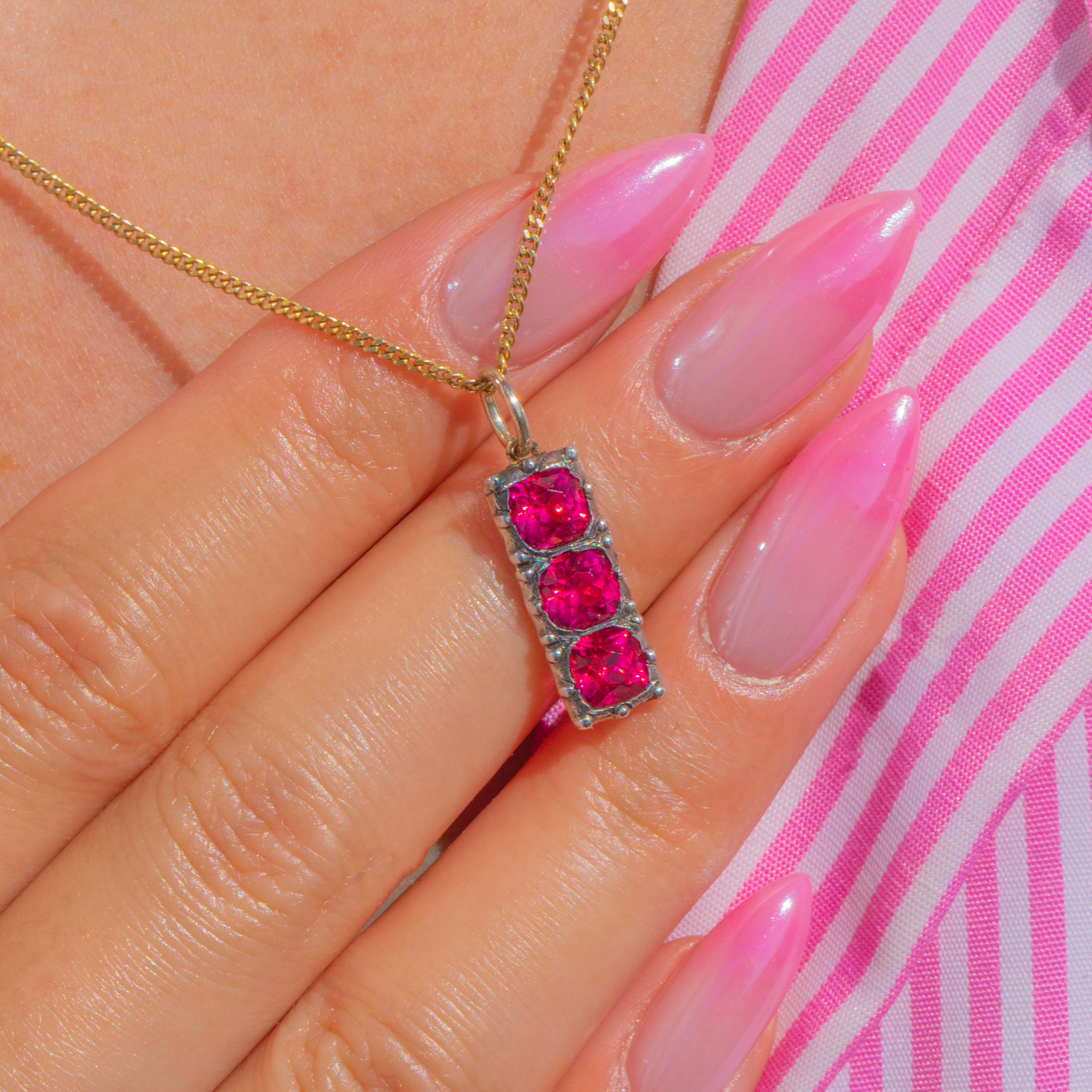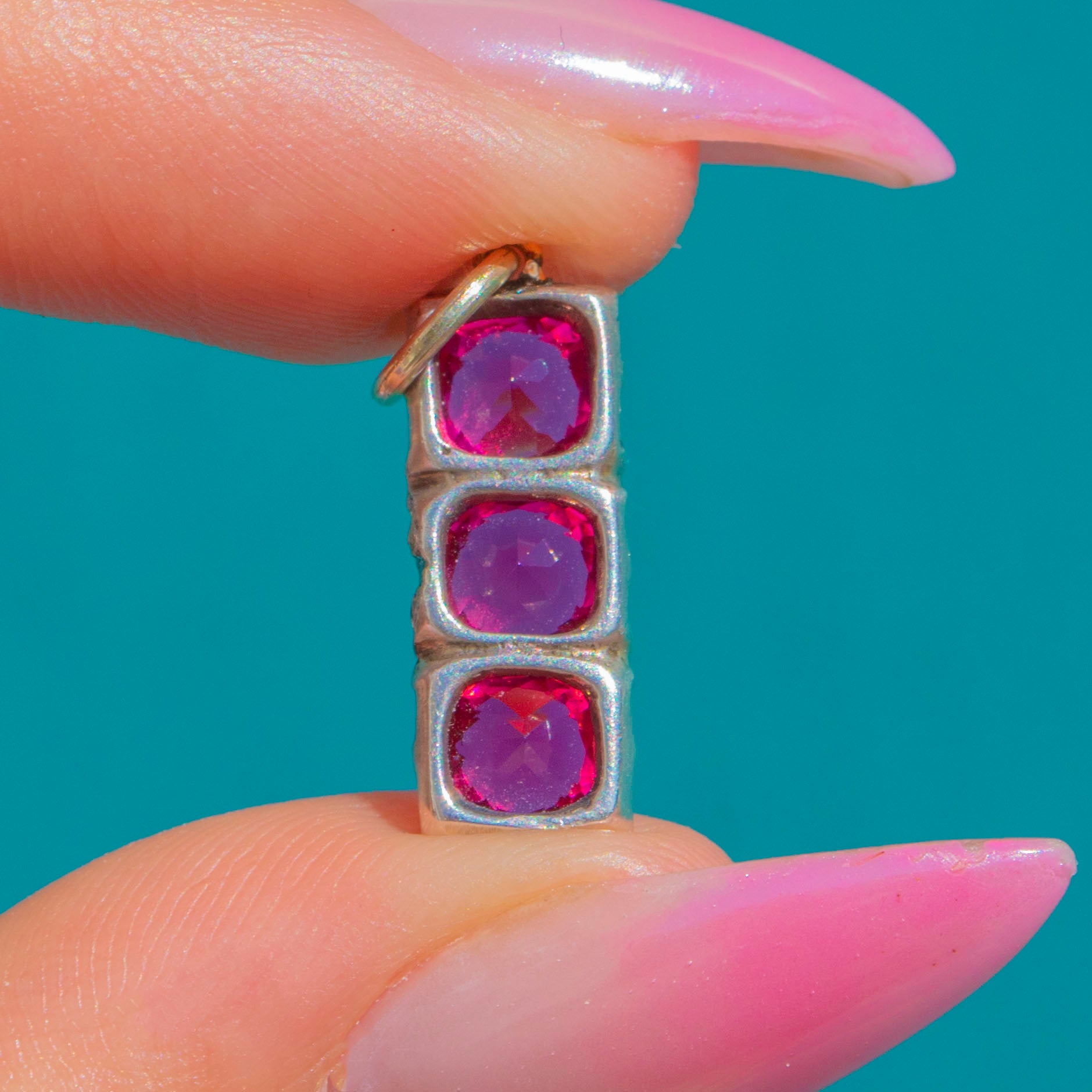 A vivid Edwardian drop charm, crafted in Silver with a 9ct Gold jump ring and set with three hot Pink Paste stones. The saturated pink hue gives this antique piece a wonderfully playful flash of colour, catching the light beautifully as it moves.