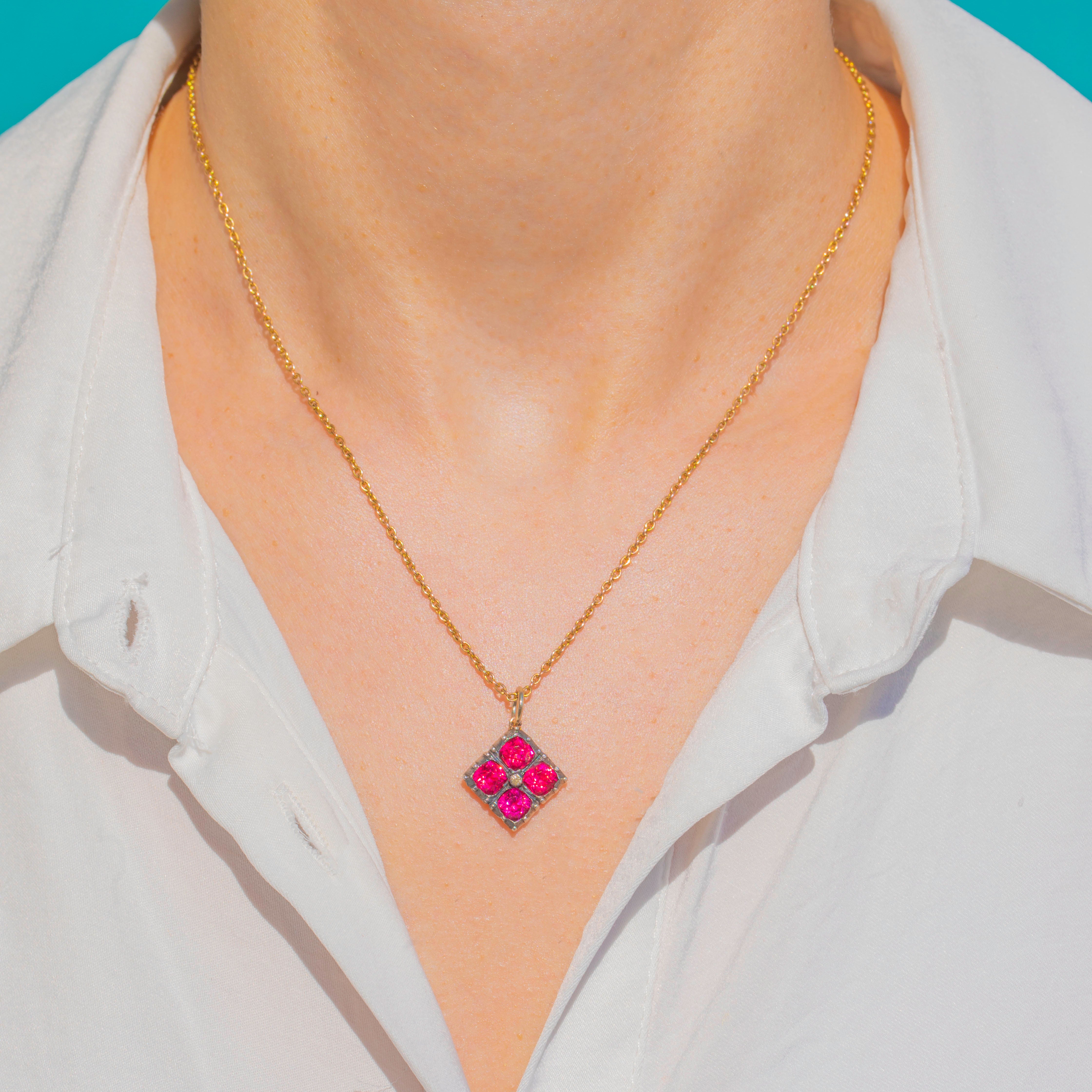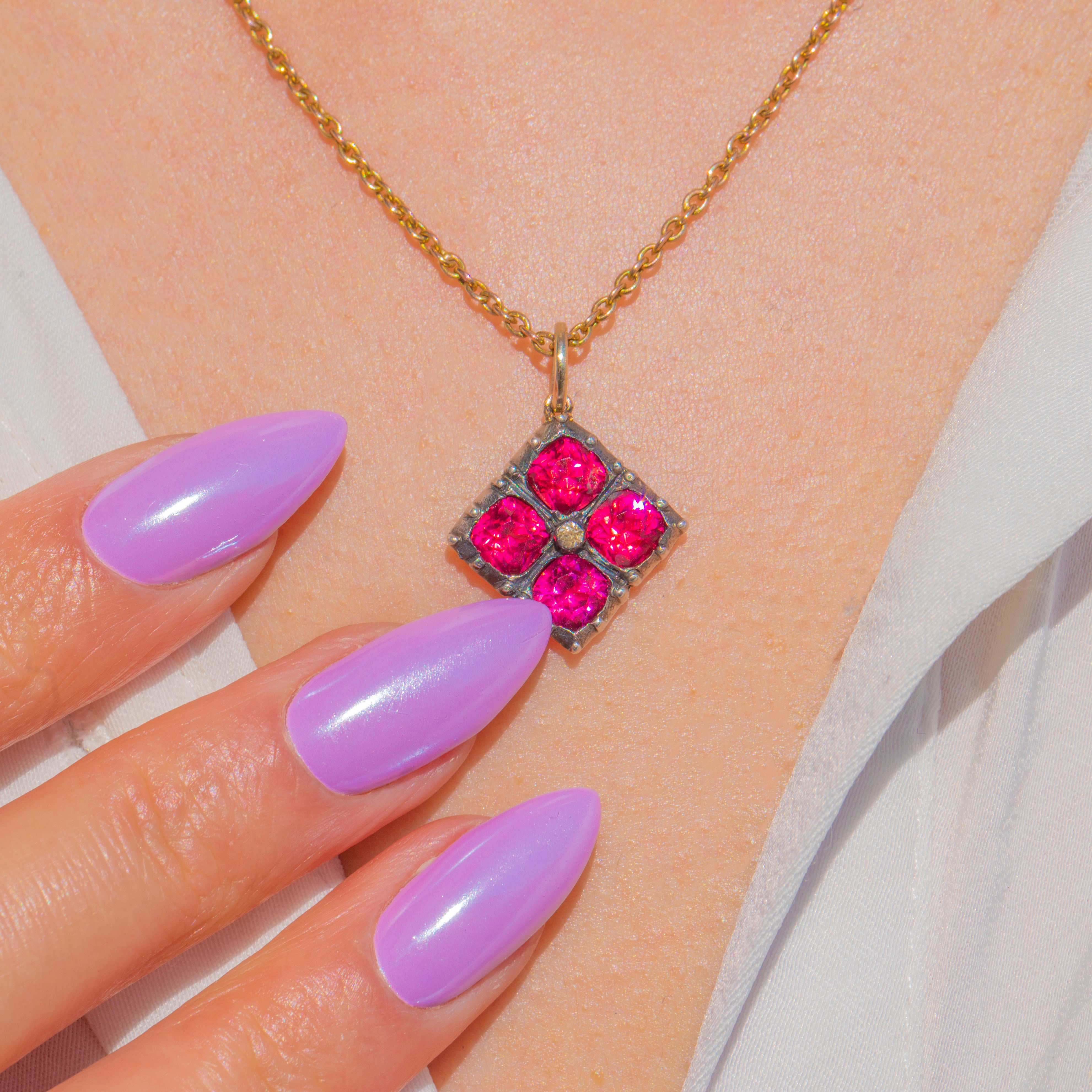Brimming with joyful colour, this Edwardian flower charm showcases a quartet of vivid hot Pink Paste stones encircling a twinkling White Paste centre. The lively fuchsia hues bloom beautifully in a refined Silver piecrust setting, creating a sweet, graphic rosette that catches the light with every movement.