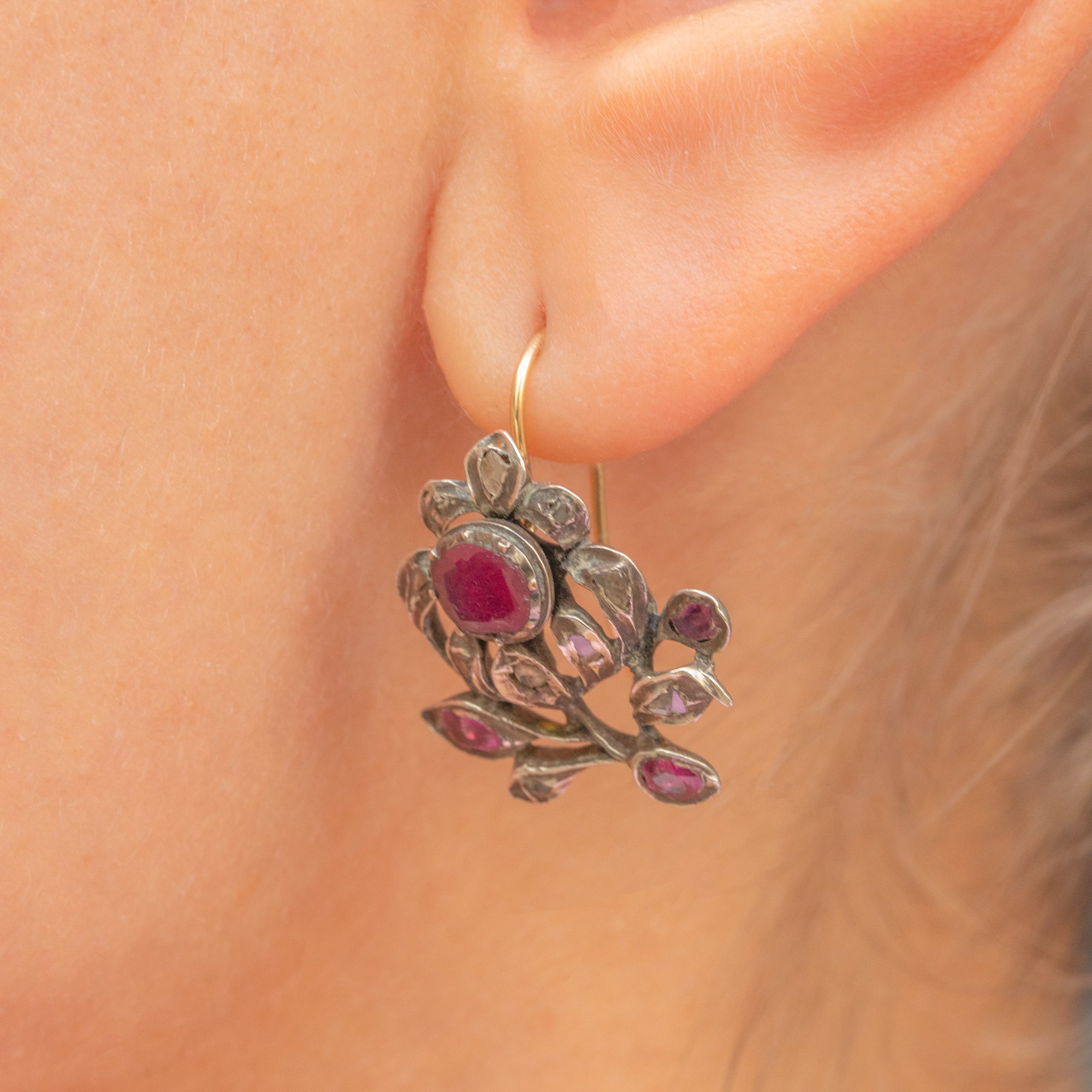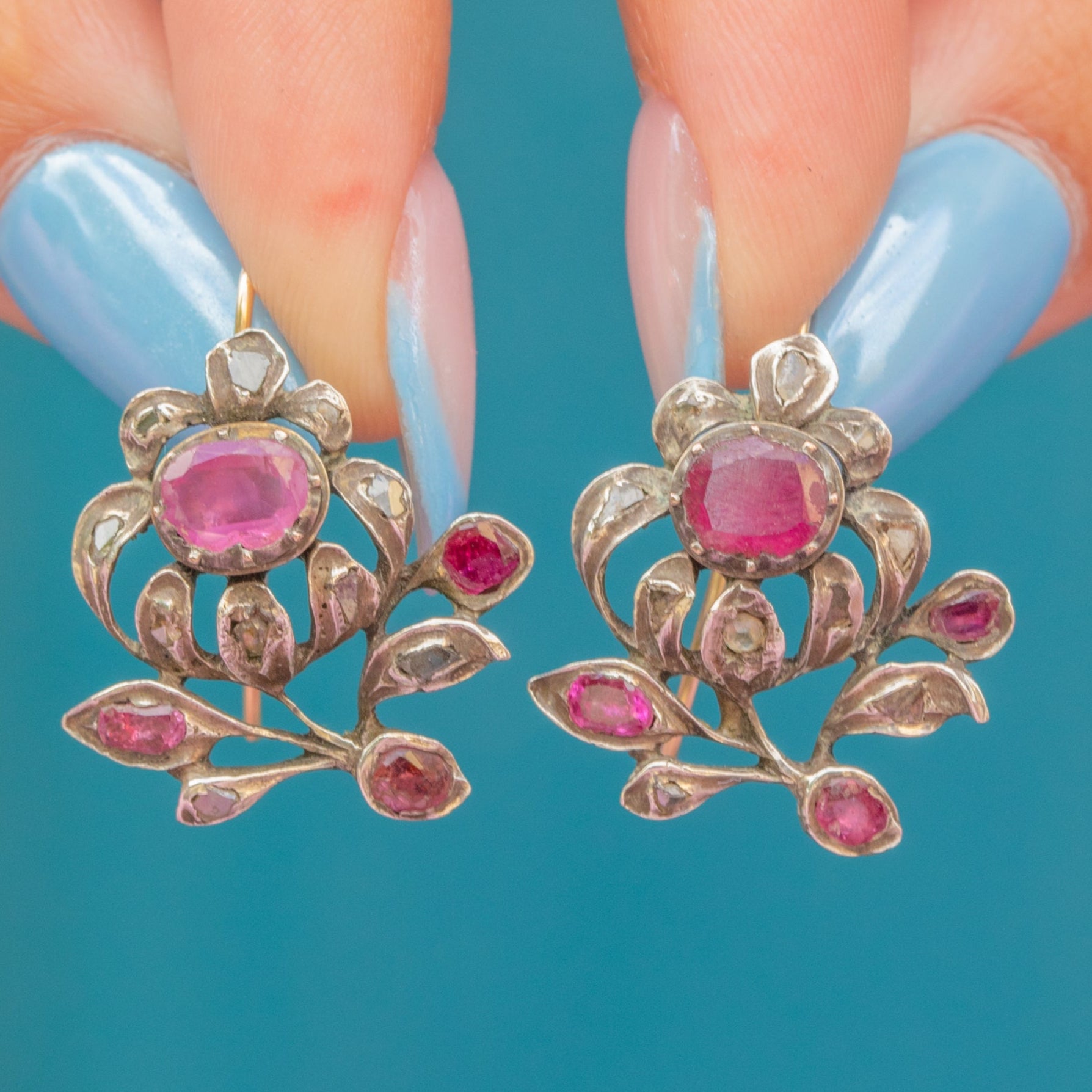 Antique Iberian Ruby Diamond Giardinetti Flower Earrings, 1.38ct Rubies