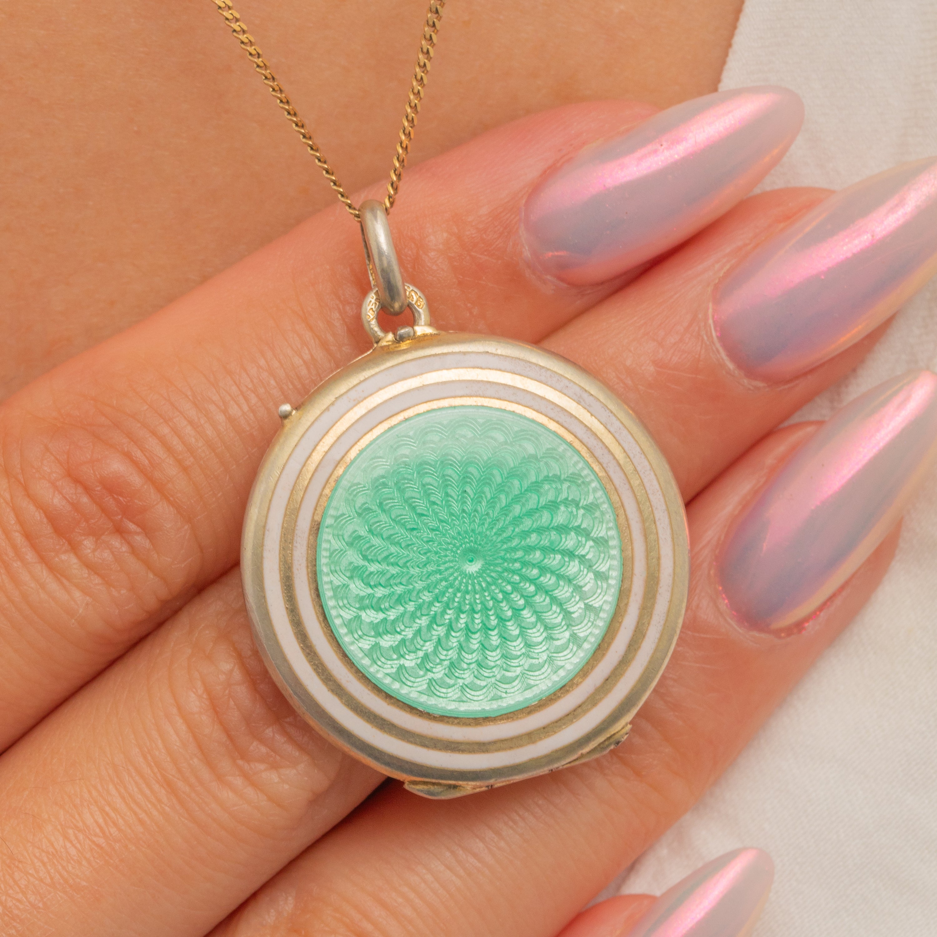 This Art Deco Silver mint green Guilloché Enamel locket is the perfect piece to brighten up your collection!
