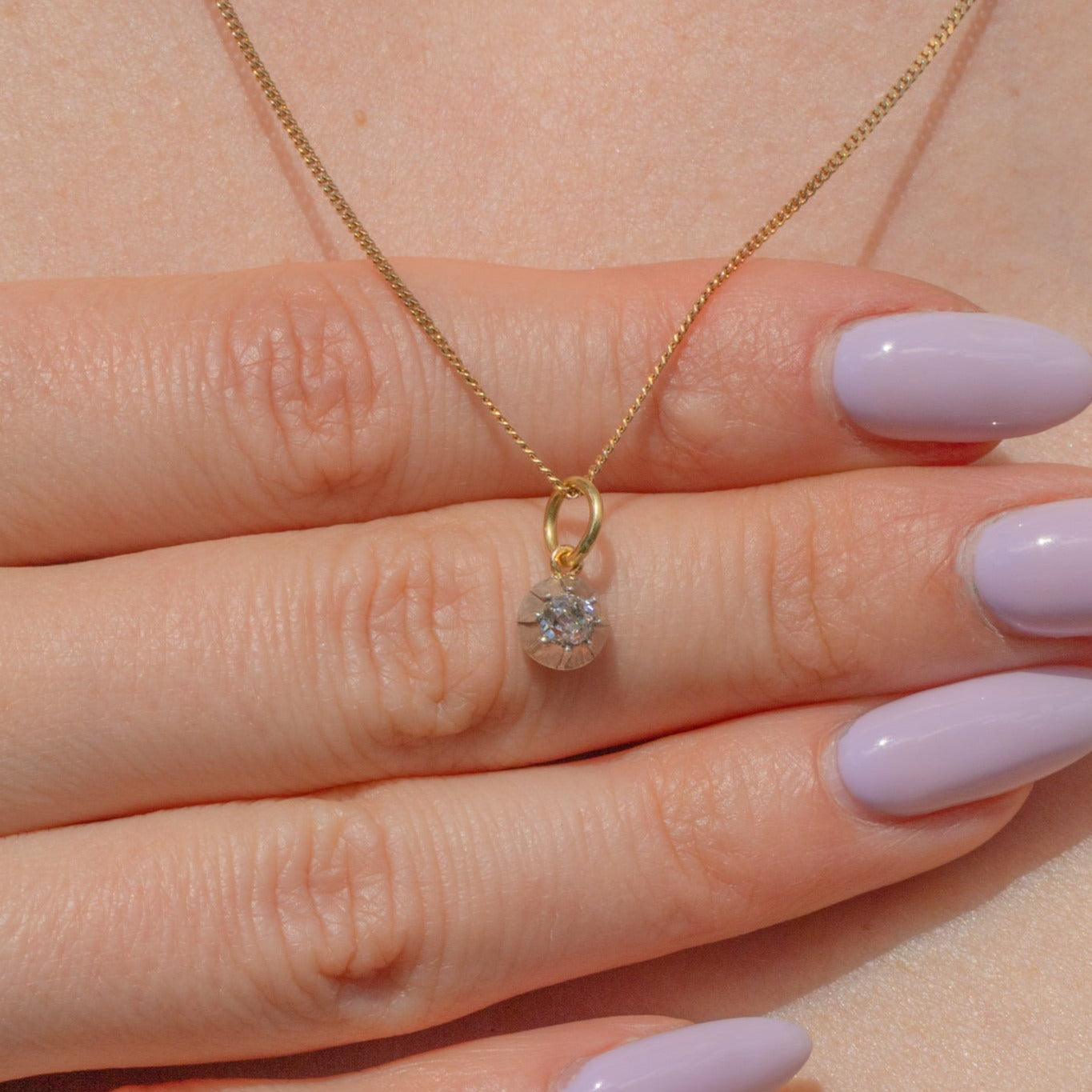 Securely embraced by piecrust settings, all 0.10cts of this old mine cut Diamond has an unmissable scintillation that will pair perfectly with an antique chain; this Diamond will take your breath away!