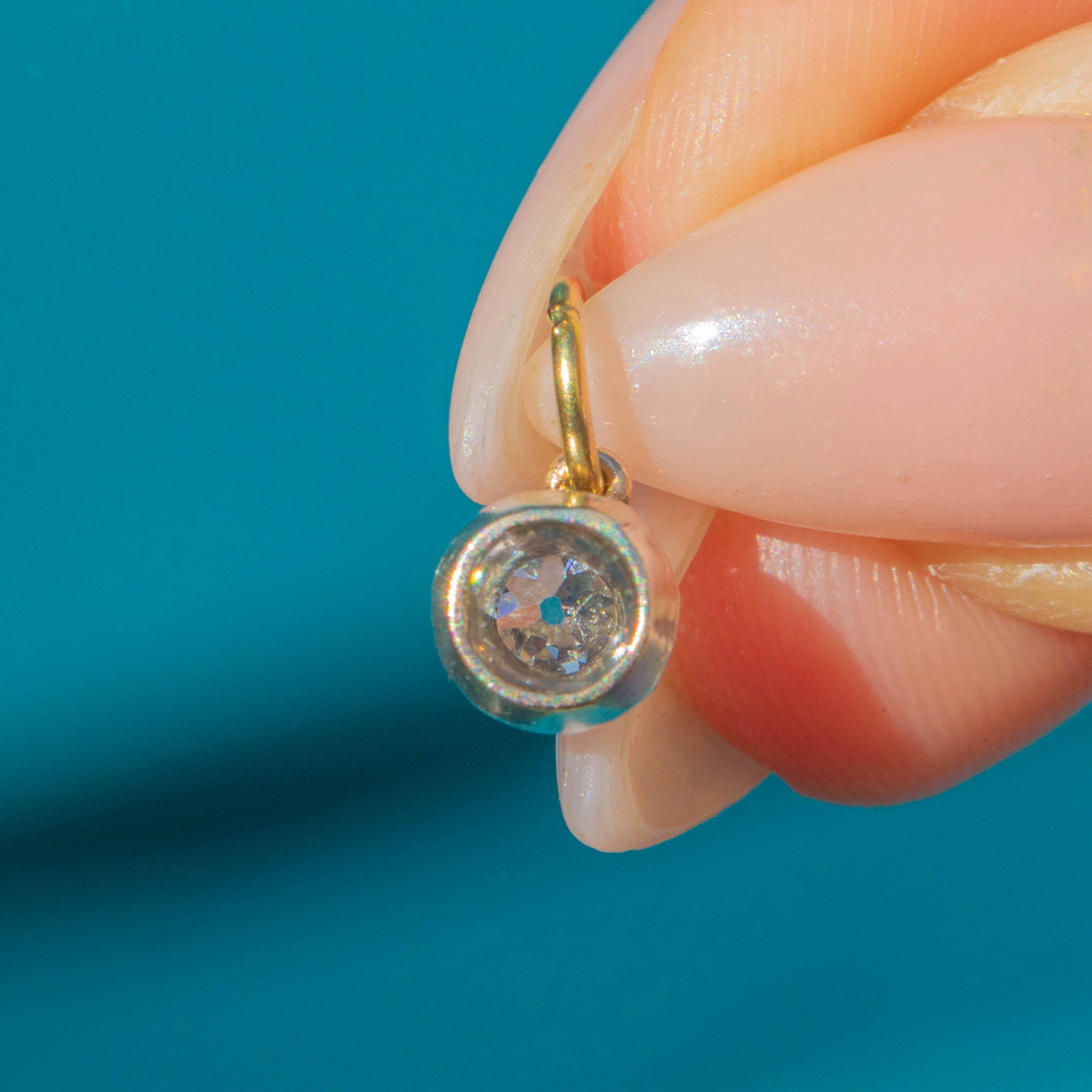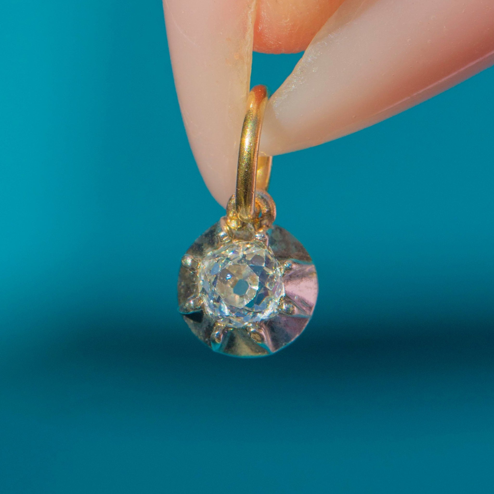 EXCELLENT: The Old Mine Cut Diamond is bright and secure, free from chips or abrasions. The Silver collet and 18ct Gold backing are strong and in excellent condition, with minimal wear. The Gold jump ring is sturdy and well-preserved. A beautiful and dainty Victorian charm.