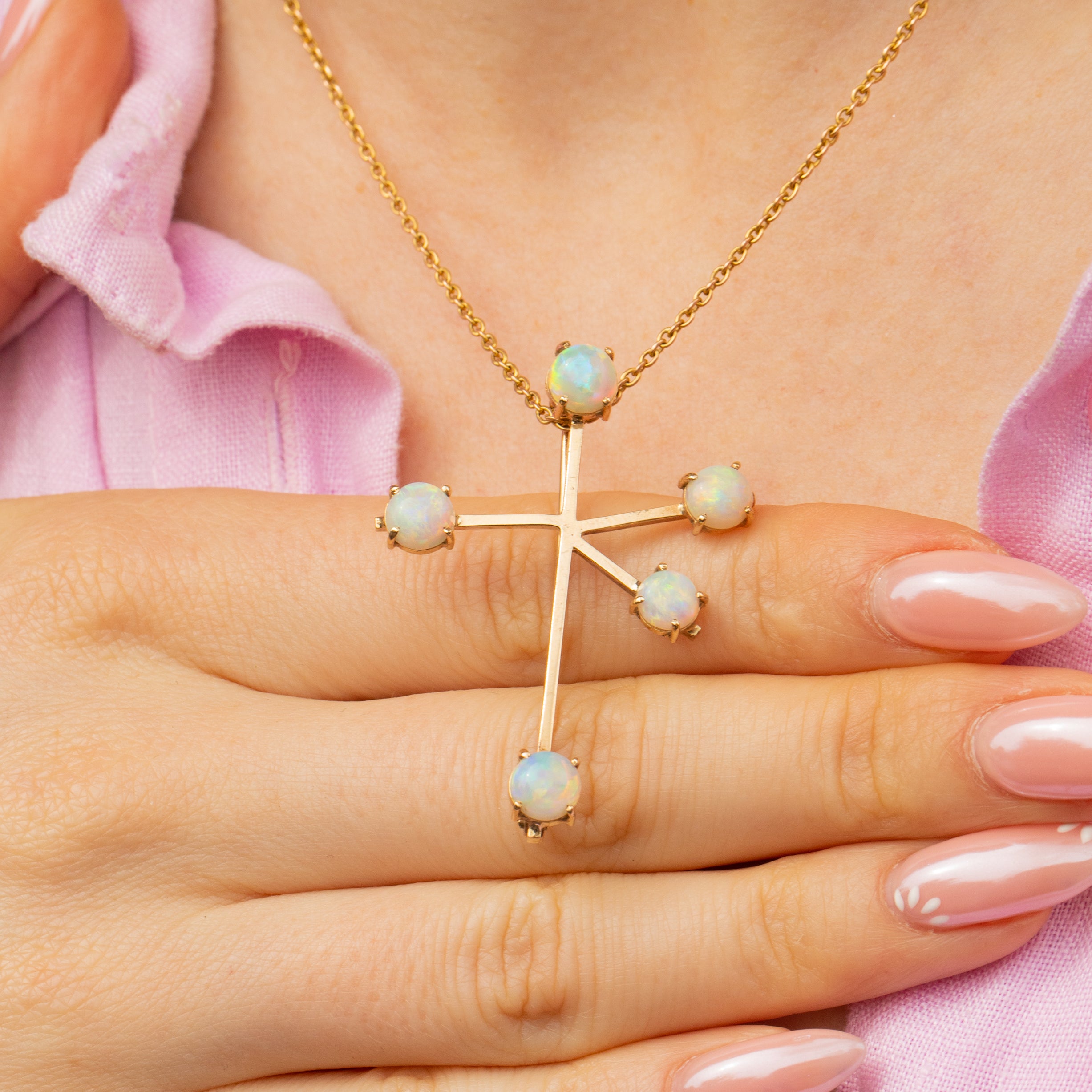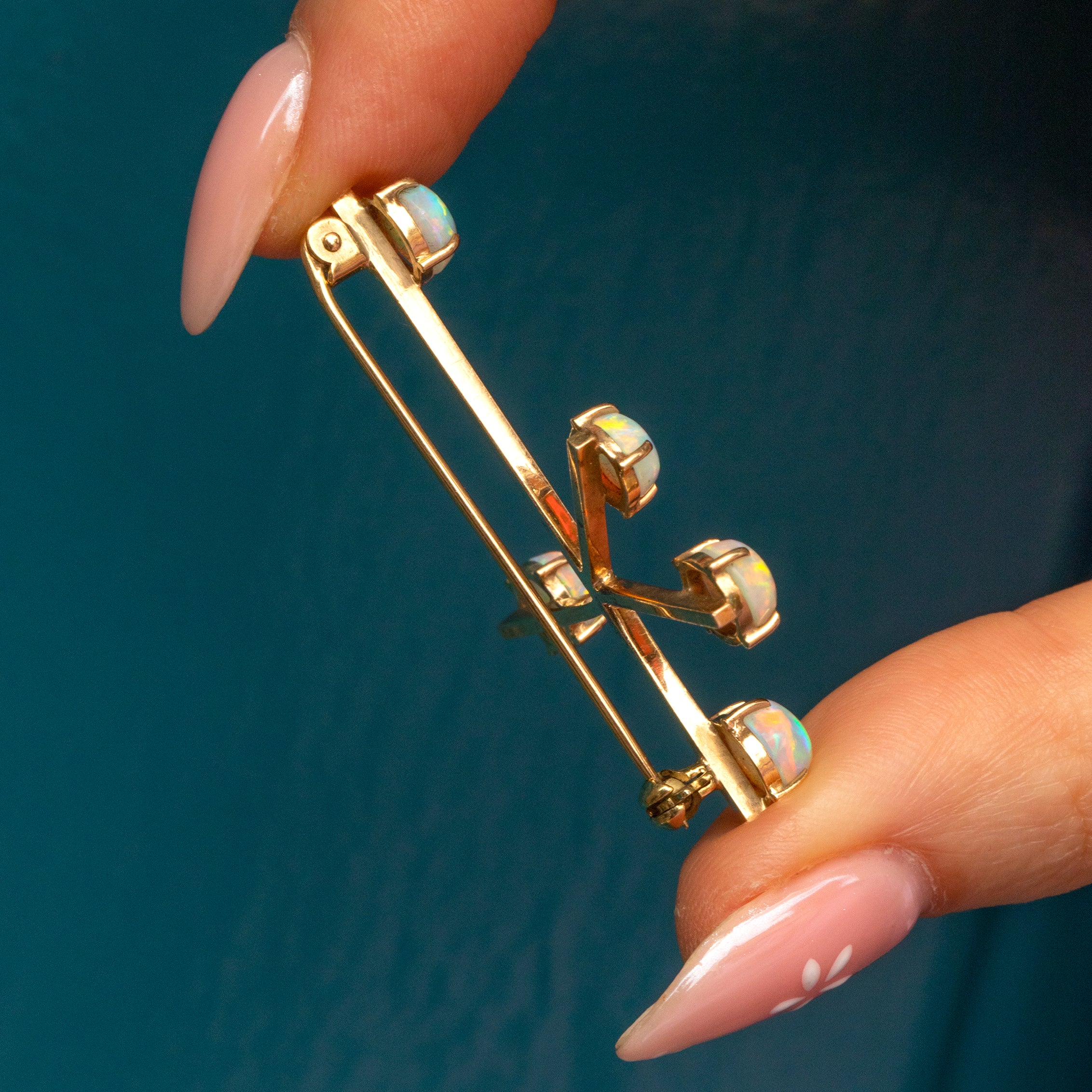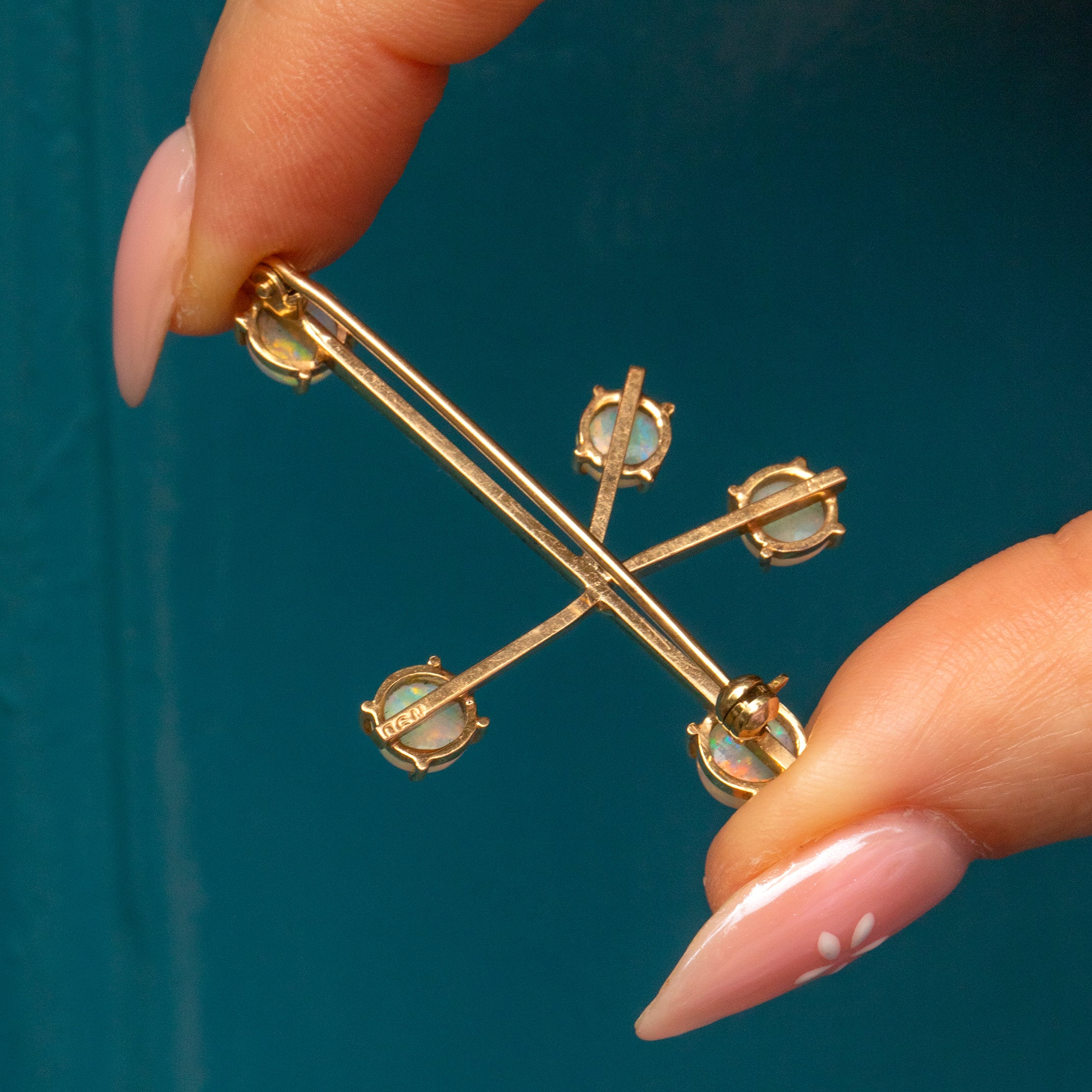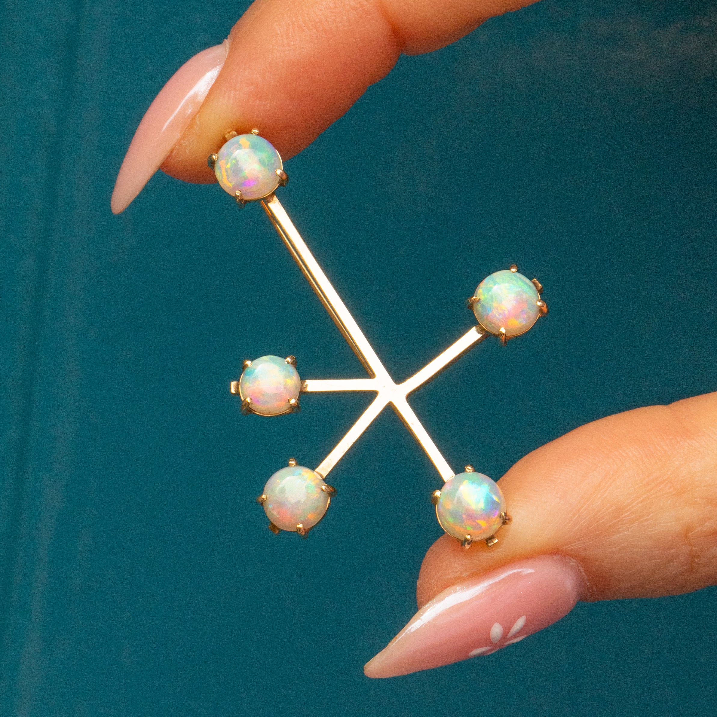 Add a touch of intrigue to your repertoire with this antique Opal Southern cross constellation brooch! Her unique form is crafted of buttery 9ct Gold with each end adorned with a vivacious Opal, swimming in iridescent hues.