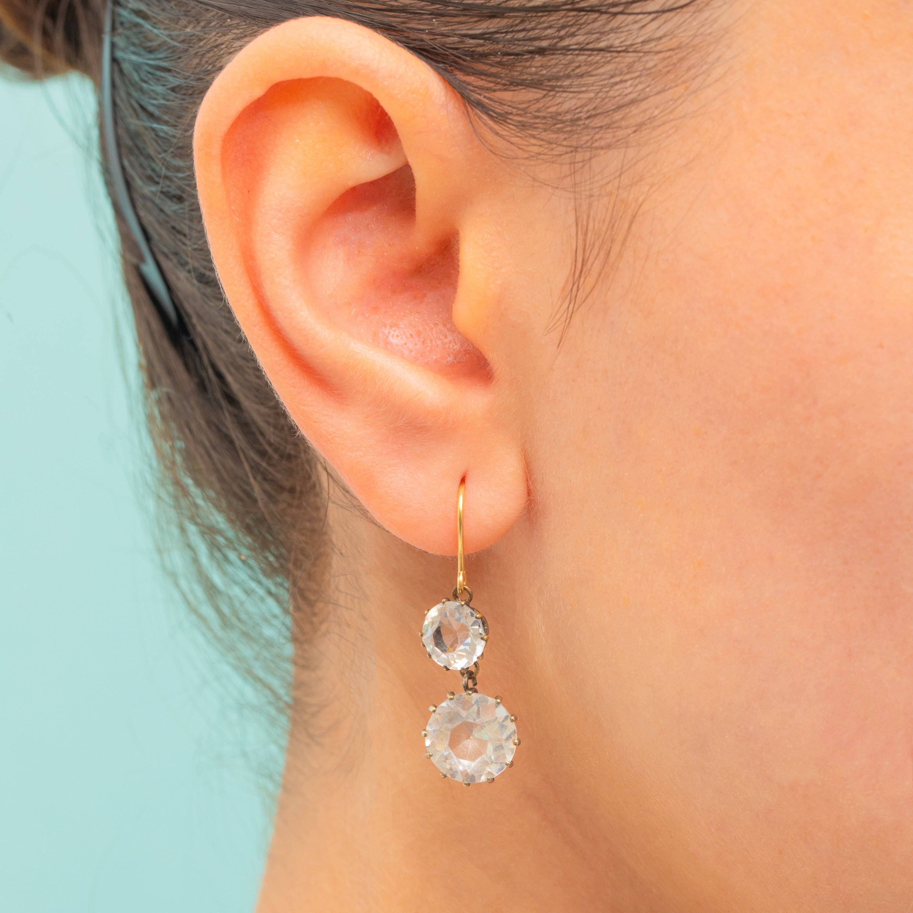 Each antique earring suspends two graduating Paste stones, each one faceted gorgeously and presenting a dazzling radiance as it catches the light. Complete with buttery 9ct Gold hooks, these Victorian earrings dance with movement as they perch beneath your lobes and are perfect for adding a touch of glamour to any attire!