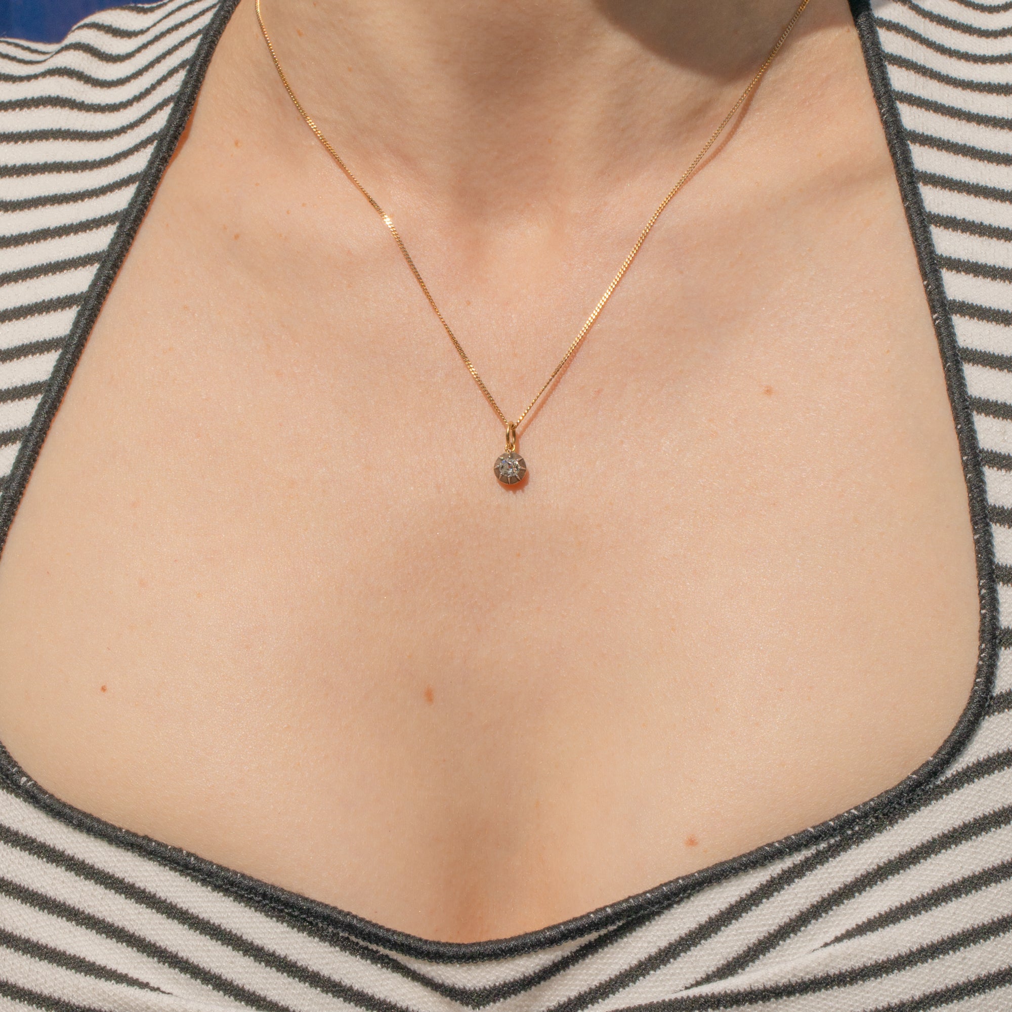 The 0.20ct Diamond dazzles and will look stunning once suspended from antique chain across your décolletage. Ensure she takes centre stage and pair her with your favourite dressy outfit. This Diamond will take your breath away!