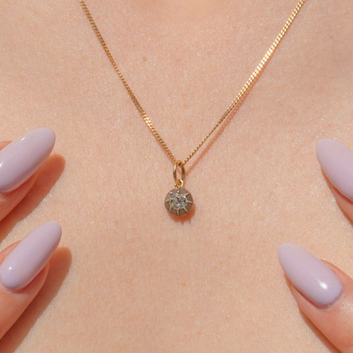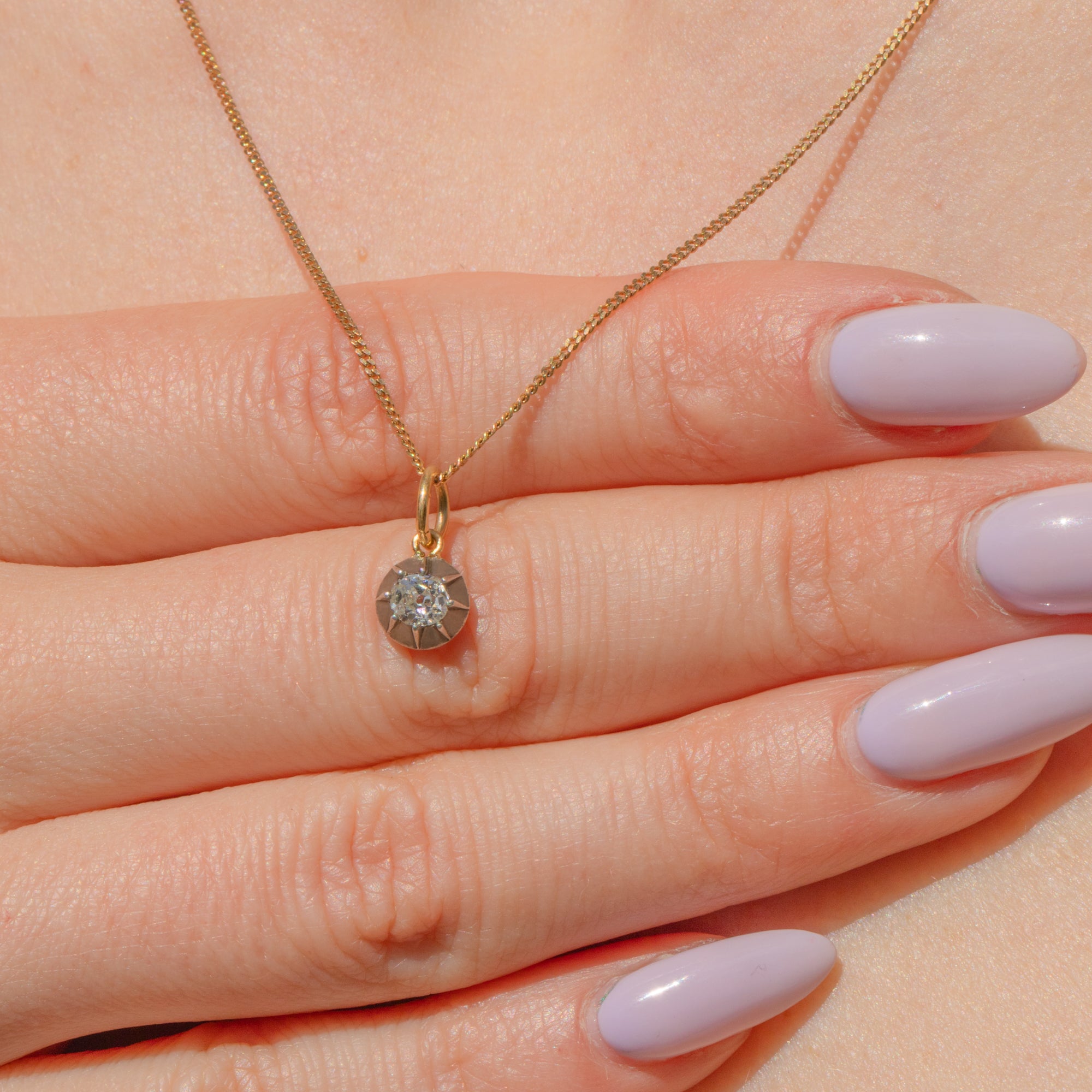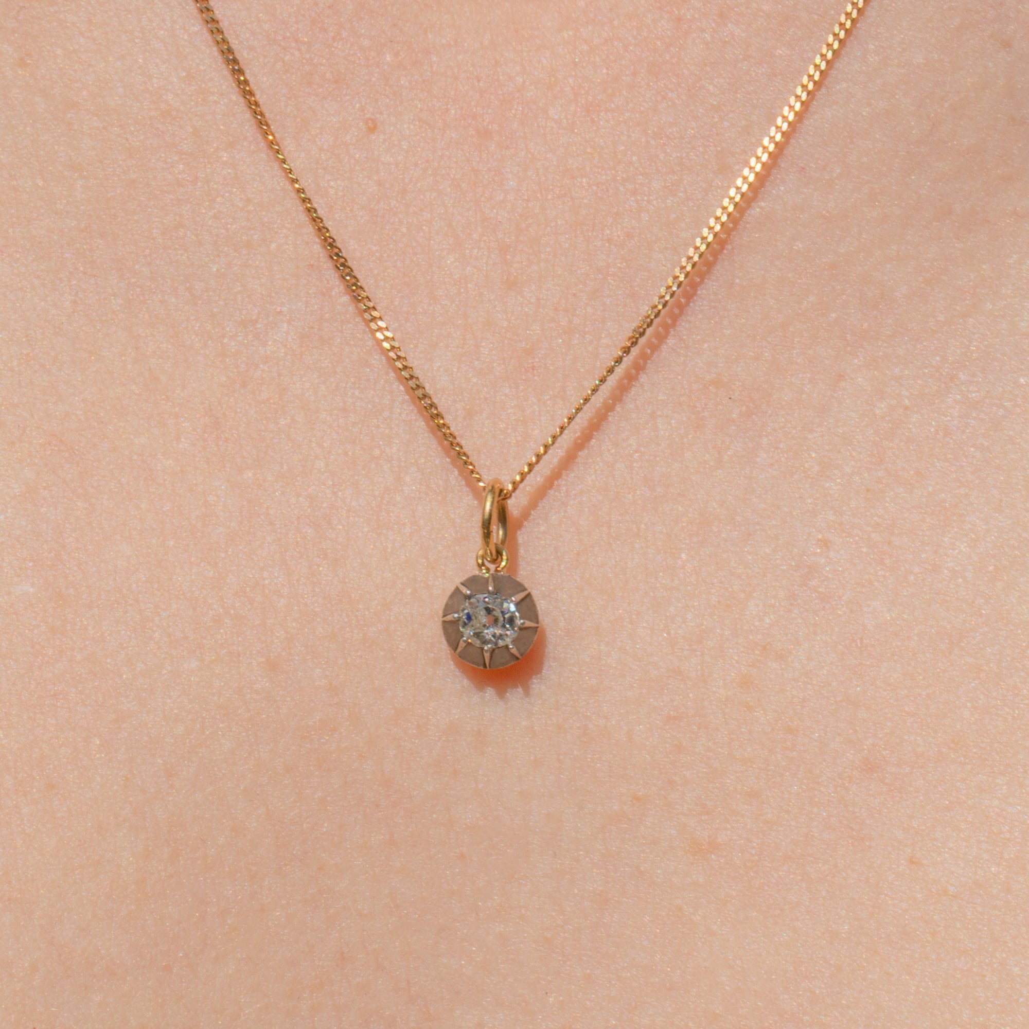 EXCELLENT. This antique Peruzzi old-mine cut Diamond charm is in excellent condition. The Diamond is securely set and free from fleabites or abrasions, she is guaranteed to last a lifetime. The Diamond is radiant as ever, which is incredible when considering her age. Need we say more?!