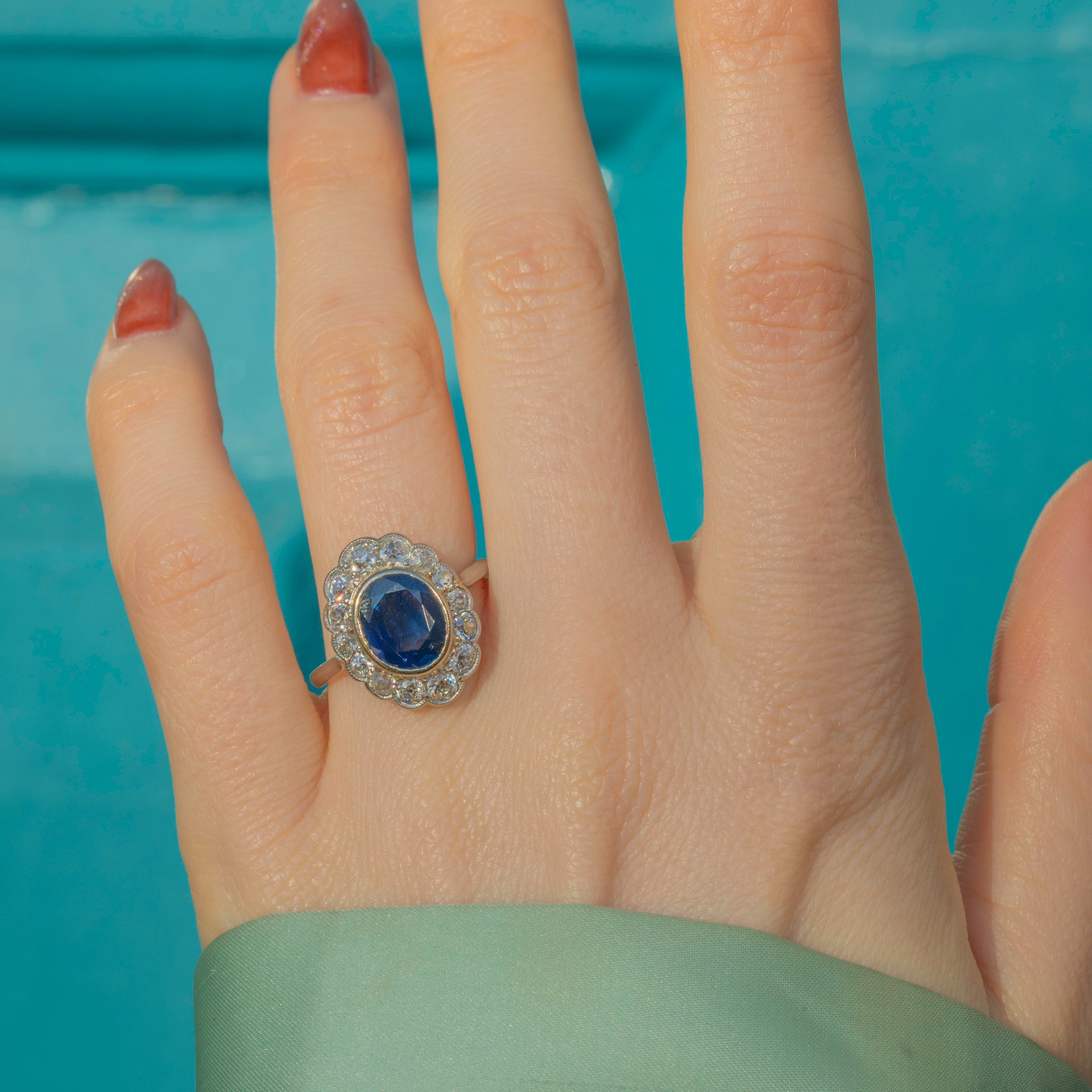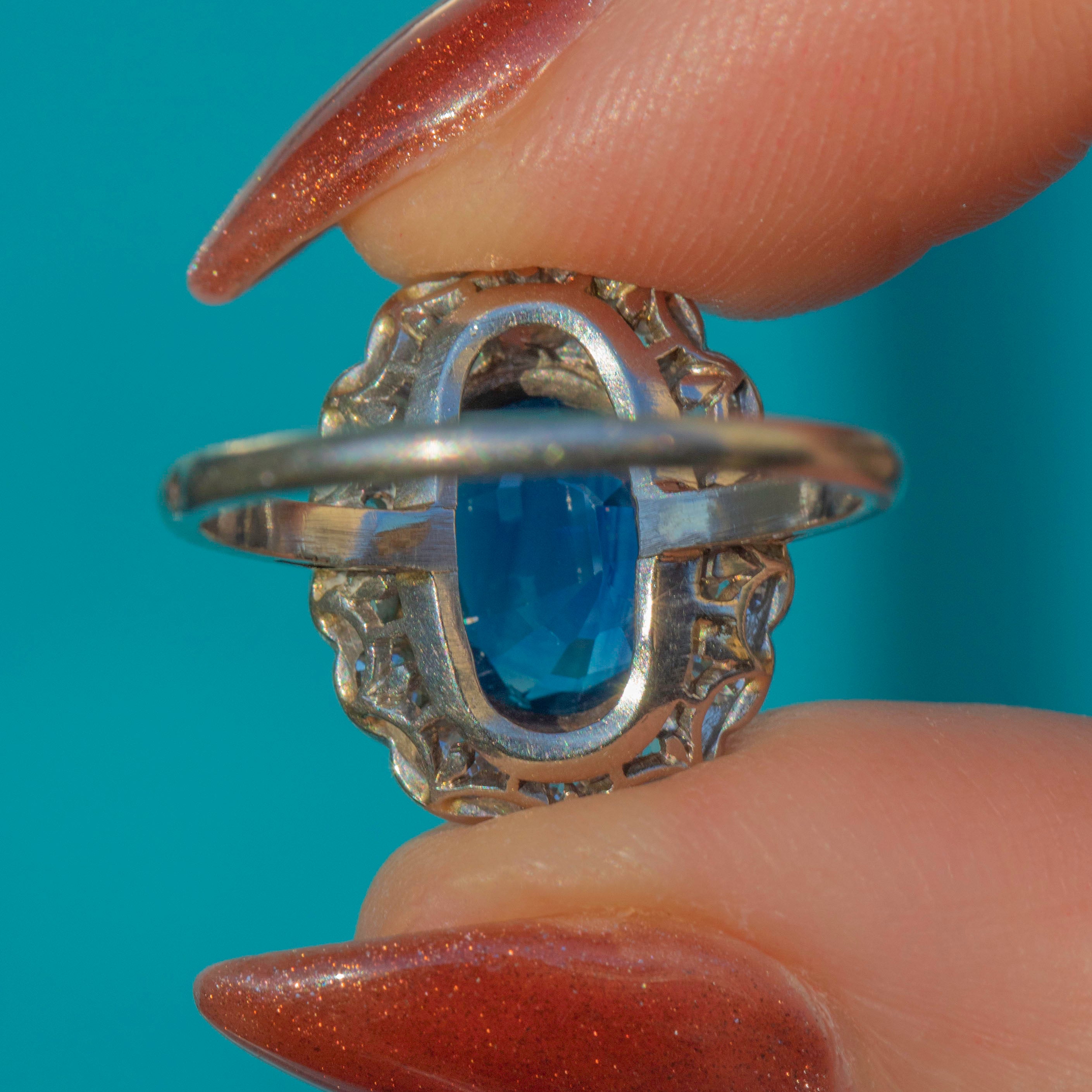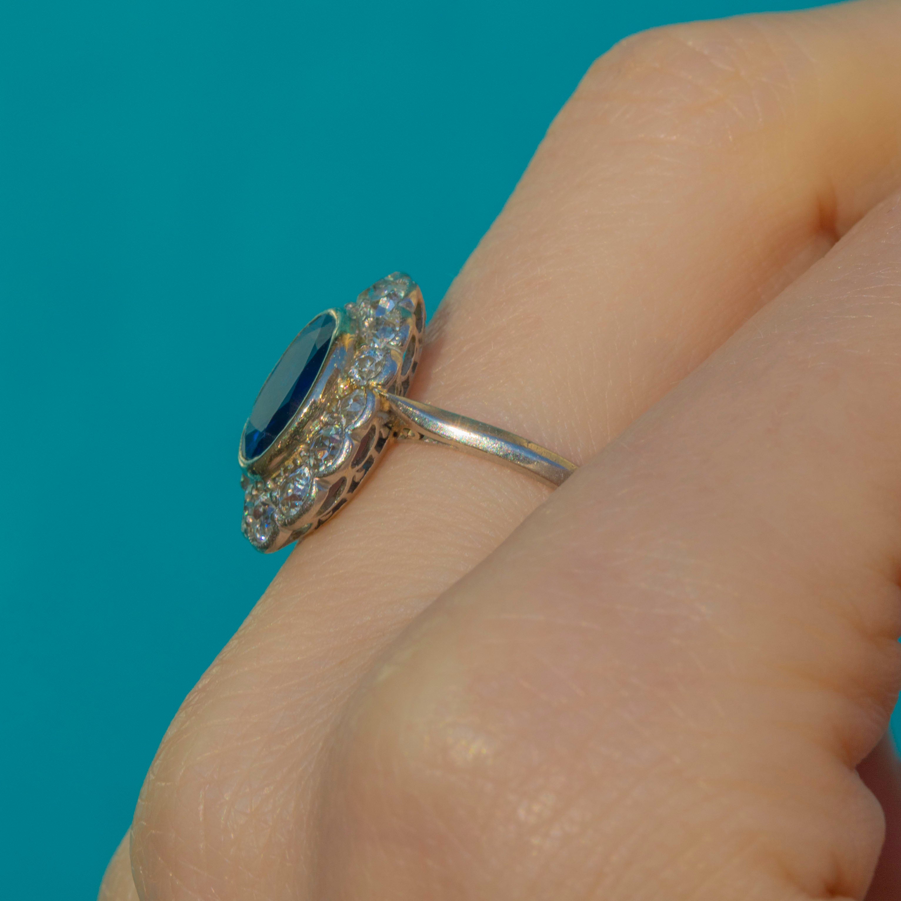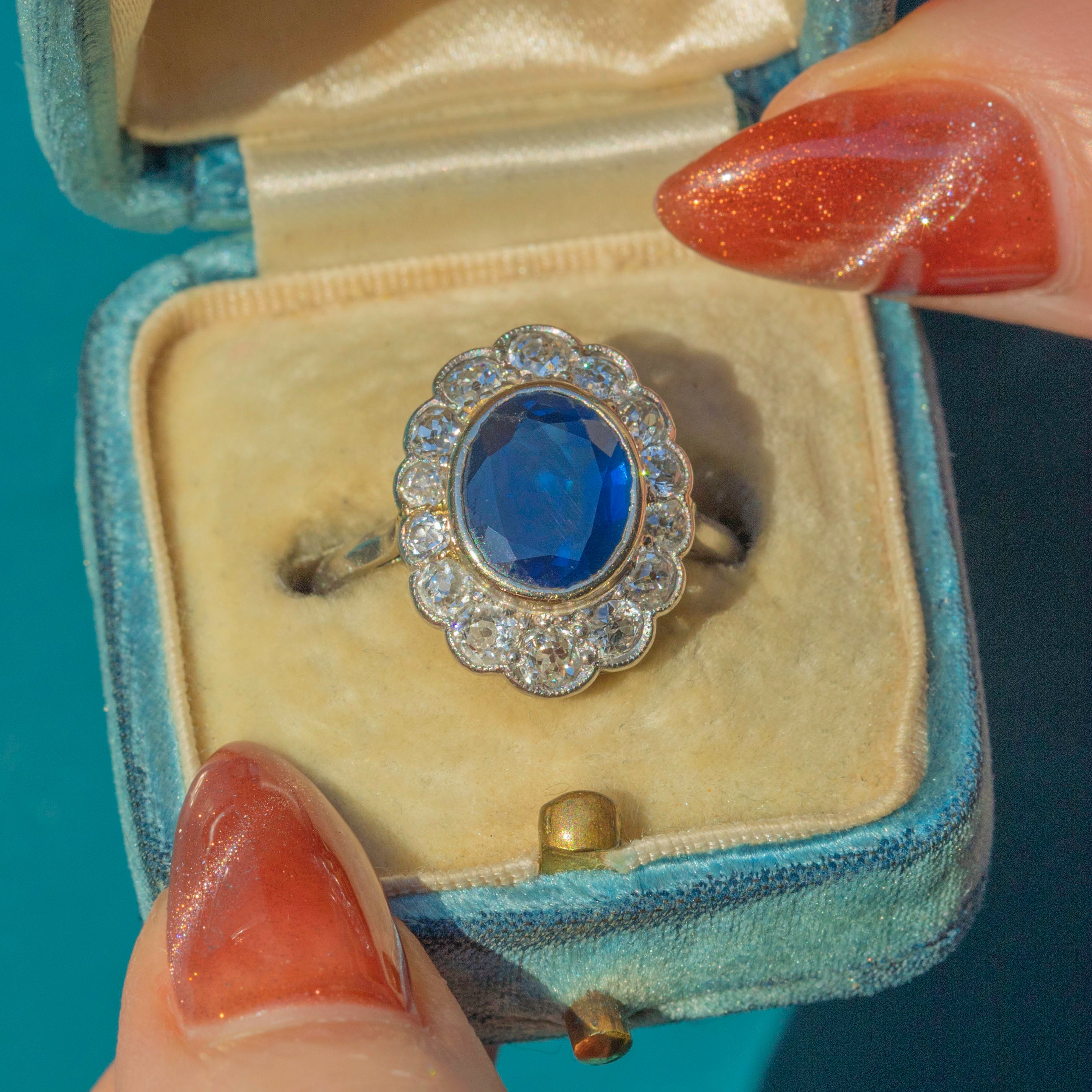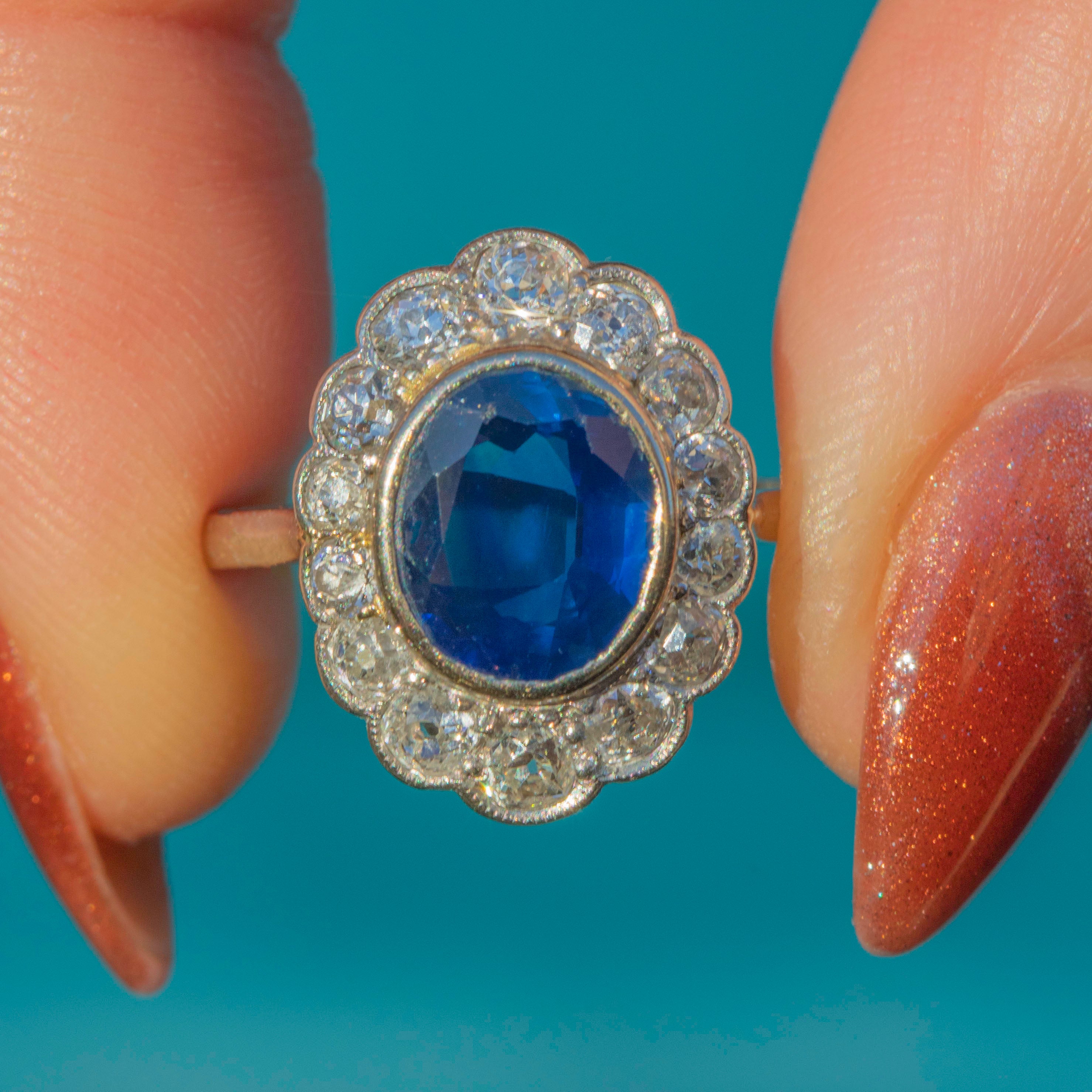 Antique Platinum Natural Sapphire Diamond Oval Cluster Ring, 2.15ct Sapphire