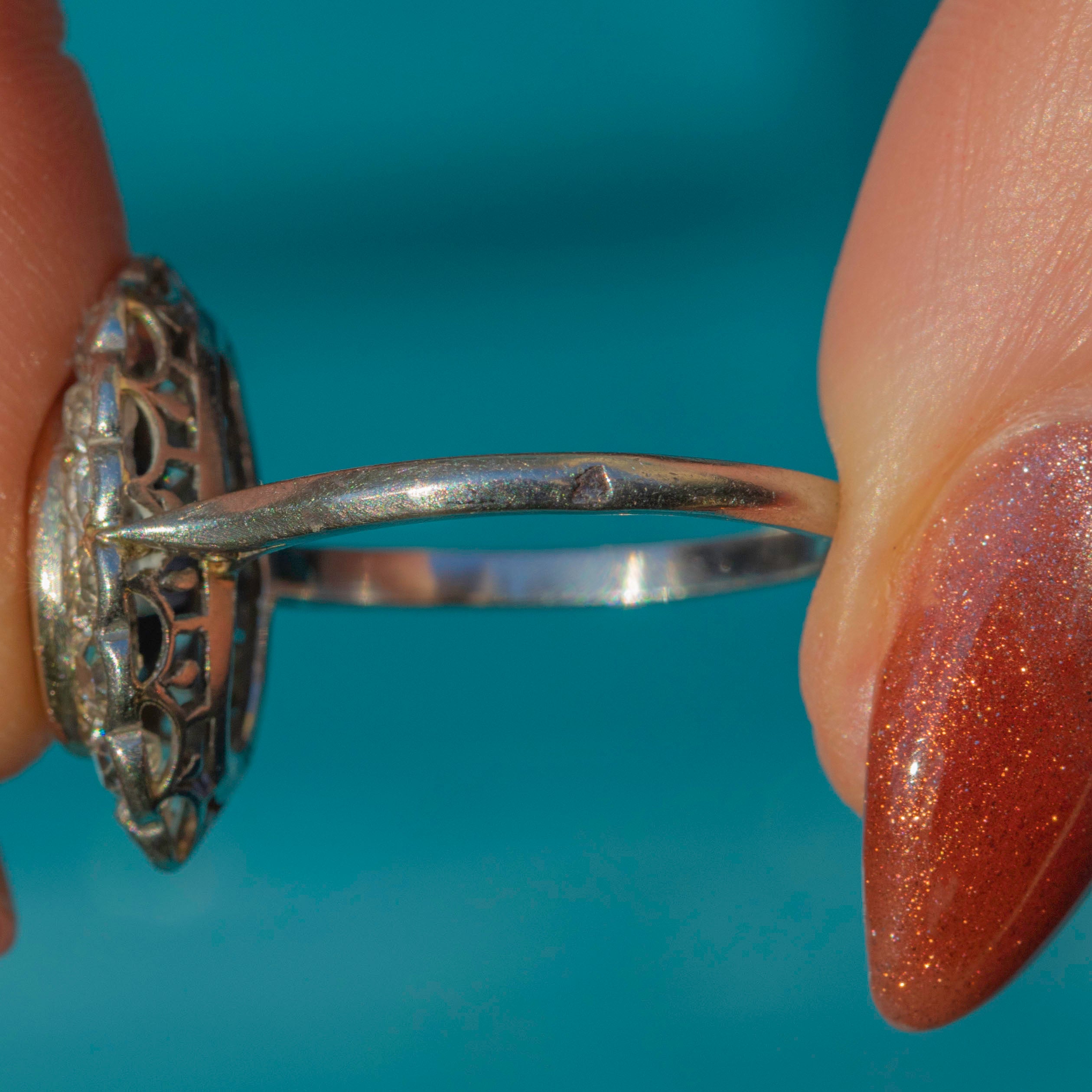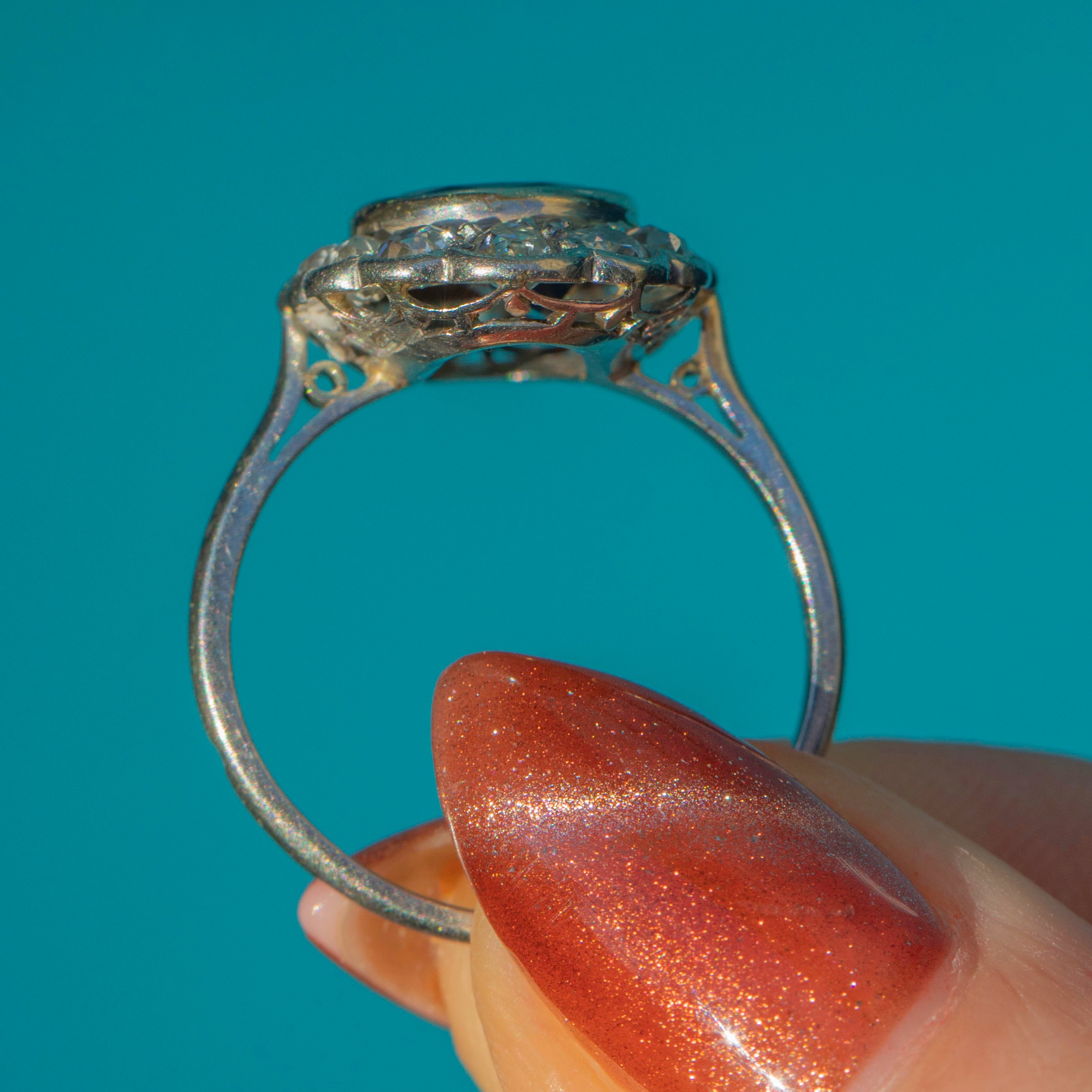 Each Diamond is set within lustrous Platinum illusion settings, with a gorgeous sheen and intricately detailed gallery. A wonderful option for an engagement ring or as a standalone antique piece for your curated collection, this Edwardian Sapphire and Diamond cluster ring is a must-have piece!