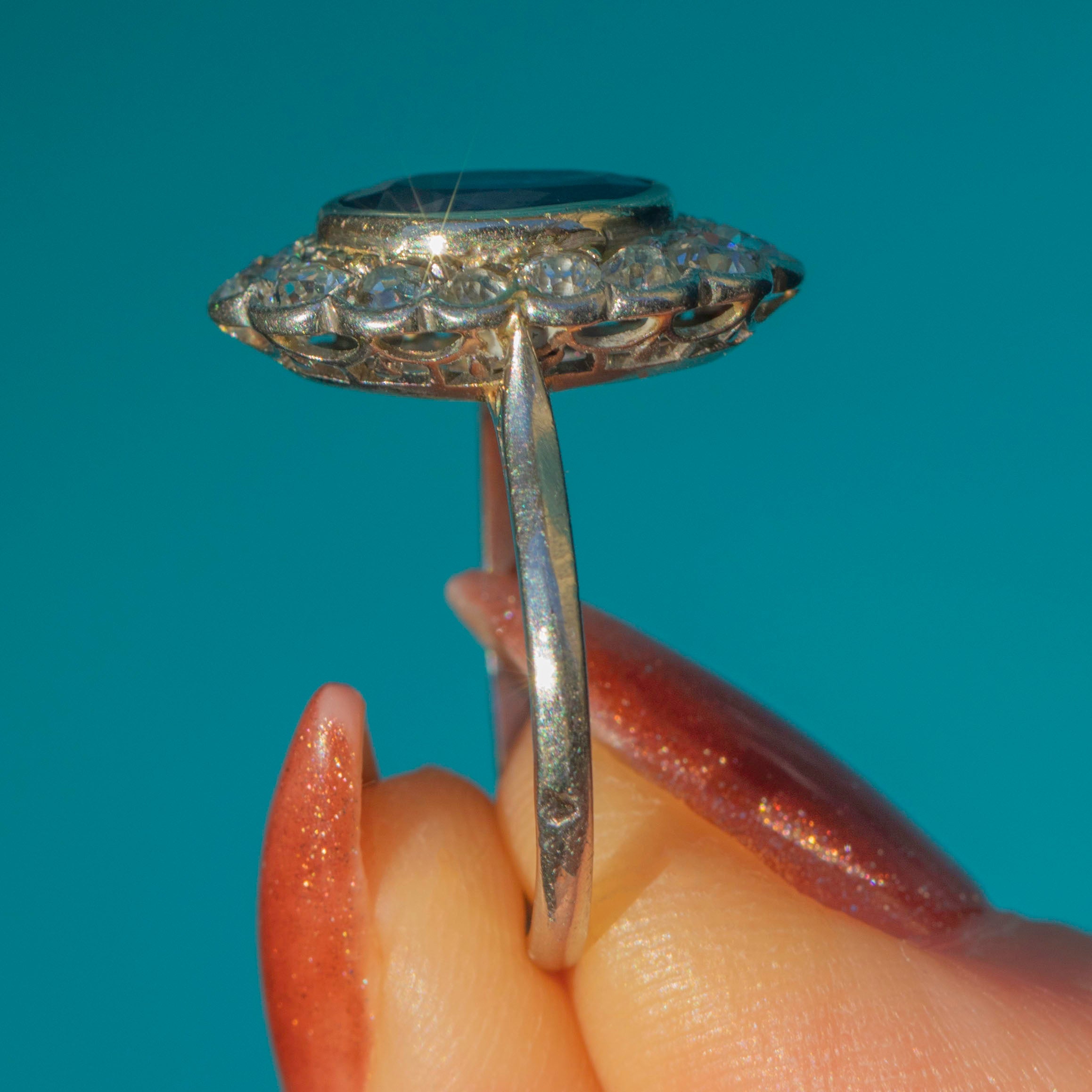 This antique Platinum natural Sapphire and Diamond cluster ring is a sight to behold!