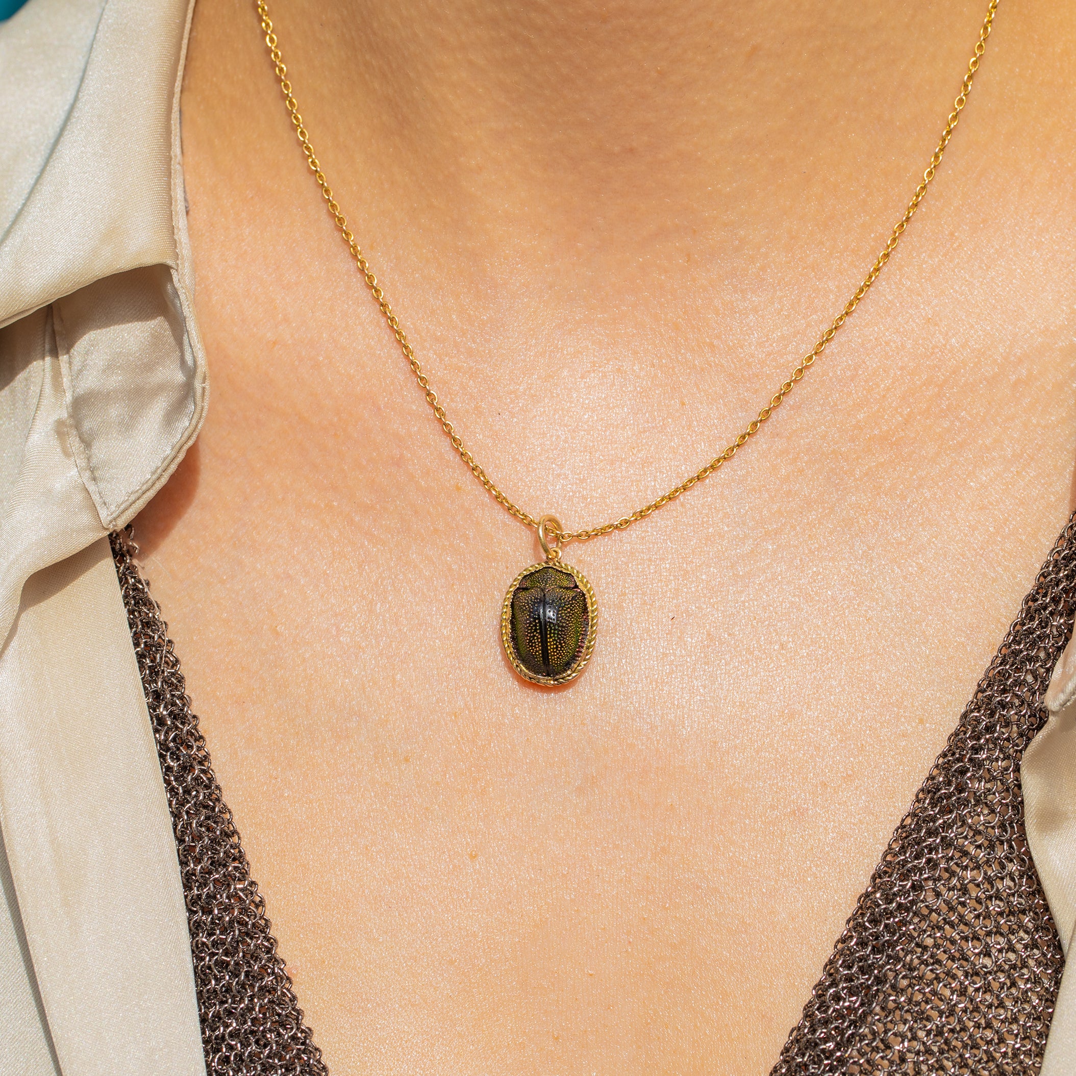 This particular beetle is set in 800 Silver, and boasts an iridescent green shimmer that catches the light beautifully. Scarab Beetles represent the circle of life and immortality, making this Victorian pendant all the more special.