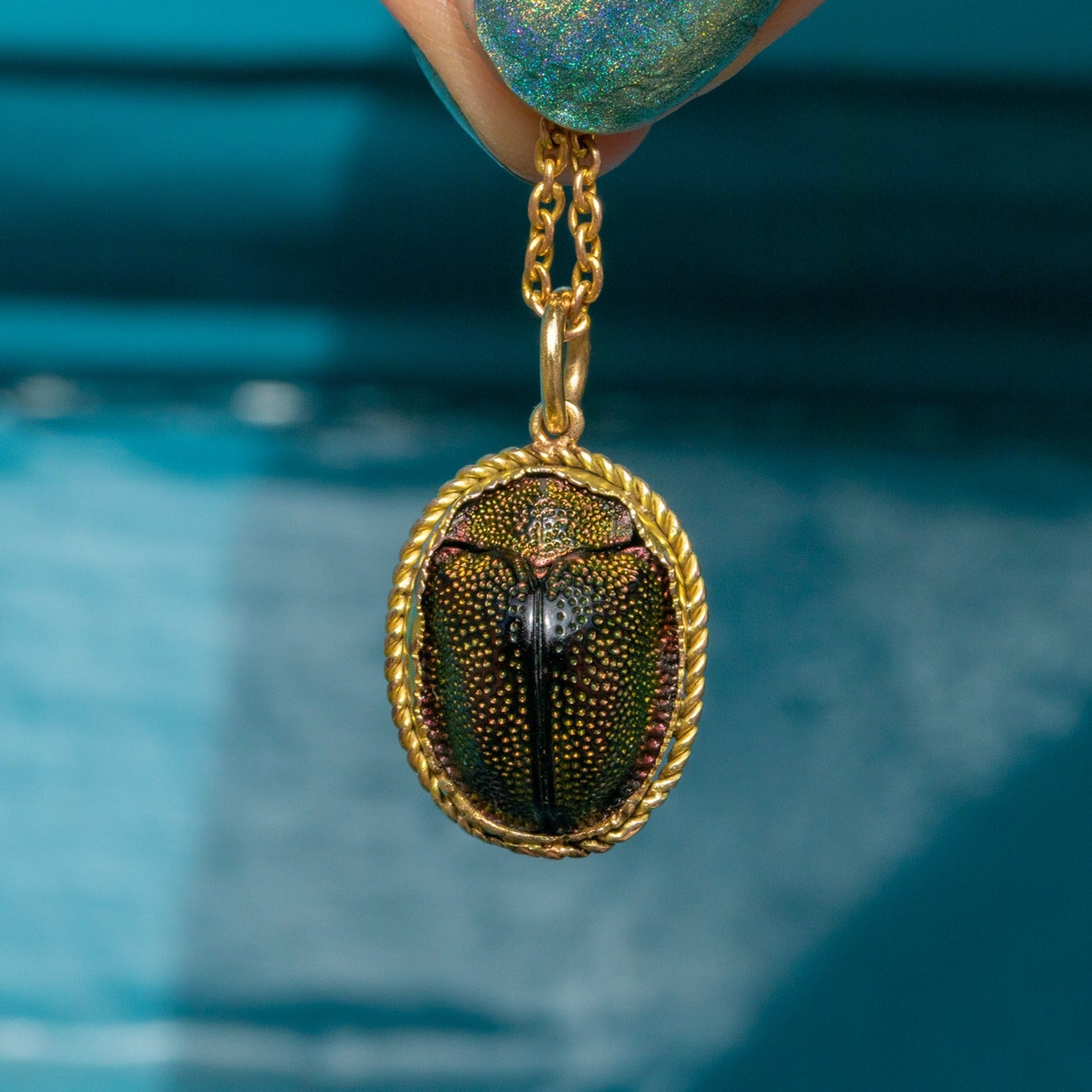 EXCELLENT: This antique scarab beetle pendant is in wonderful condition. The Beetle has been very well preserved, and sits securely in the bezel setting. This scarab has exceptional detail, exuding an iridescent green shimmer that comes to life beneath the light. Ready to wear from the box, simply suspend from a fine Gold chain and enjoy this Victorian Scarab beetle for a lifetime to come.