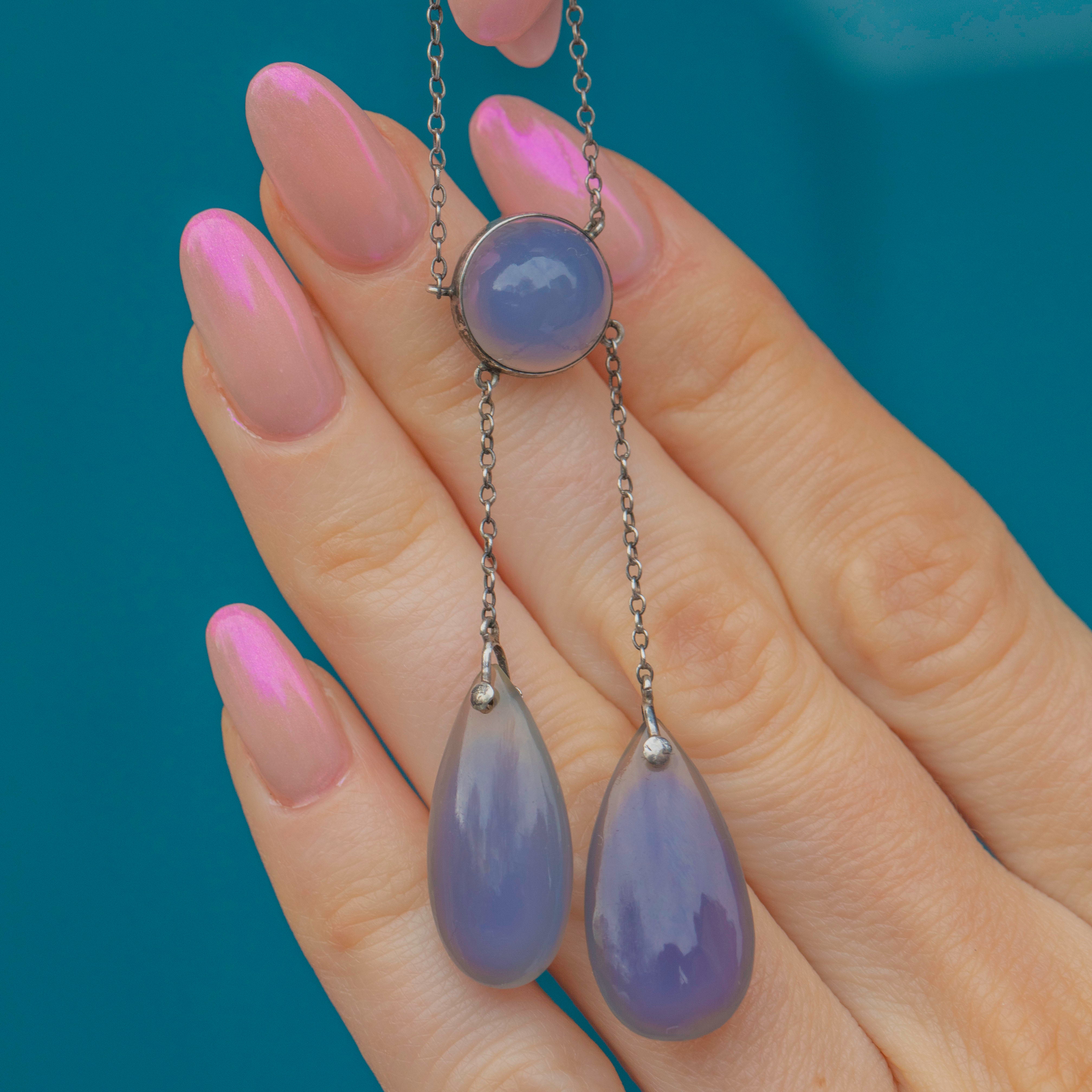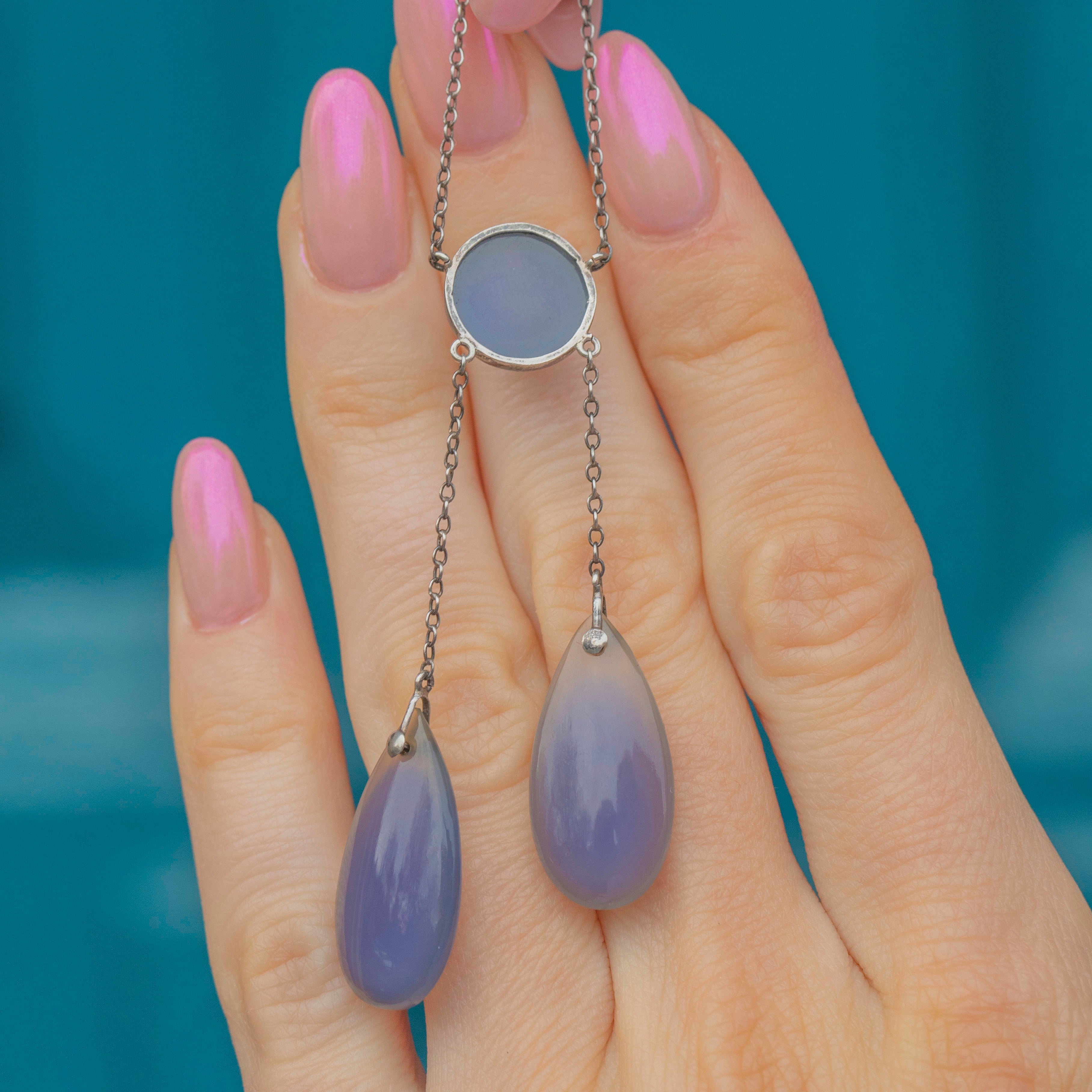 VERY GOOD-EXCELLENT: This antique Silver blue Chalcedony negligee drop necklace is in very good-excellent condition. Her Chalcedony stones are free from any visible signs of age, and suspend securely from their Silver chain. Her Silver settings have built up a slight patina commensurate with age, but with little else to note, she is in great condition.