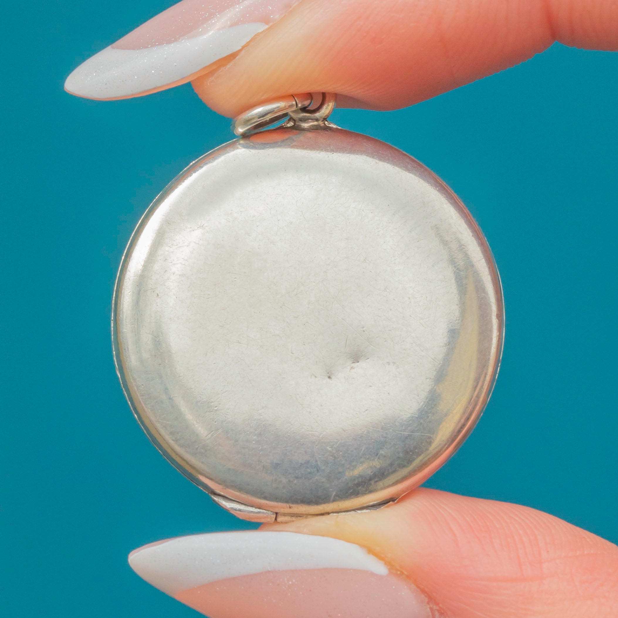 VERY GOOD-EXCELLENT: This antique Silver blue Guilloché Enamel locket is in wonderful condition. The Enamel is richly saturated, and her Silver is glossy. There are some dings on the back of the locket and some signs of wear inside, though this is minor. Closing with a nice 'click' and complete with a secure jump ring, this Victorian locket can be worn with confidence!