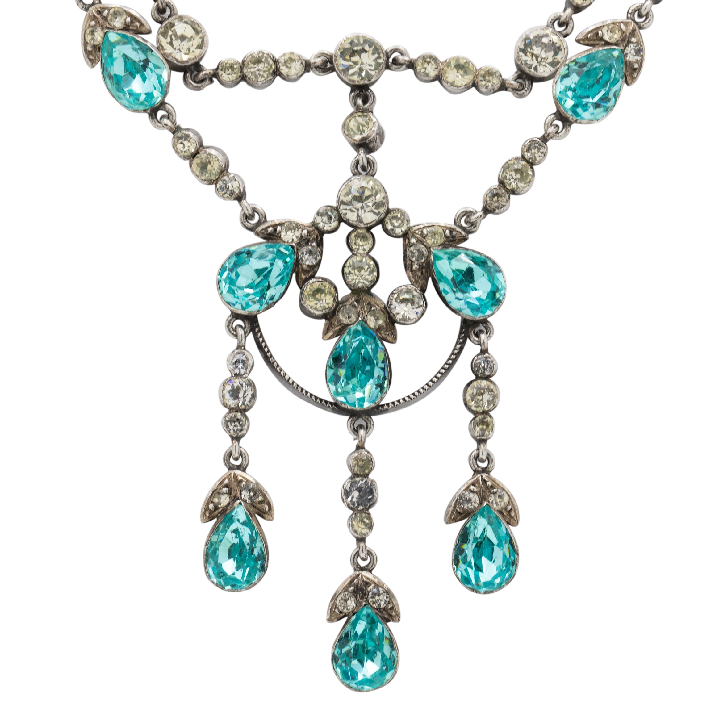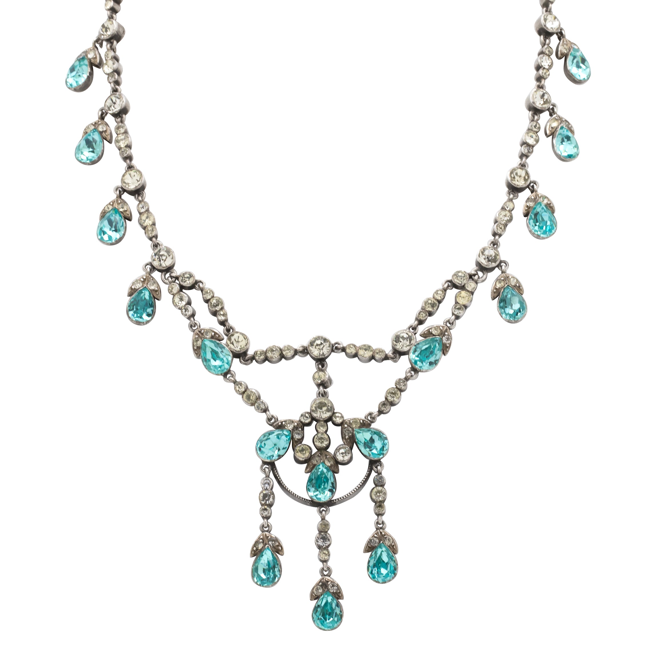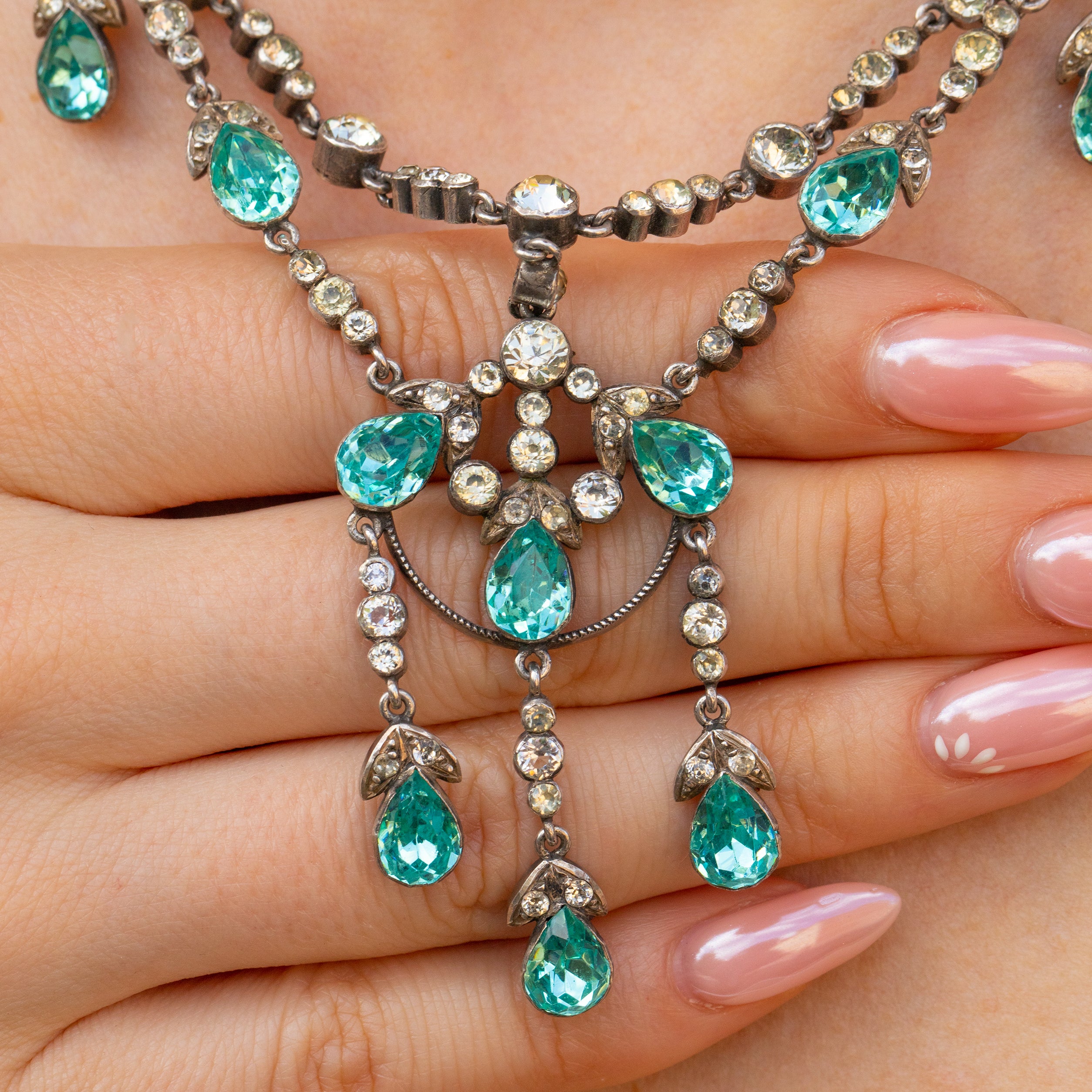 EXCELLENT. This antique Silver blue Paste festoon necklace is in excellent condition. The Paste gems are secure and sparkle beautifully, each one free from any signs of wear. The back of the piece has smooth, domed details on the pear drops that sit comfortably against the skin. The piece has lasted beautifully well overall, with a secure bolt-ring providing a secure closure. There is very little wear to note, which is impressive for a piece of this age!