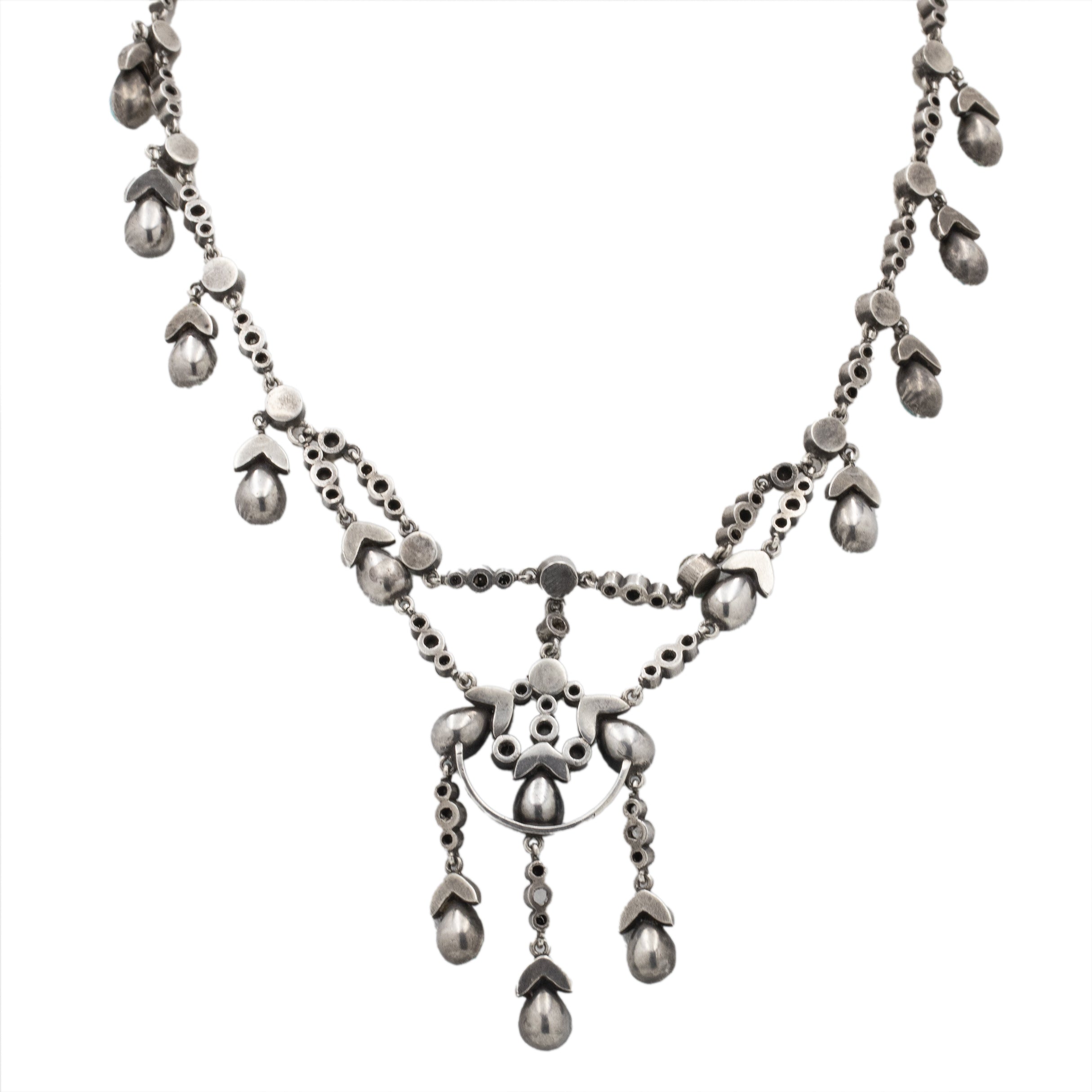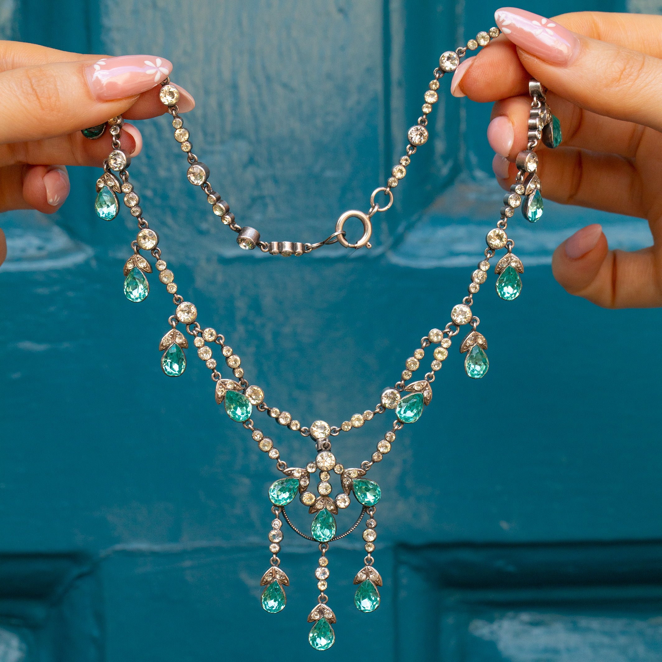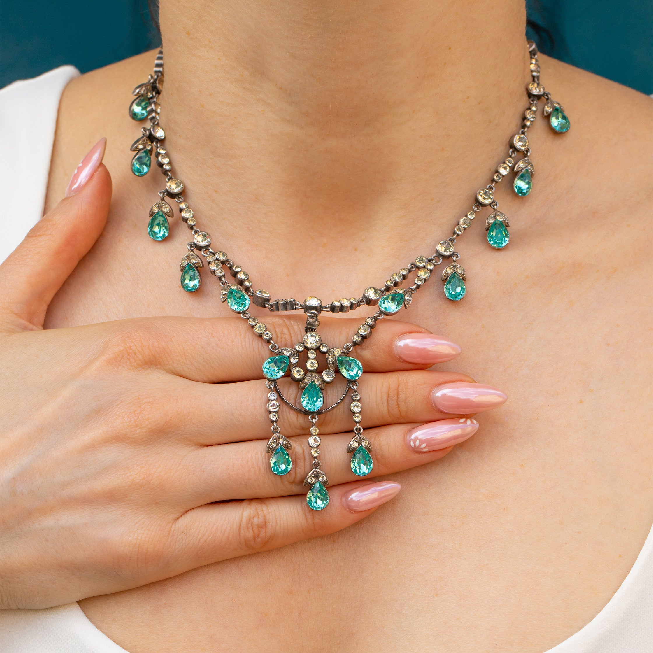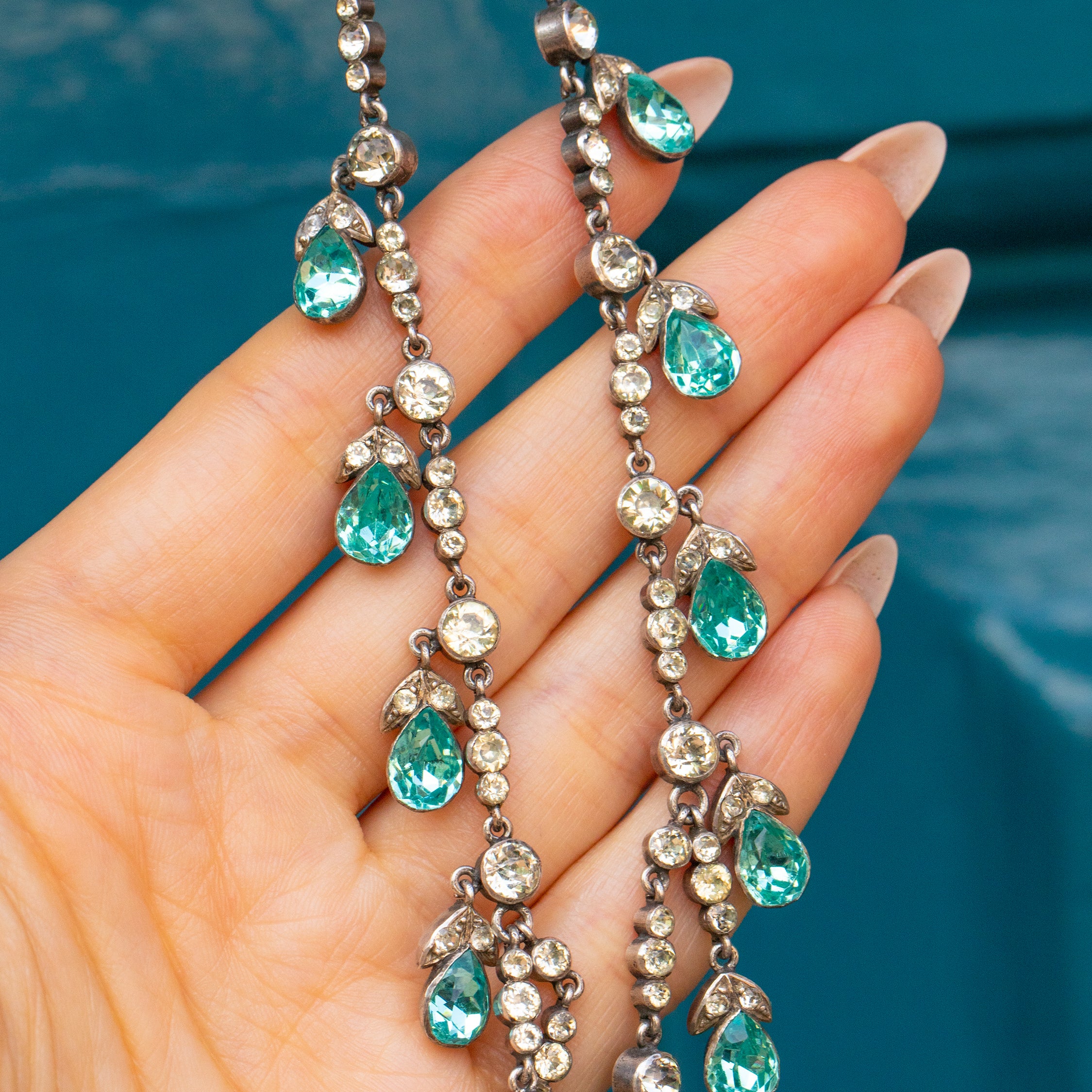EXCELLENT. This antique Silver blue Paste festoon necklace is in excellent condition. The Paste gems are secure and sparkle beautifully, each one free from any signs of wear. The back of the piece has smooth, domed details on the pear drops that sit comfortably against the skin. The piece has lasted beautifully well overall, with a secure bolt-ring providing a secure closure. There is very little wear to note, which is impressive for a piece of this age!