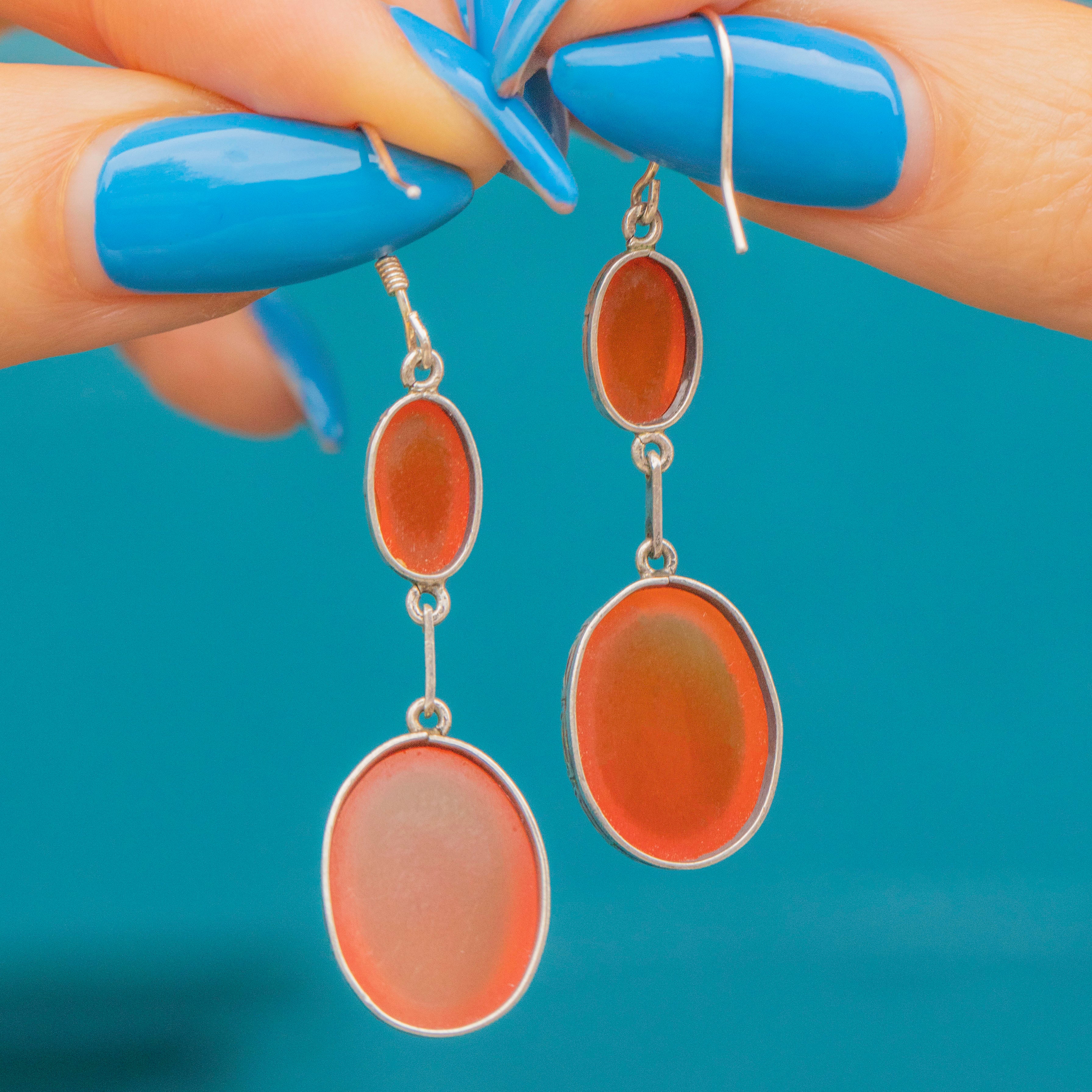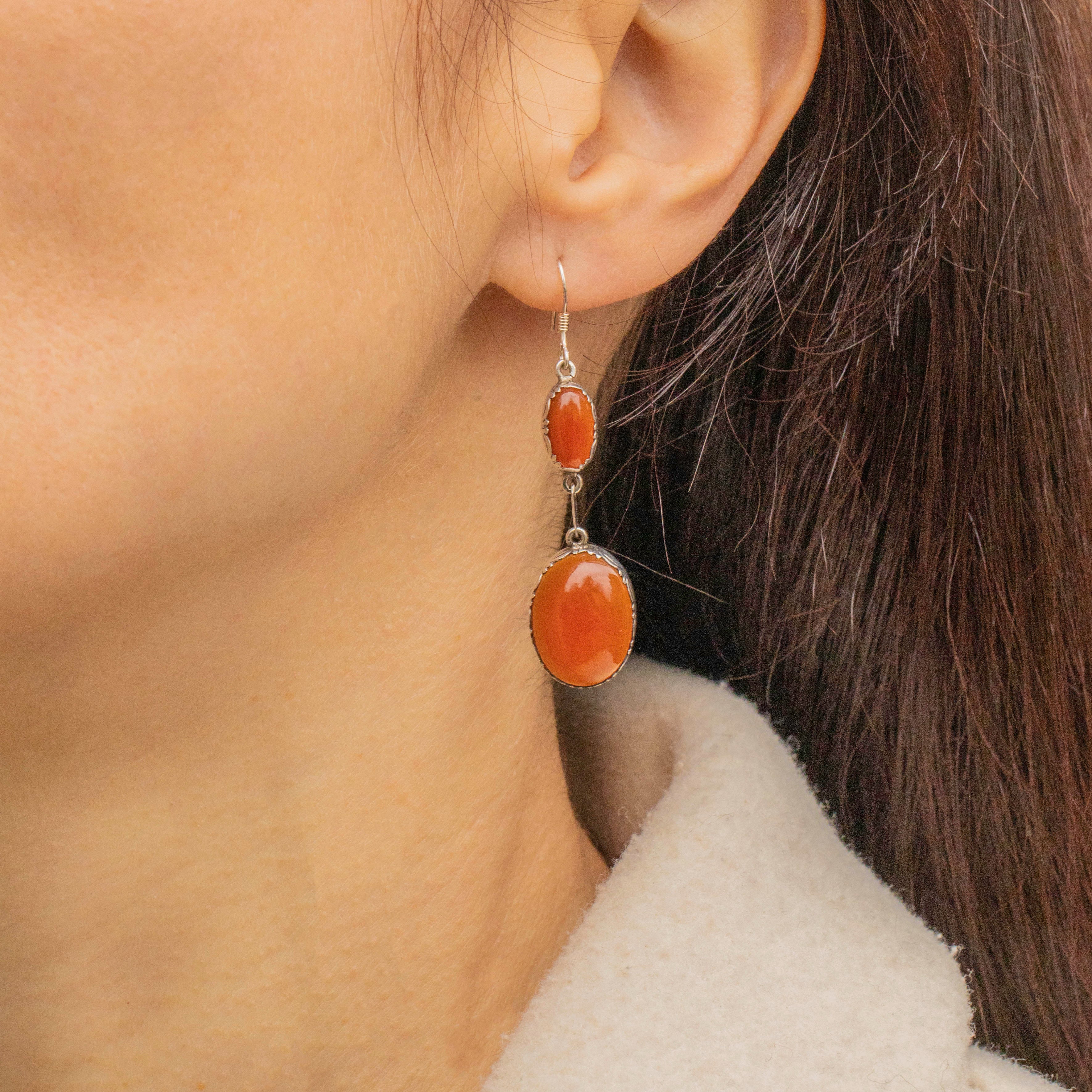 Crafted from supple Sterling Silver, these Victorian earrings each hold two vibrant Carnelians, radiating the most gorgeous rich honey-amber hues. Each Carnelian Cabochon is set securely within an intricately detailed Silver bezel and suspend from your lobes with a graceful swing.