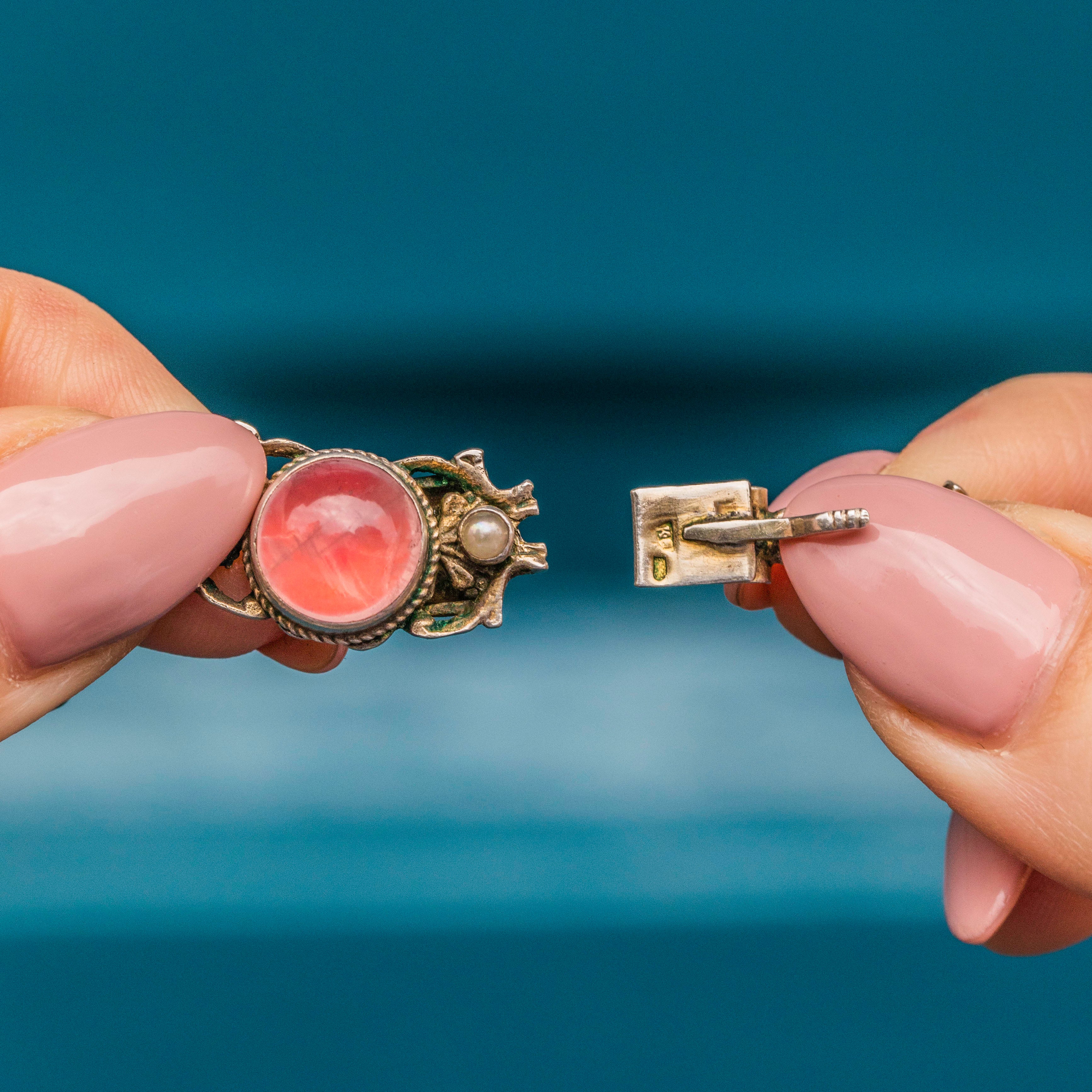 VERY GOOD. This antique Silver foiled Rose Quartz necklace is in very good condition. The Rose Quartz cabochons are smoothly domed and free from chips or scuffs, with their foiling remaining intact. The Pearls are all present and have retained their natural nacre and brilliant sheen. There is some subtle wear on the back of the necklace, commensurate with age, but the necklace feels comfortable against the skin. The hallmarks on the tongue have obscured over time, but it still closes securely. The links are all firmly connected and the details on the front are free from dings. This phenomenal and rare antique necklace is ready to be worn and cherished for years to come!