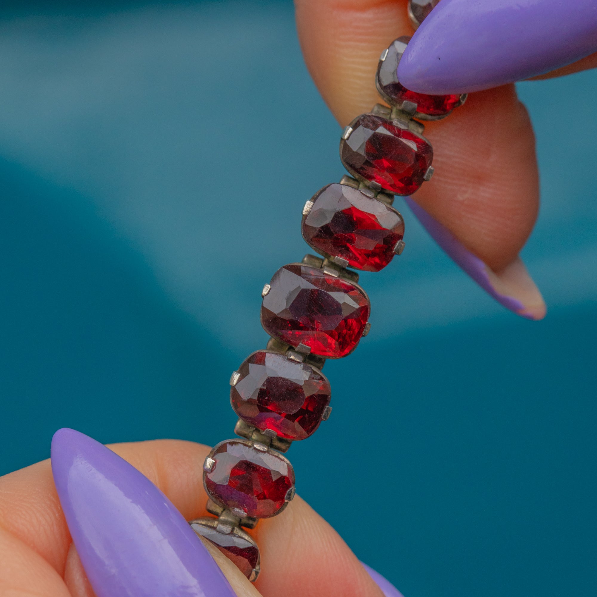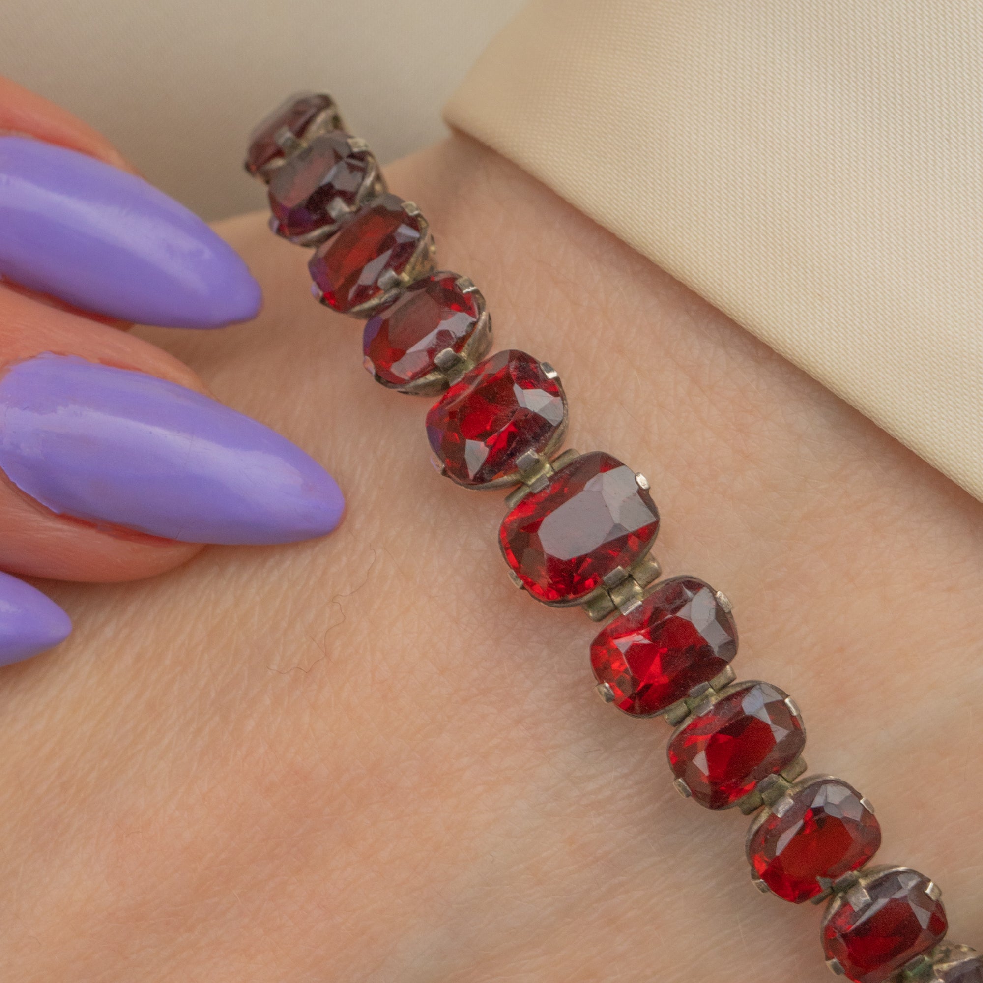 GOOD-VERY GOOD: This antique Silver Garnet Graduating bracelet is in very good condition throughout. All eleven Garnets are secure in their claw settings, with crisp facets. As a whole, her Garnets have survived with only very minor wear to their surface. The second Garnet from the central larger Garnet has a tiny chip, however, as each is so vibrant, this takes nothing away from their beauty! The Silver links are securely connected, with a tongue clasp promising confident wear.