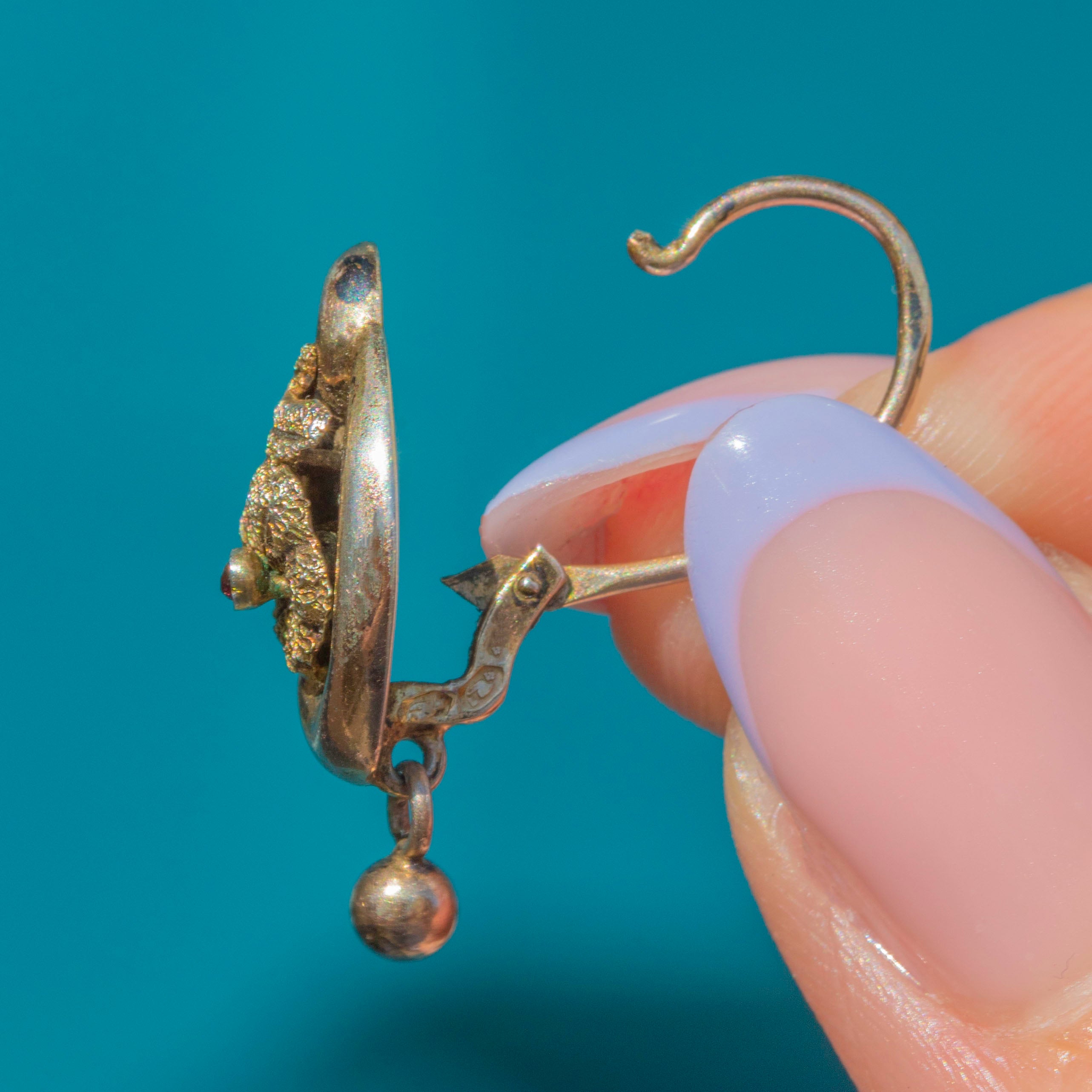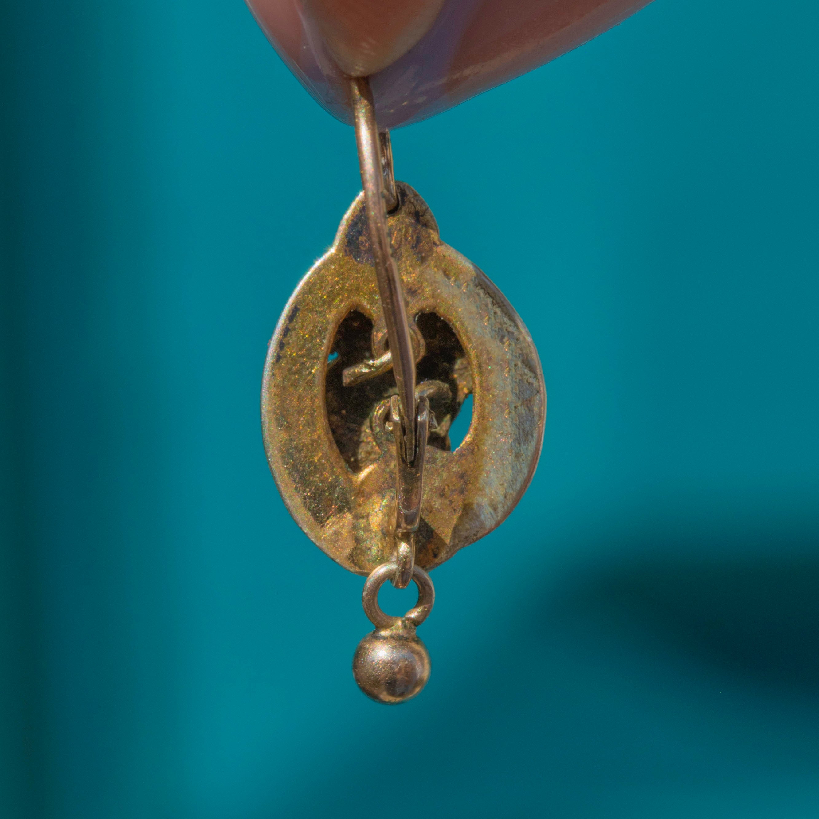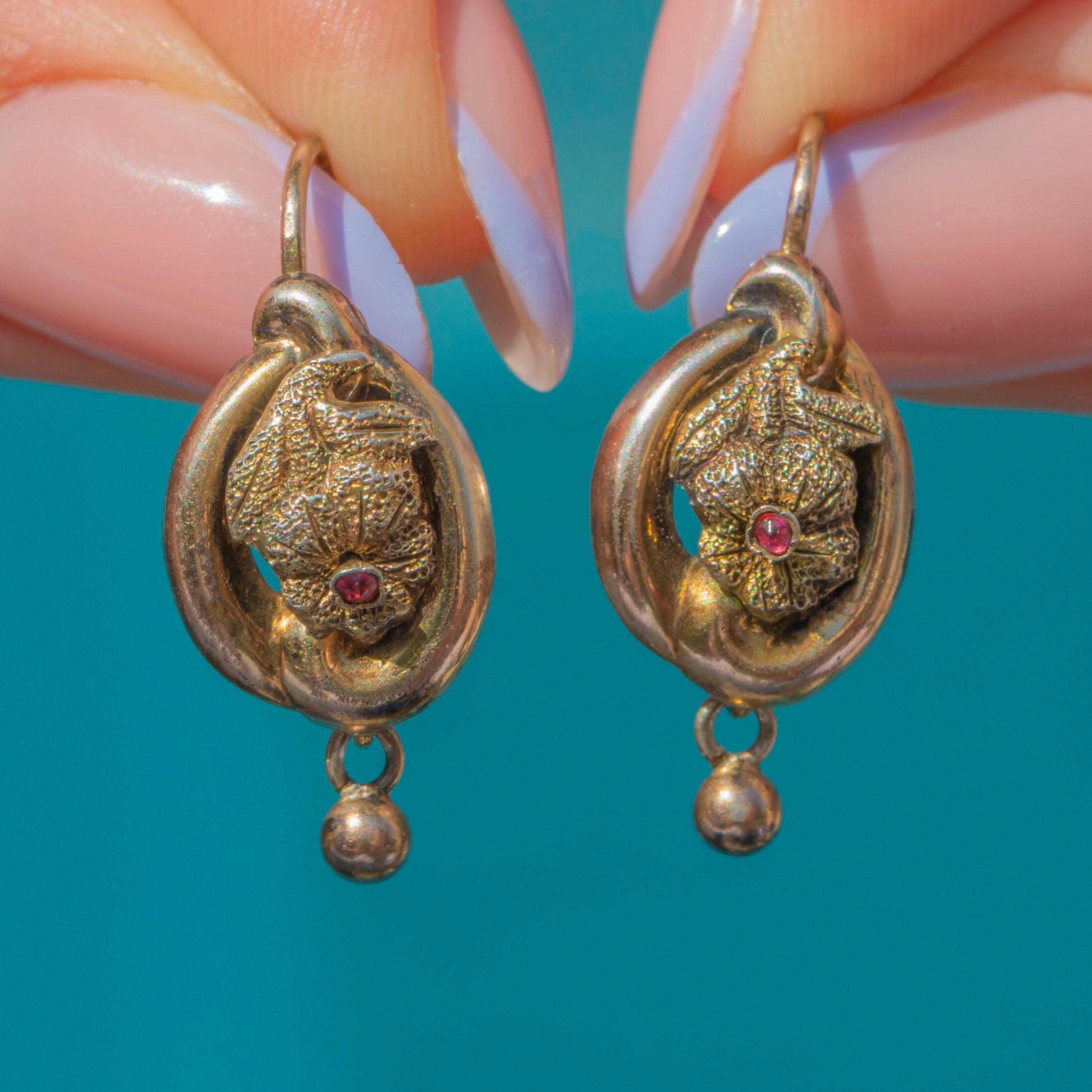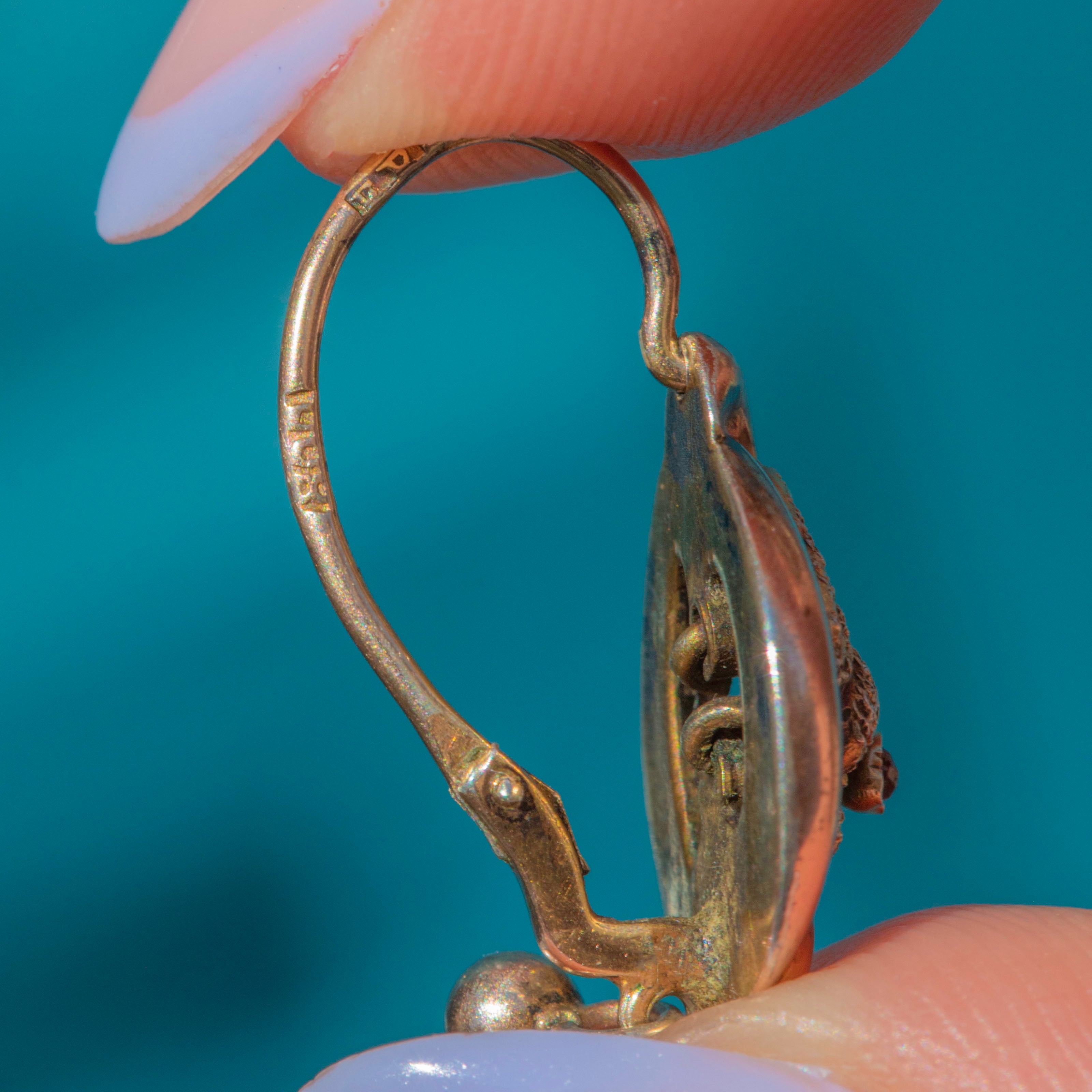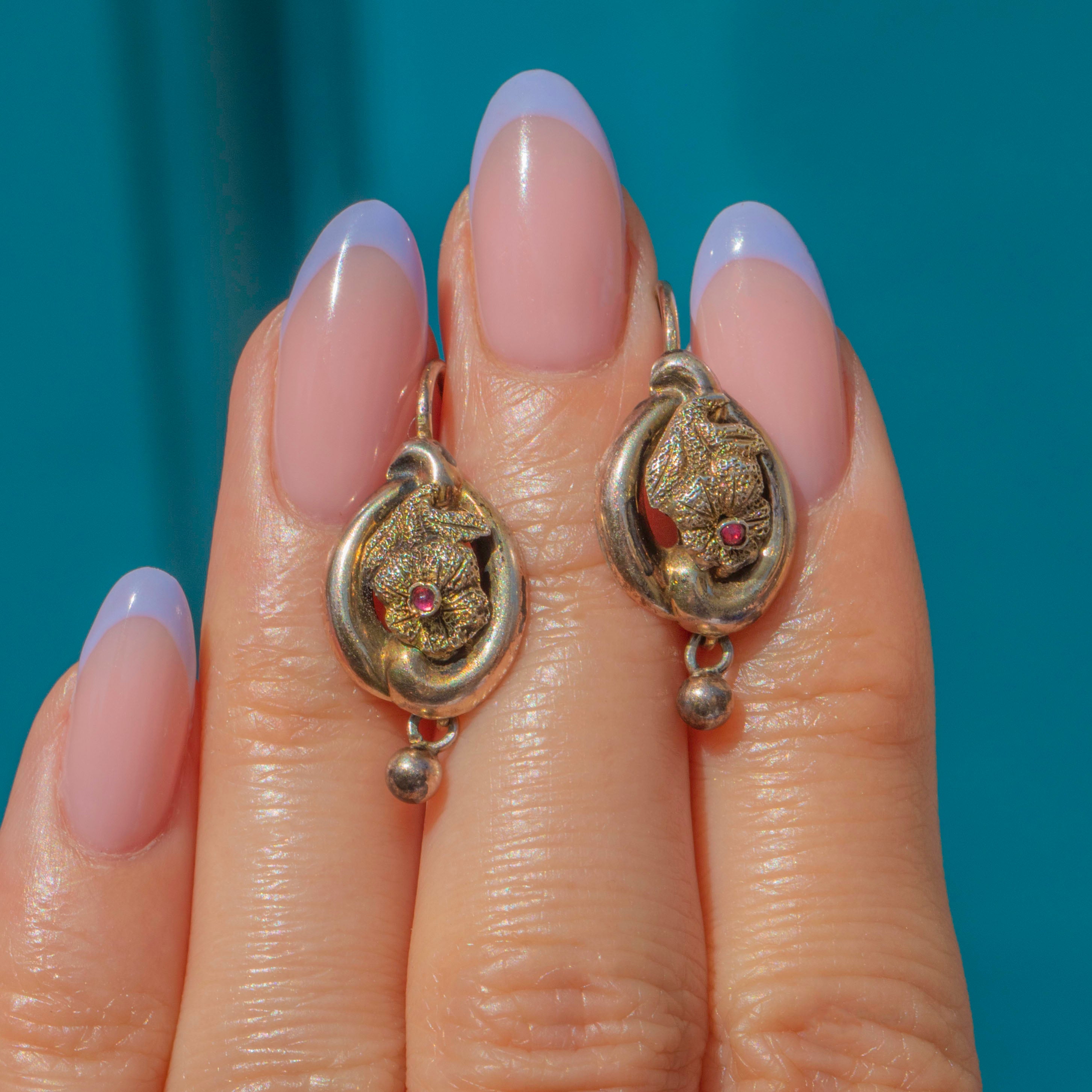 GOOD: These antique Silver Gilt floral lever-back earrings are in good condition. The earrings have held their form well, with no notable dings or major damage visible. The Gold gilding has worn down, showing the Silver in areas, which is to be expected with their grand age. The lever-backs function perfectly, so you can wear these Victorian earrings with utmost confidence!