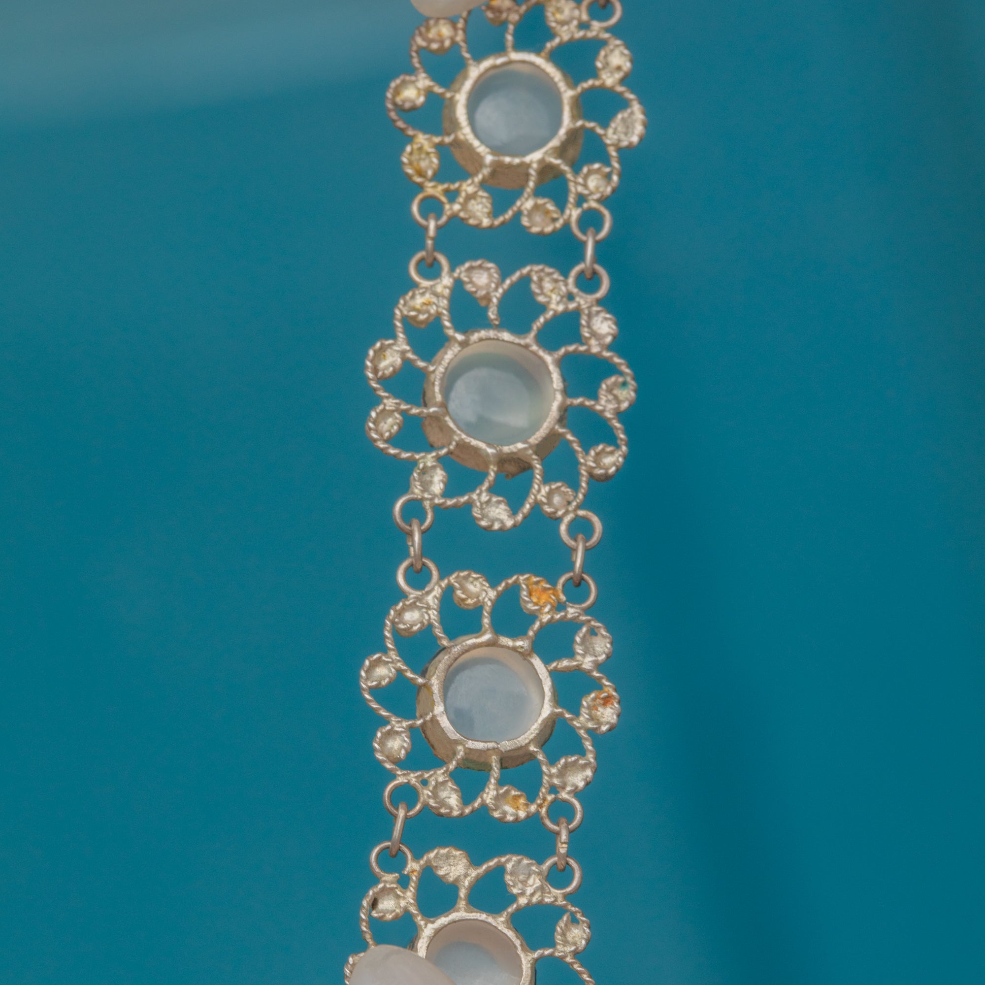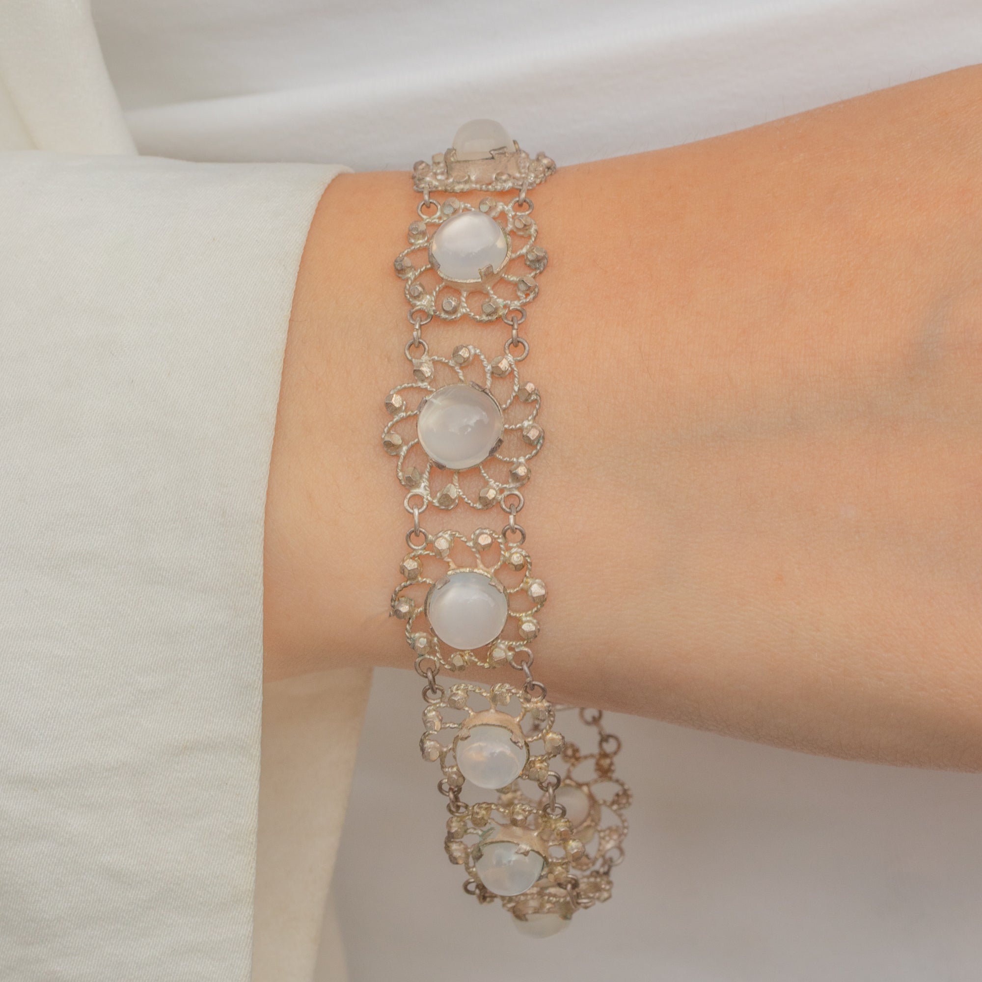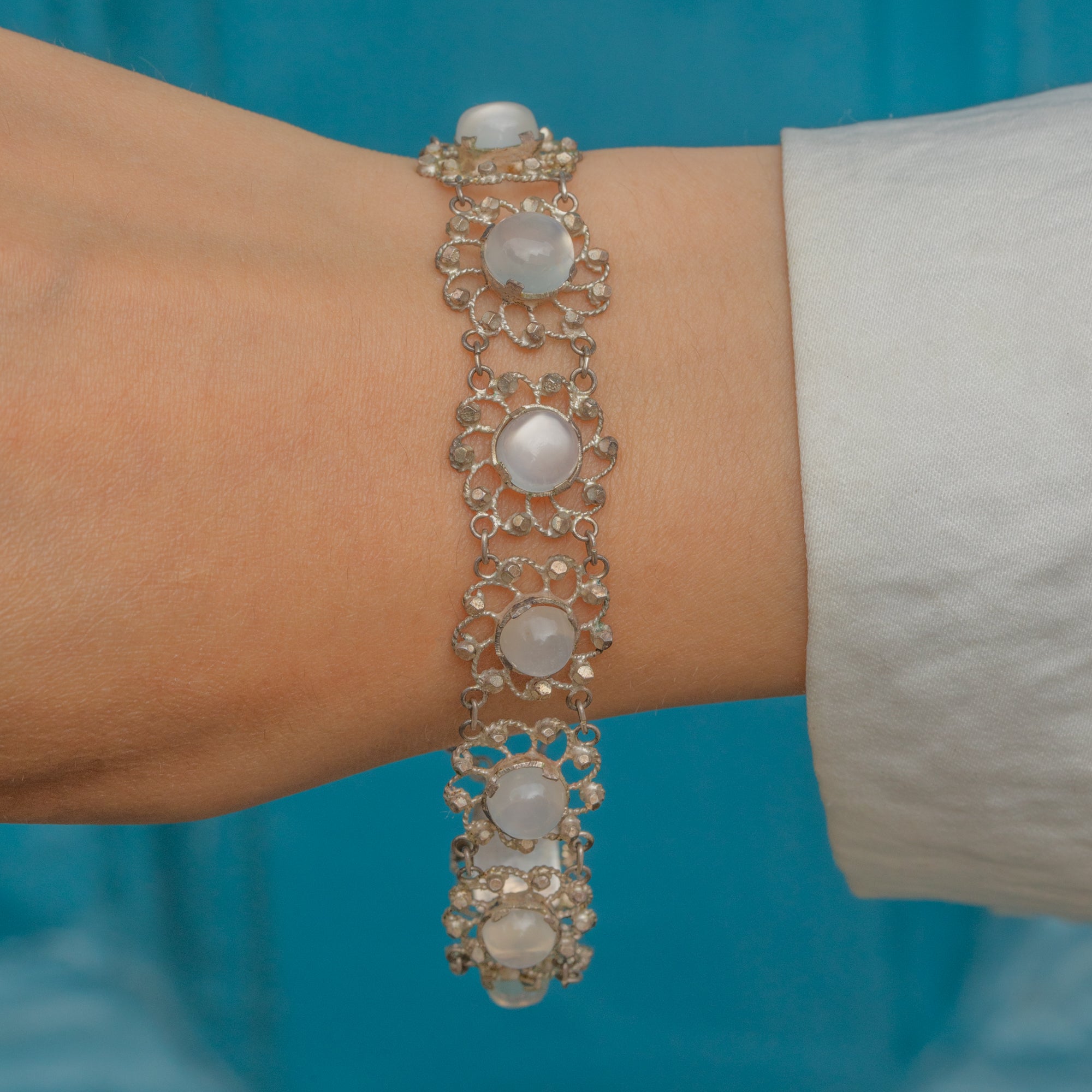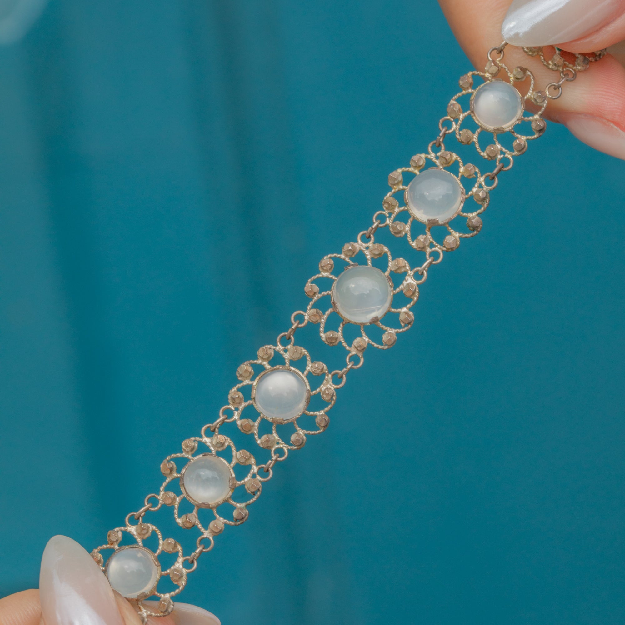 This antique bracelet is an enchanting treasure from the Arts & Crafts era! The smooth Moonstone cabochons shimmer with a distinct, silvery adularescence, each one displayed within intricate Silver cannetille swirls.