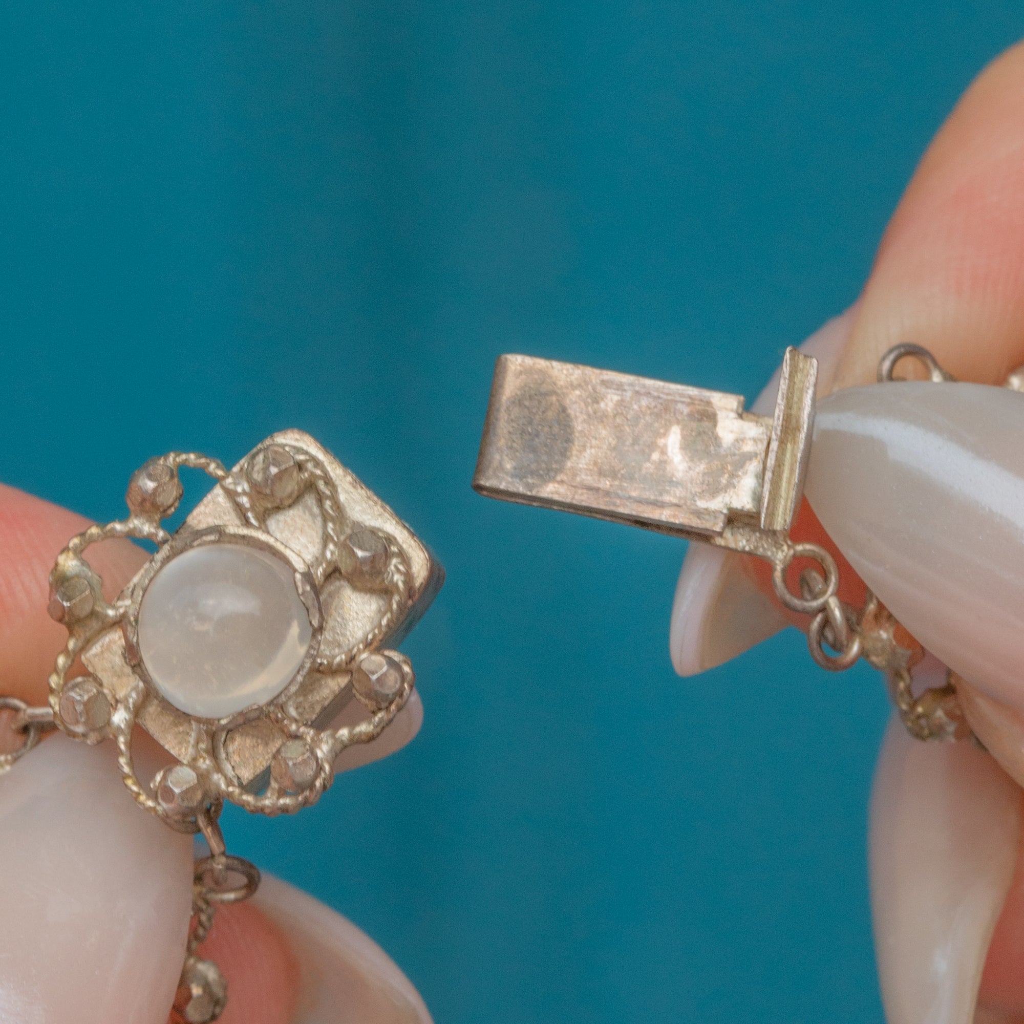 EXCELLENT: The Moonstones are smoothly domed, with no chips or scuffs, and are secure within their metal settings. The Silver cannetille details are all intact and securely soldered. The tongue clasp closes securely, so you can wear this antique Moonstone bracelet with utmost confidence!