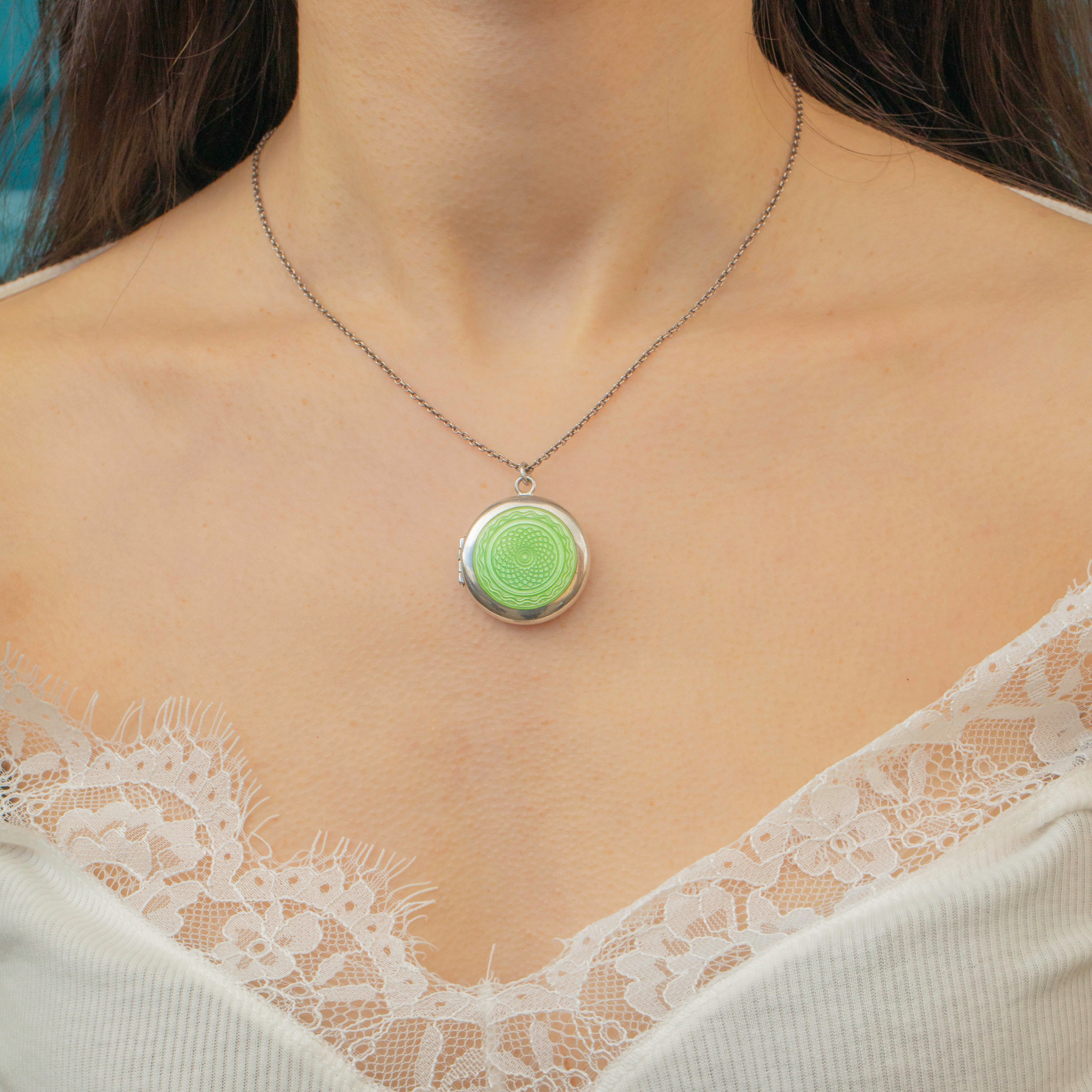 Crafted from glossy Silver, this Art Deco locket features a zesty lime green guilloché Enamel front with mesmerising spiral detailing, providing a lovely depth.