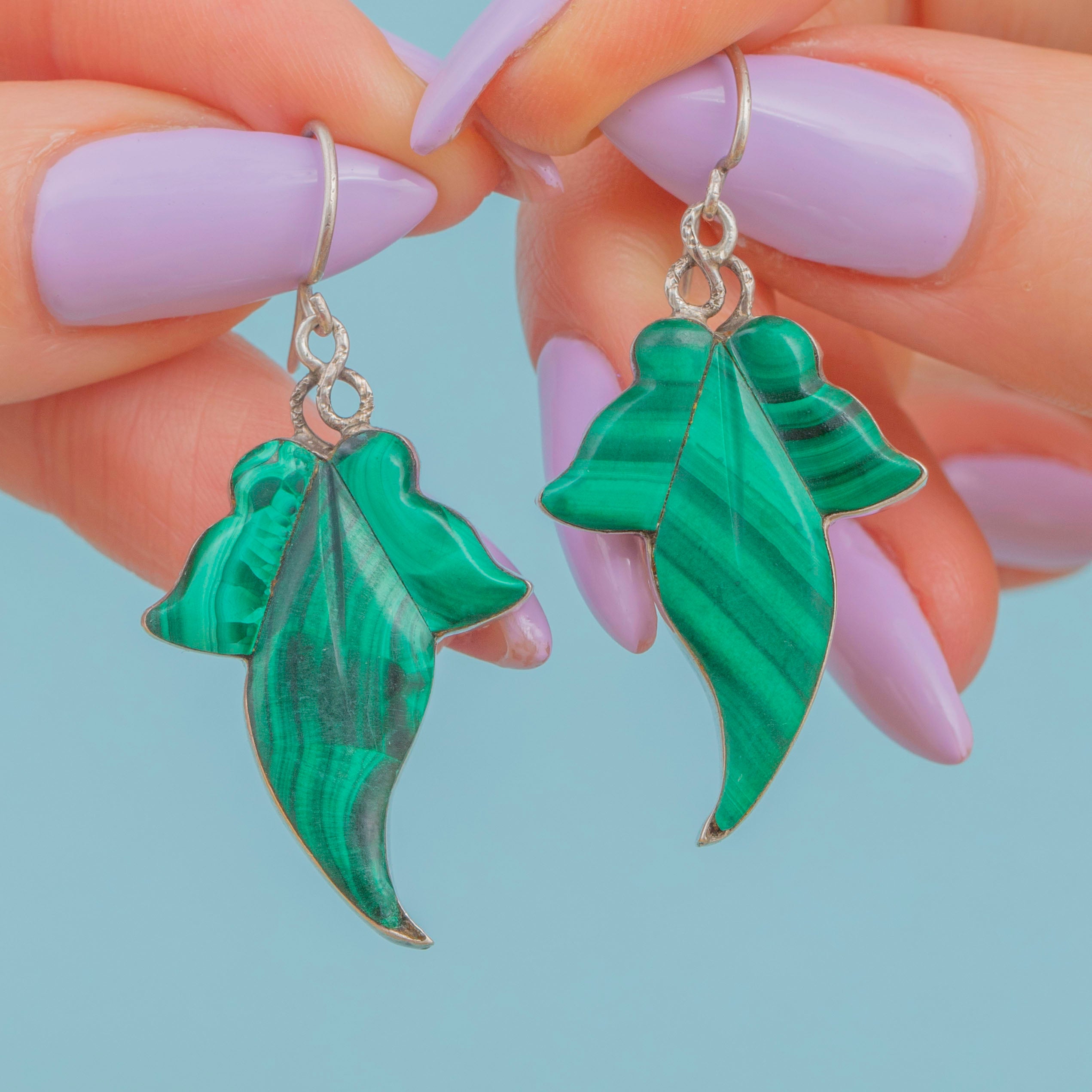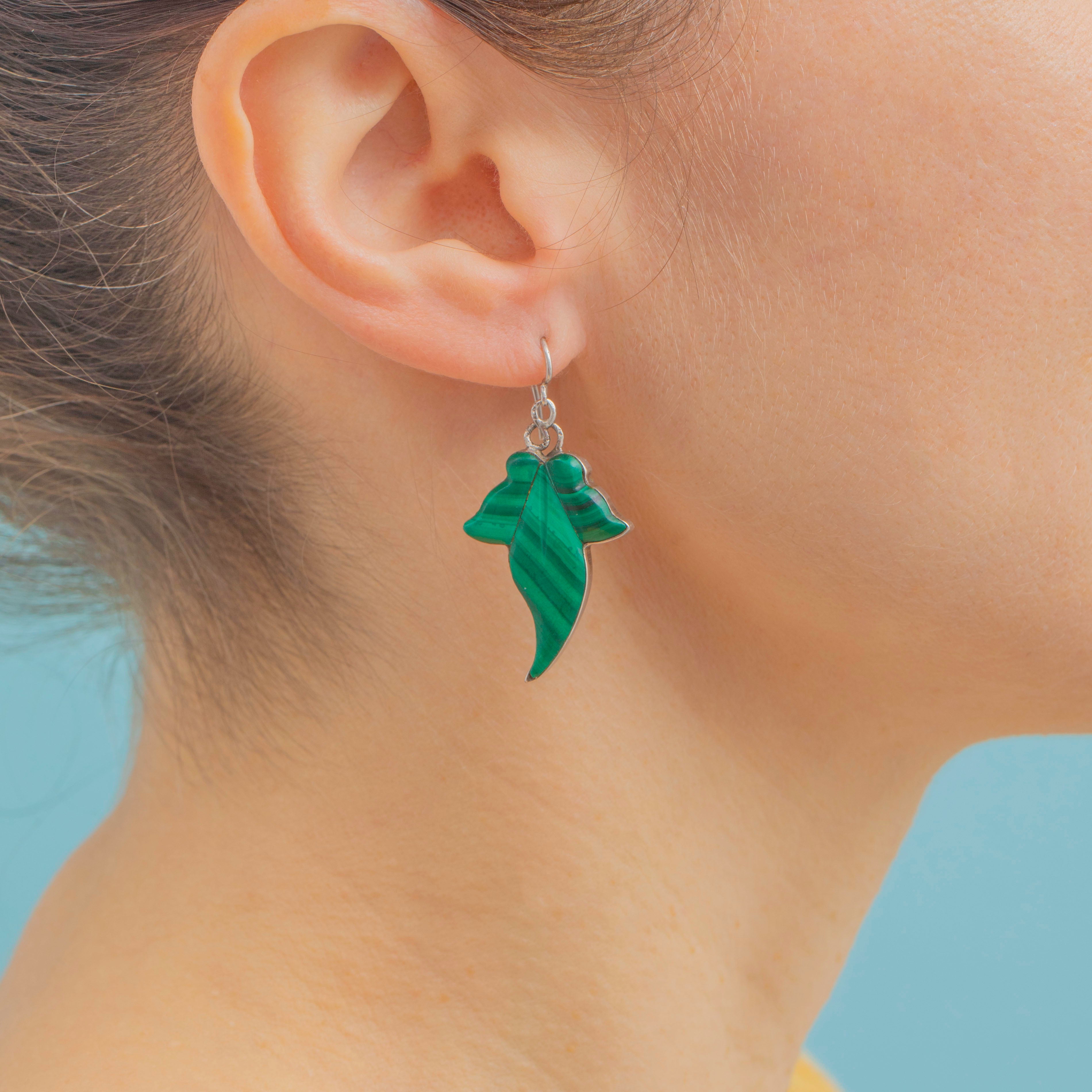 EXCELLENT. These antique Silver Malachite ivy leaf earrings are in wonderful condition throughout. The Malachite stones are snug in their settings, with no chips or scratches. The Silver has accrued a light patina, adding a distinctly antique feel to their overall aesthetic - we love!