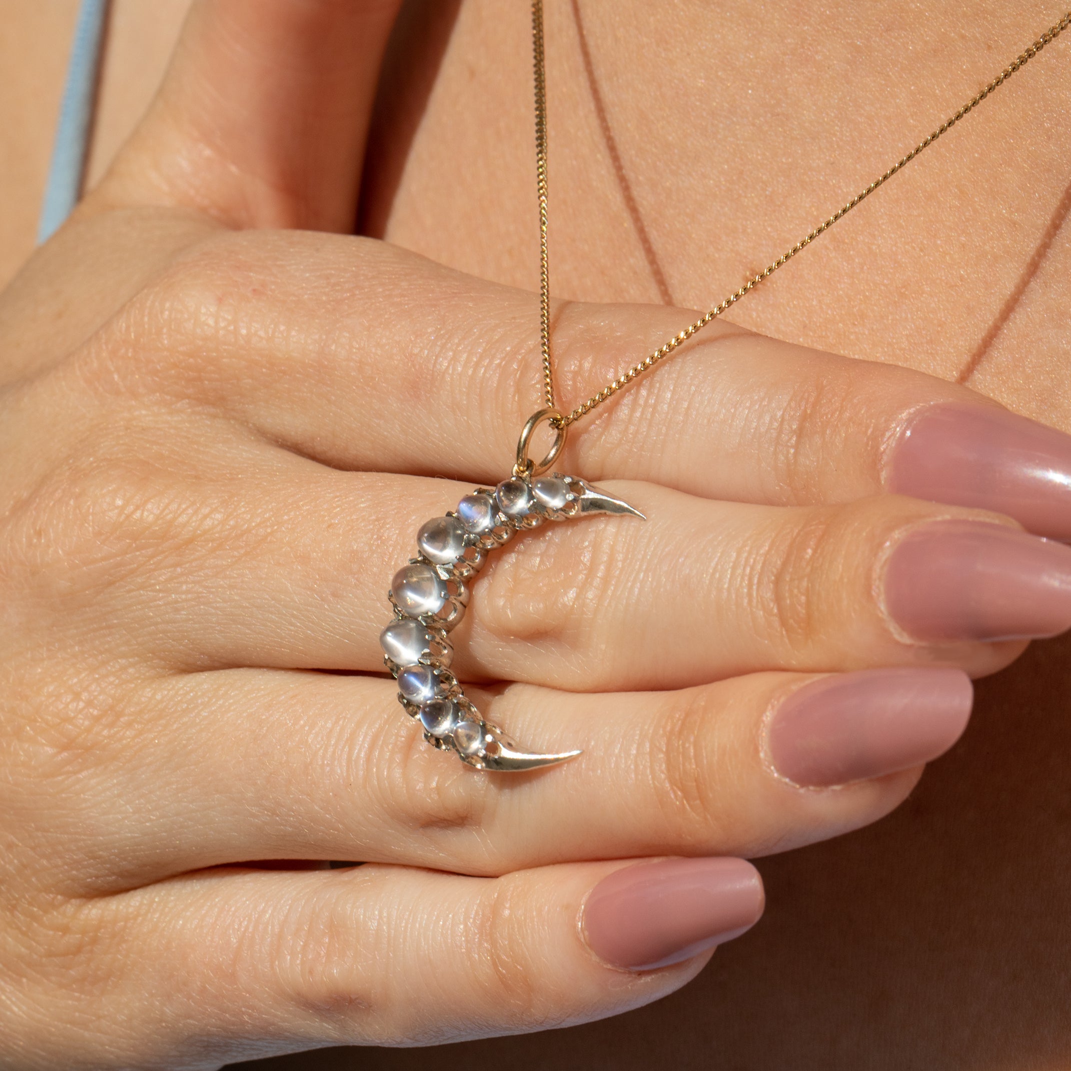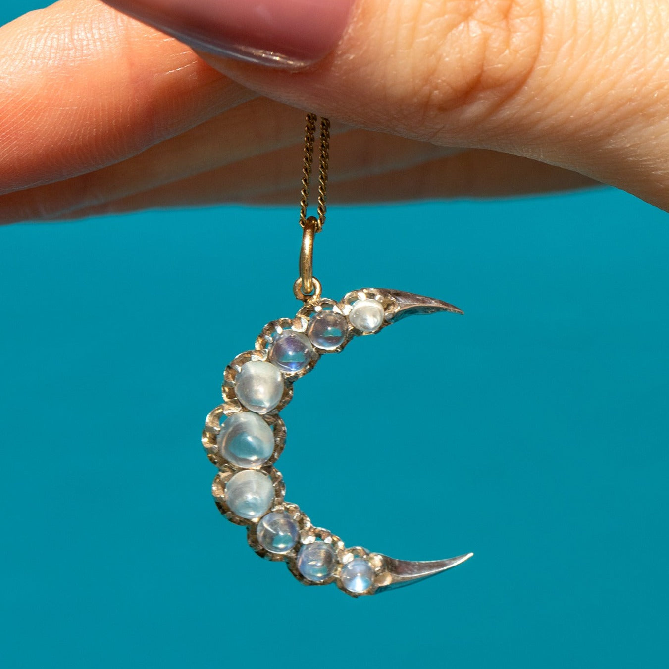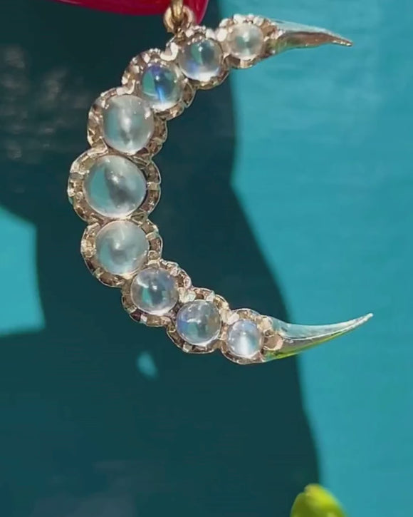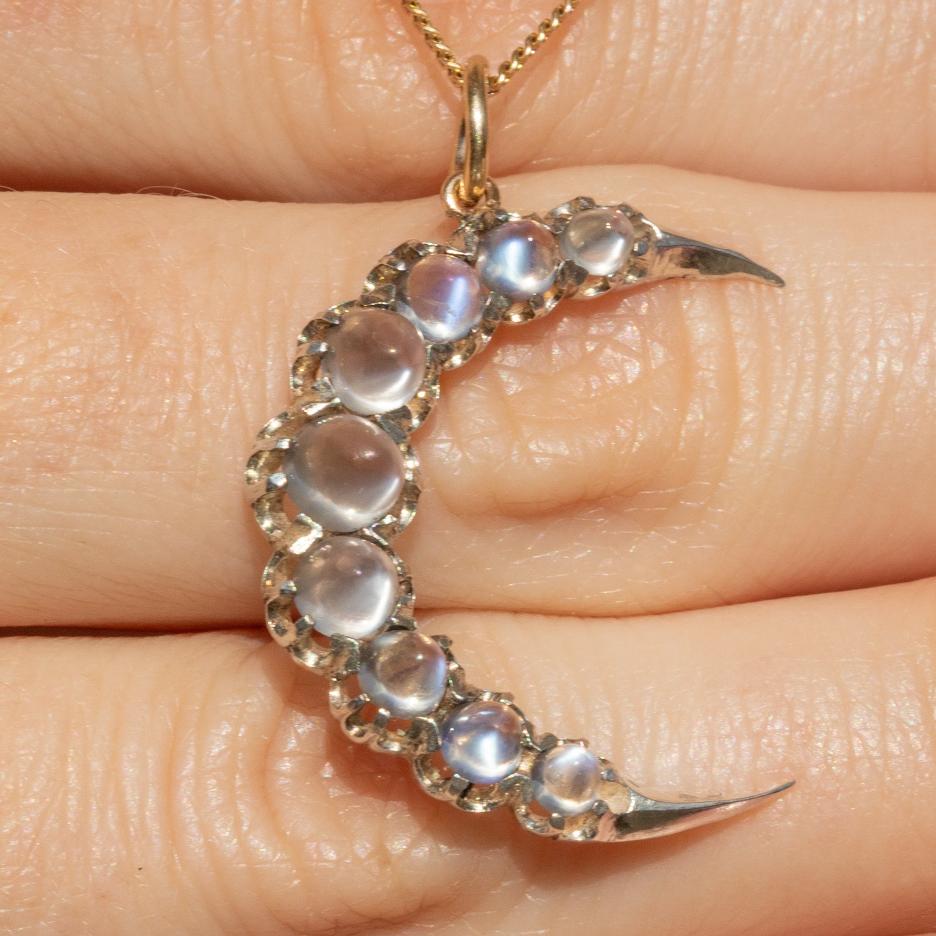Add a touch of whimsy to your day with his antique Silver Moonstone crescent pendant! Featuring nine beautiful Moonstone cabochons with a combined carat weight of 1.70ct, this Victorian pendant has the perfect ethereal glow.
