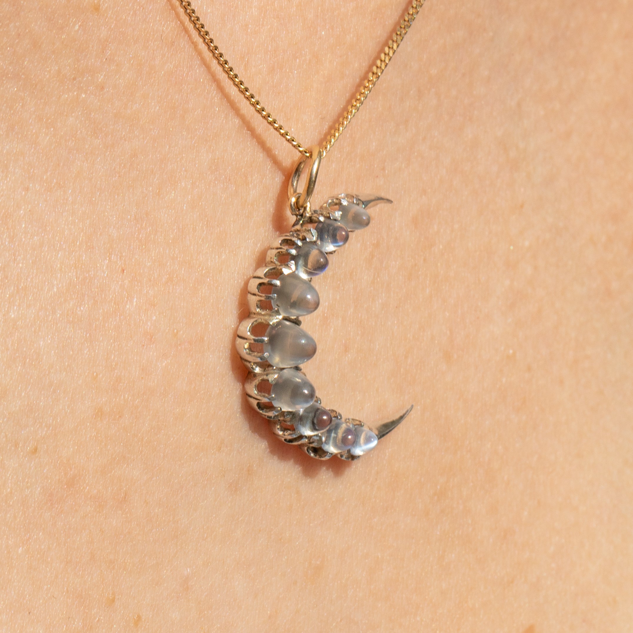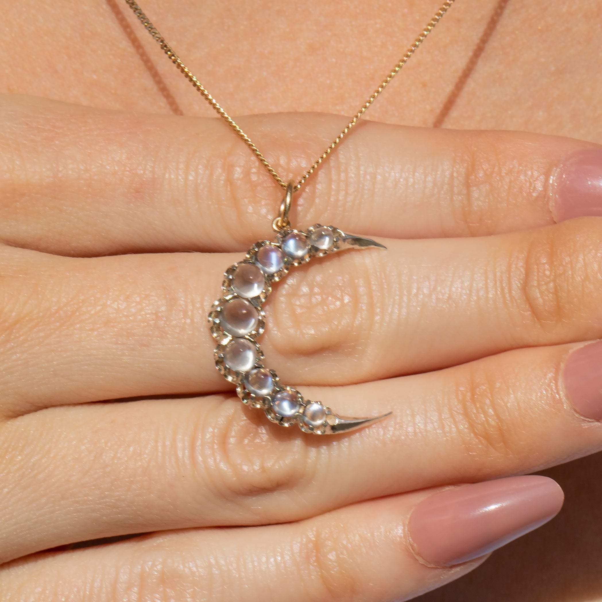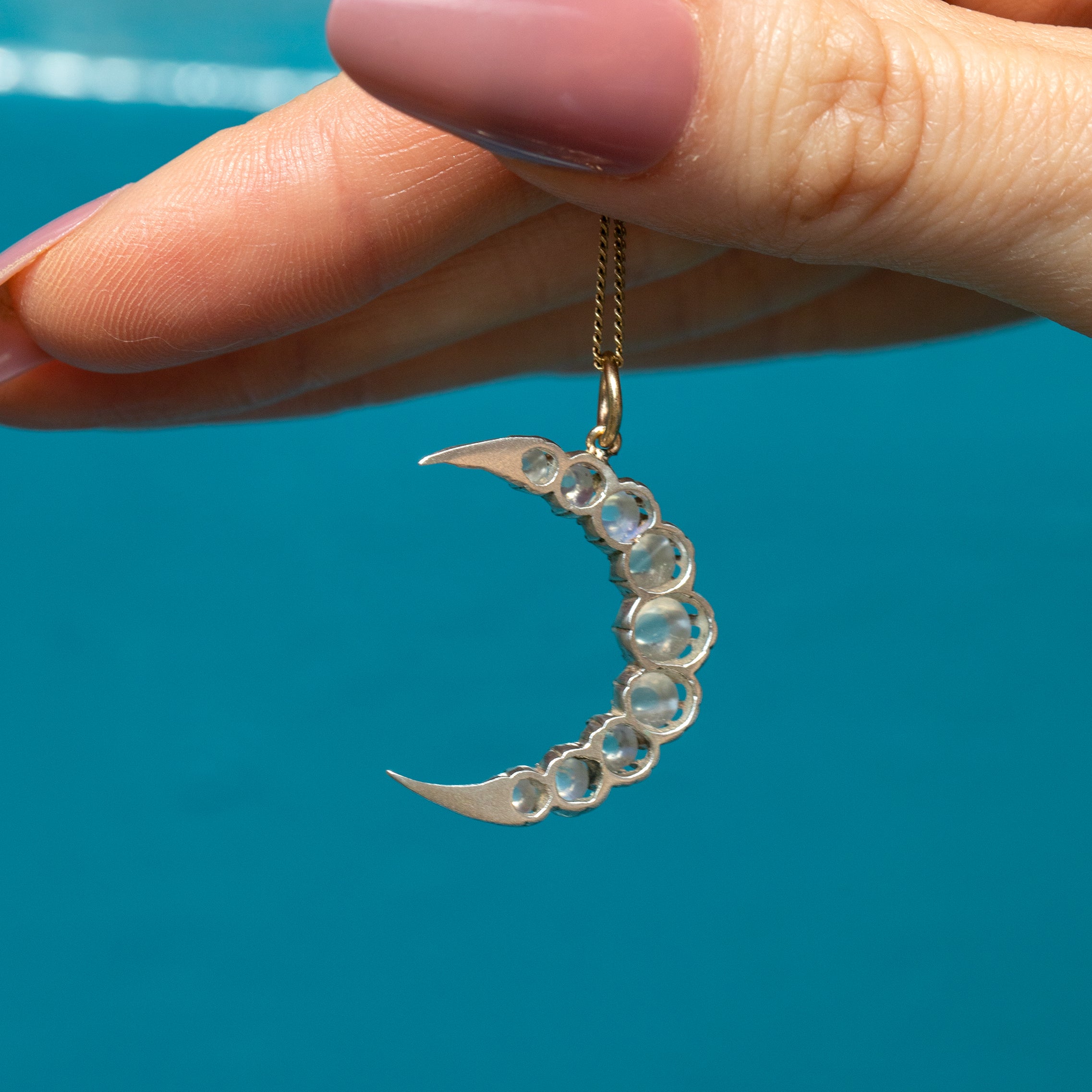 Add a touch of whimsy to your day with his antique Silver Moonstone crescent pendant! Featuring nine beautiful Moonstone cabochons with a combined carat weight of 1.70ct, this Victorian pendant has the perfect ethereal glow.